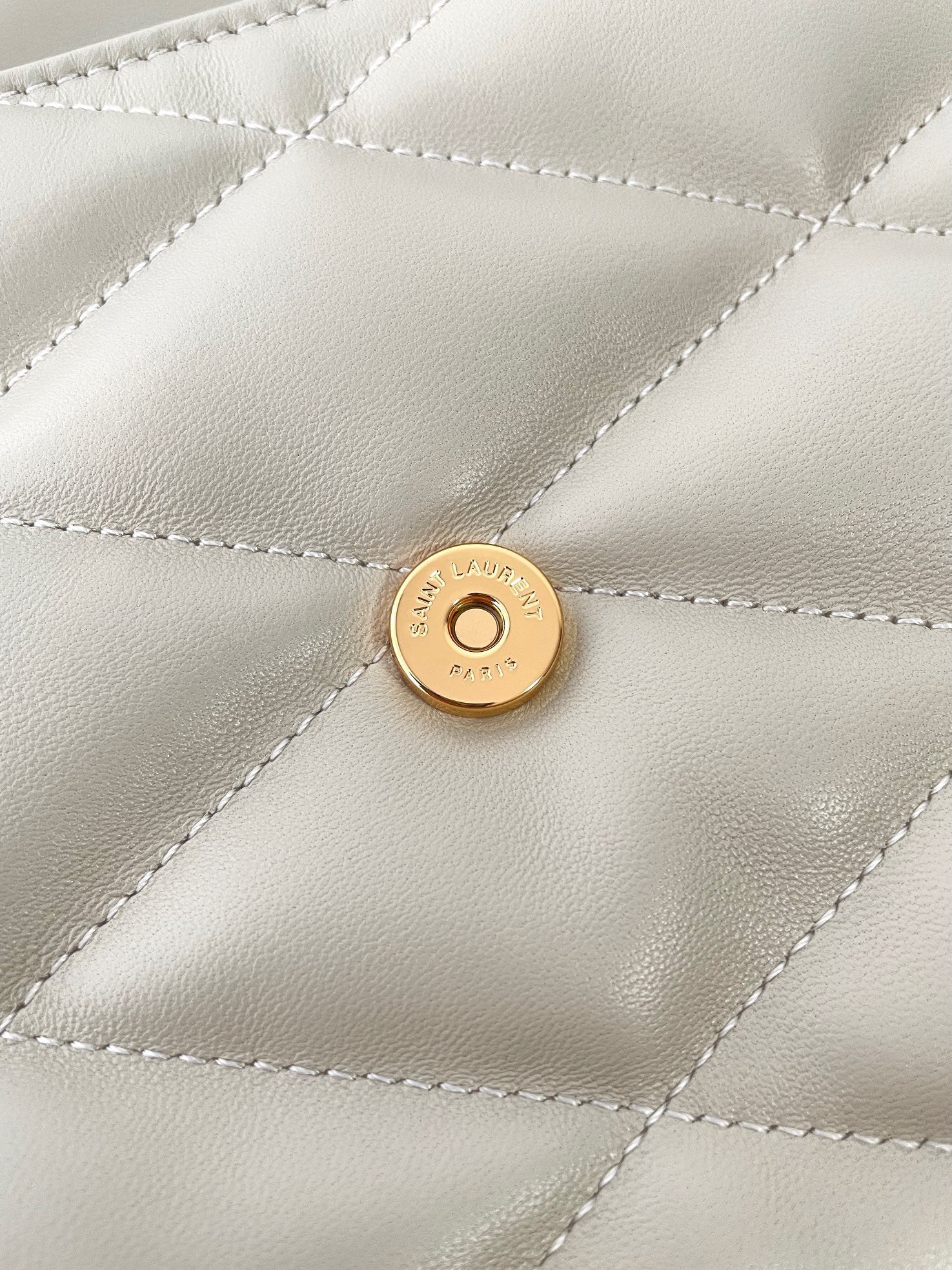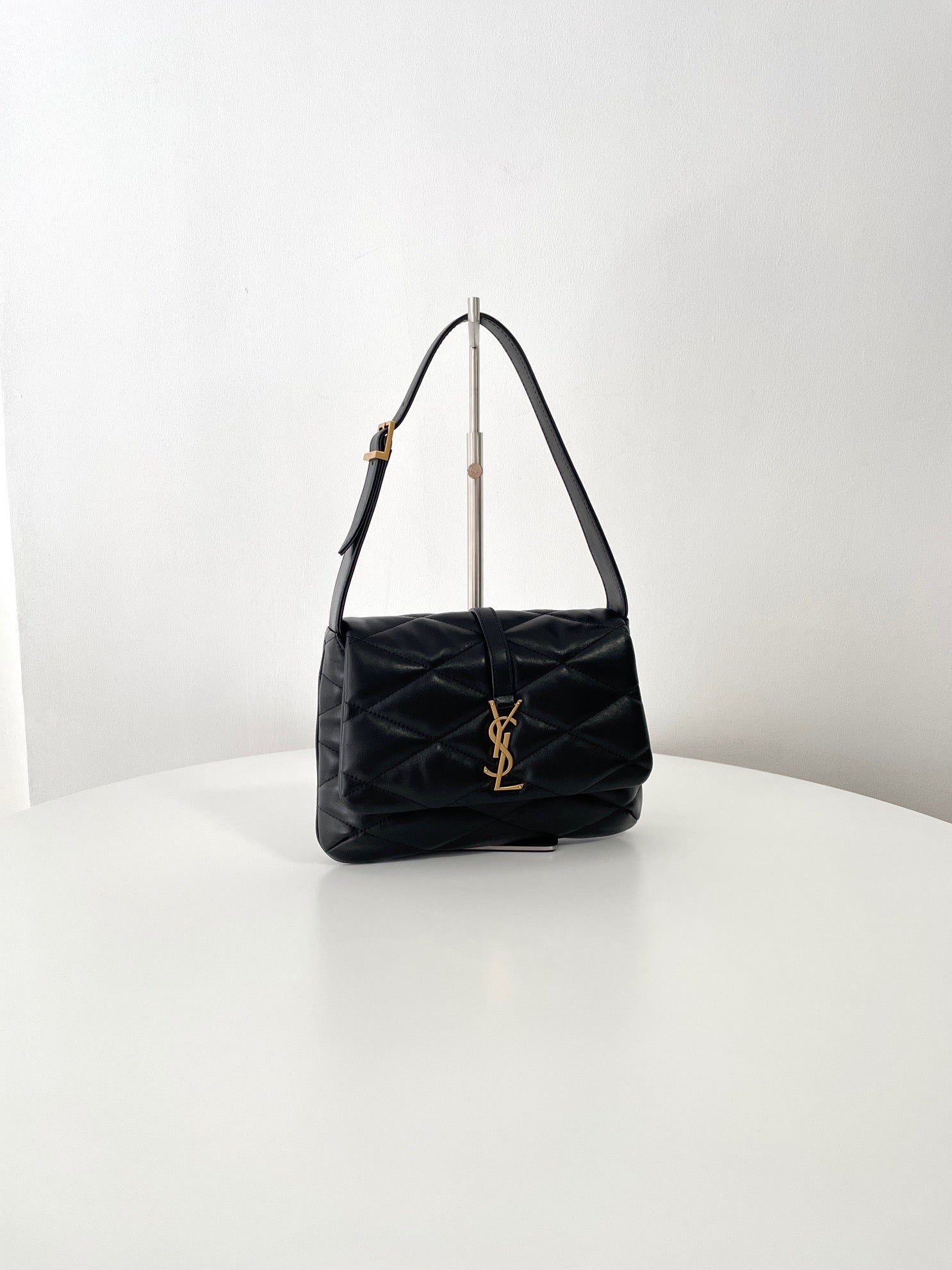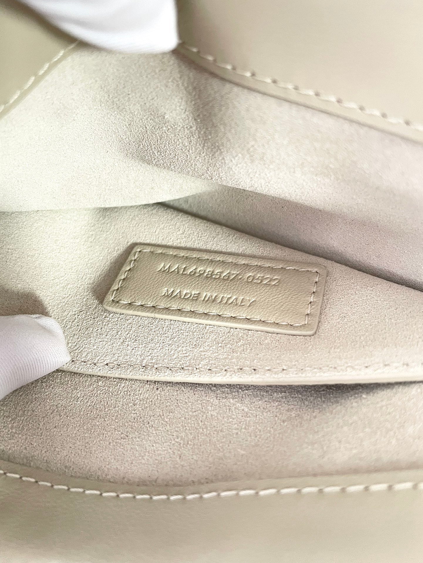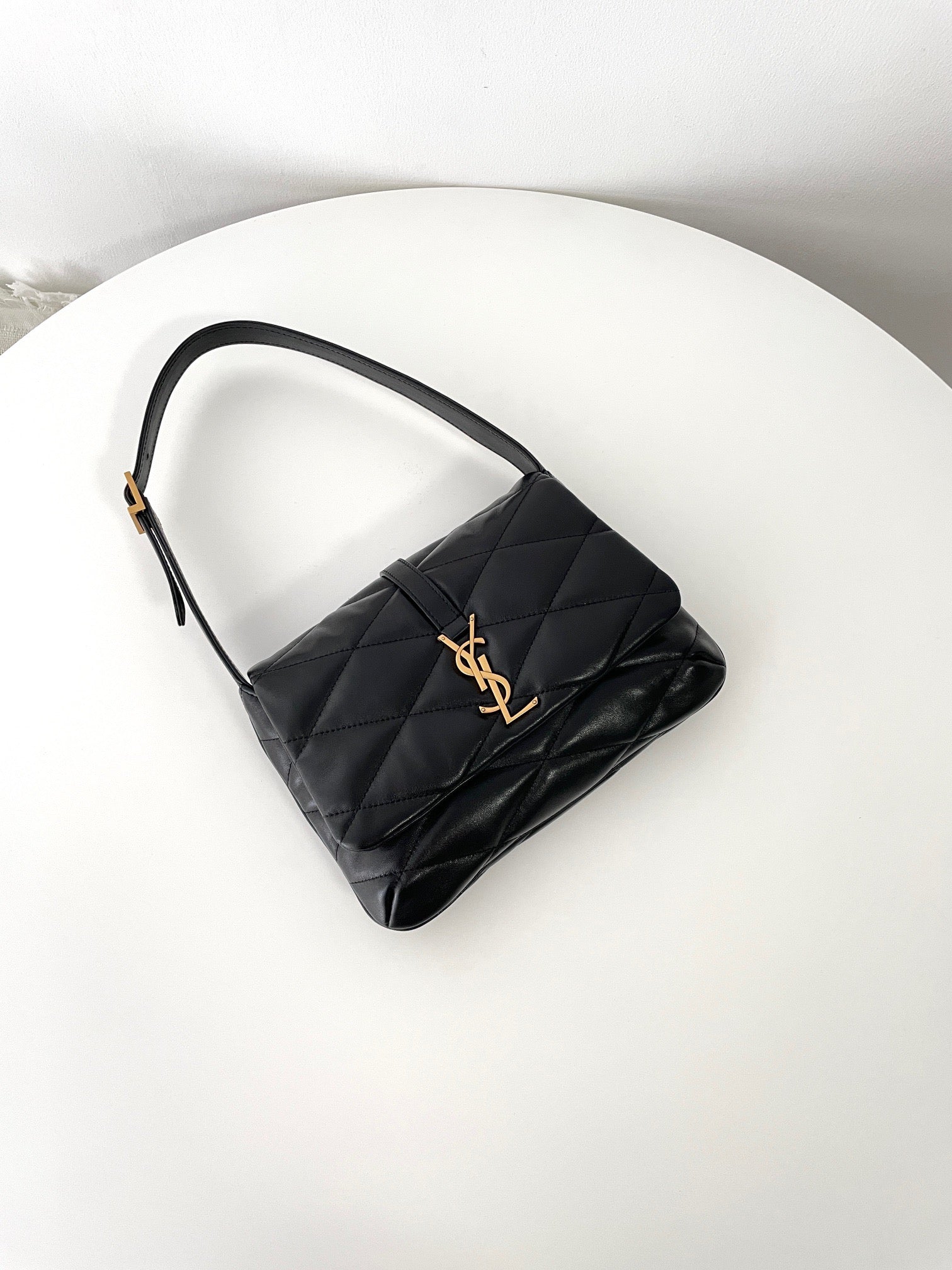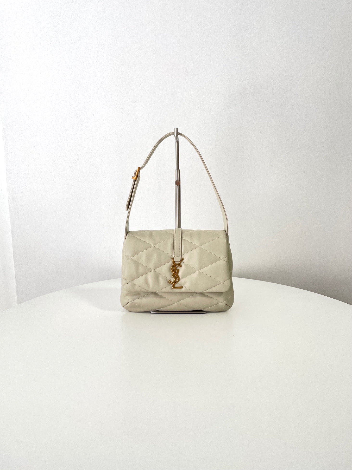 특징: 수직 퀼팅, YSL 로고, 플랩 마그네틱 클로저, 내부 포켓, 조절 가능한 스트랩