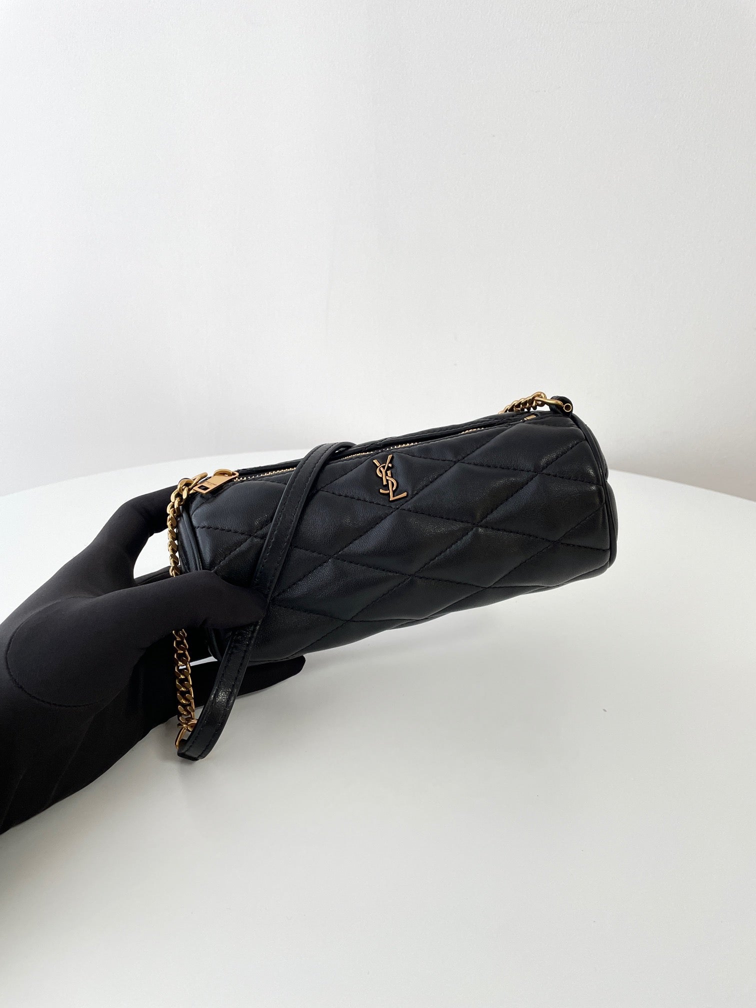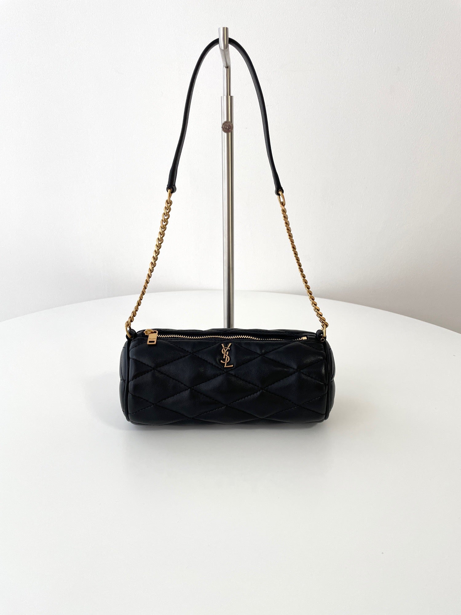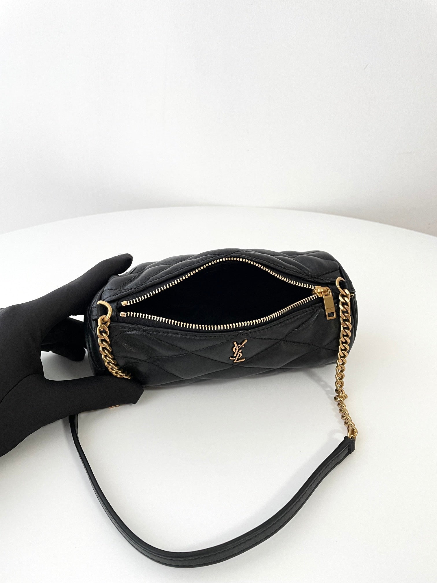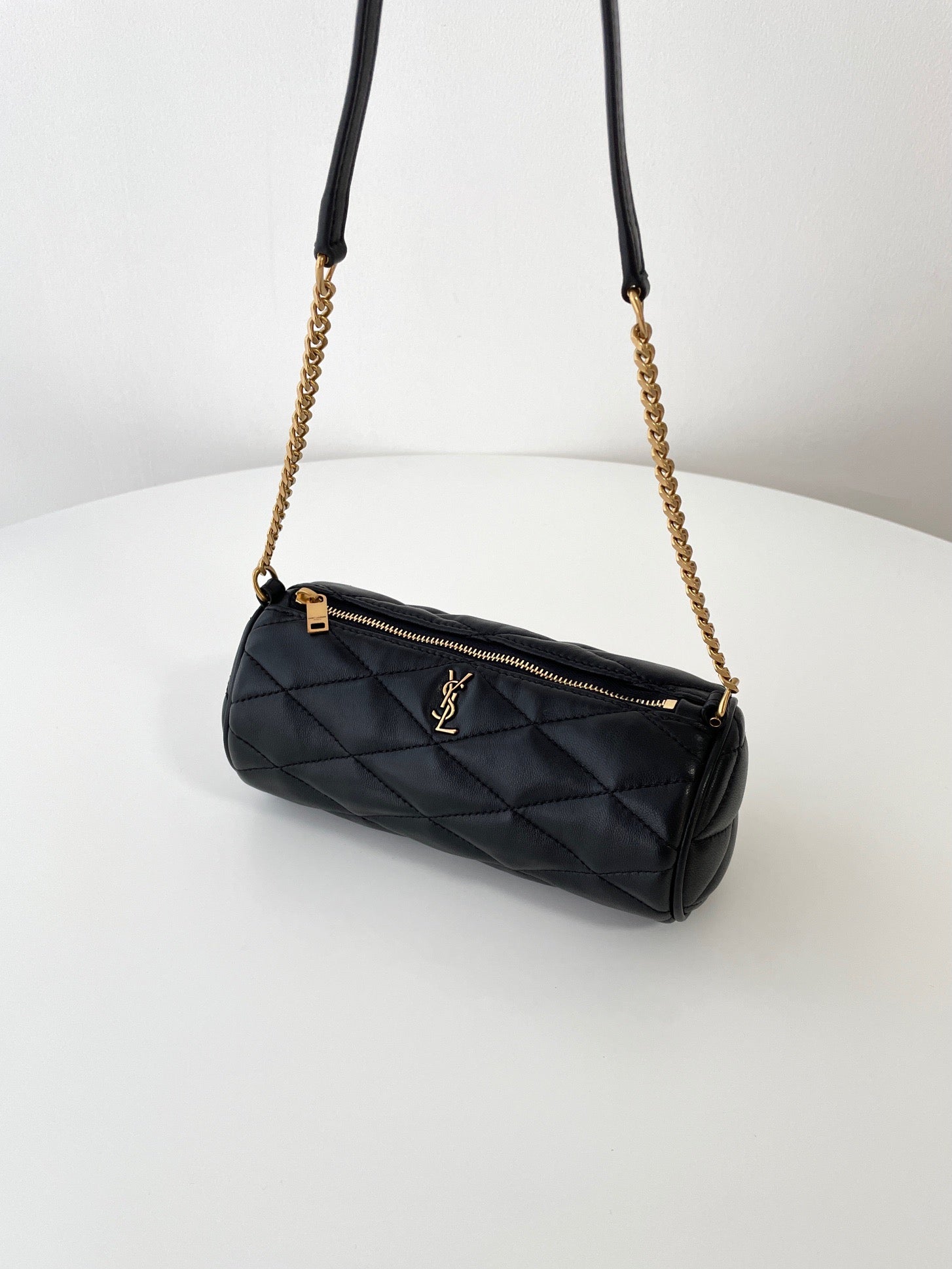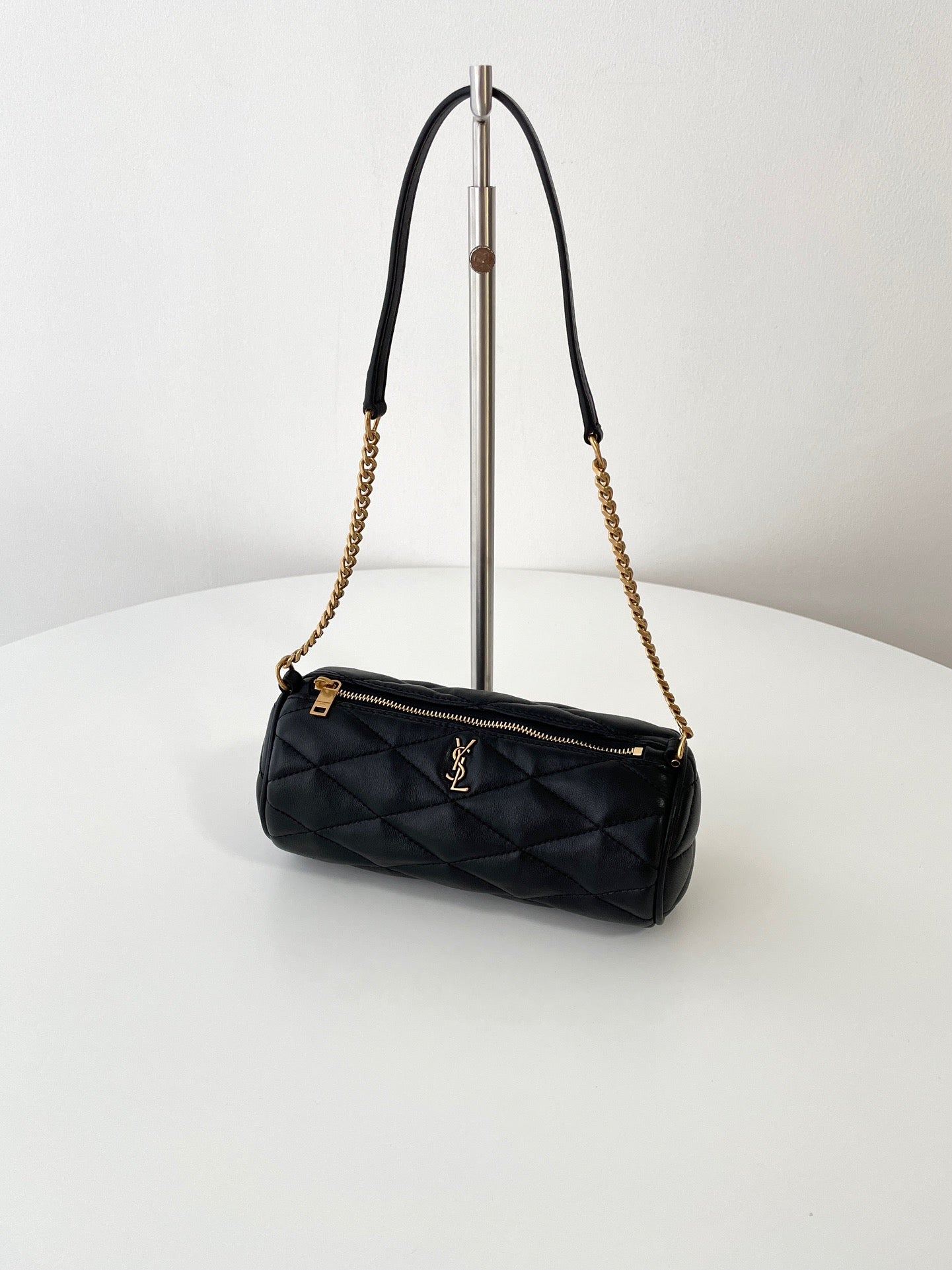 튜브형 구조에 퀼팅 램스킨과 YSL 로고 디테일이 결합되어 독특하면서도 고급스러운 인상을 줍니다.