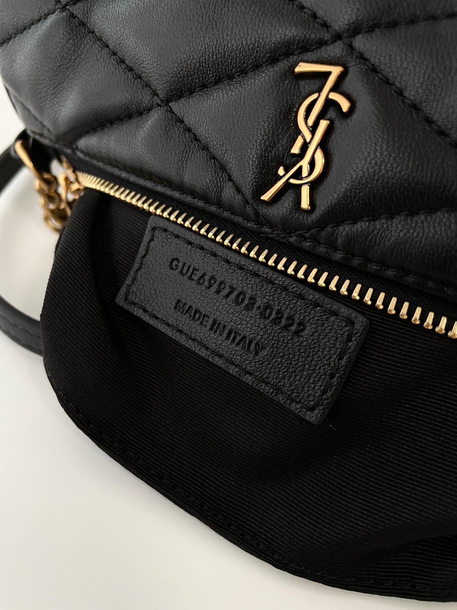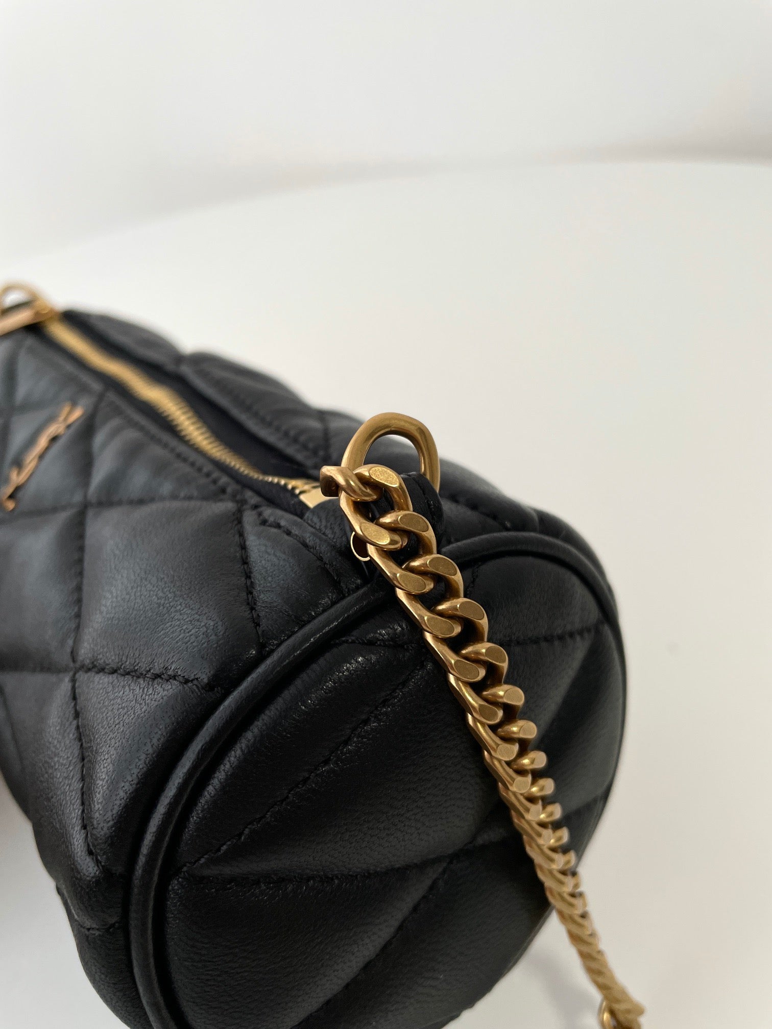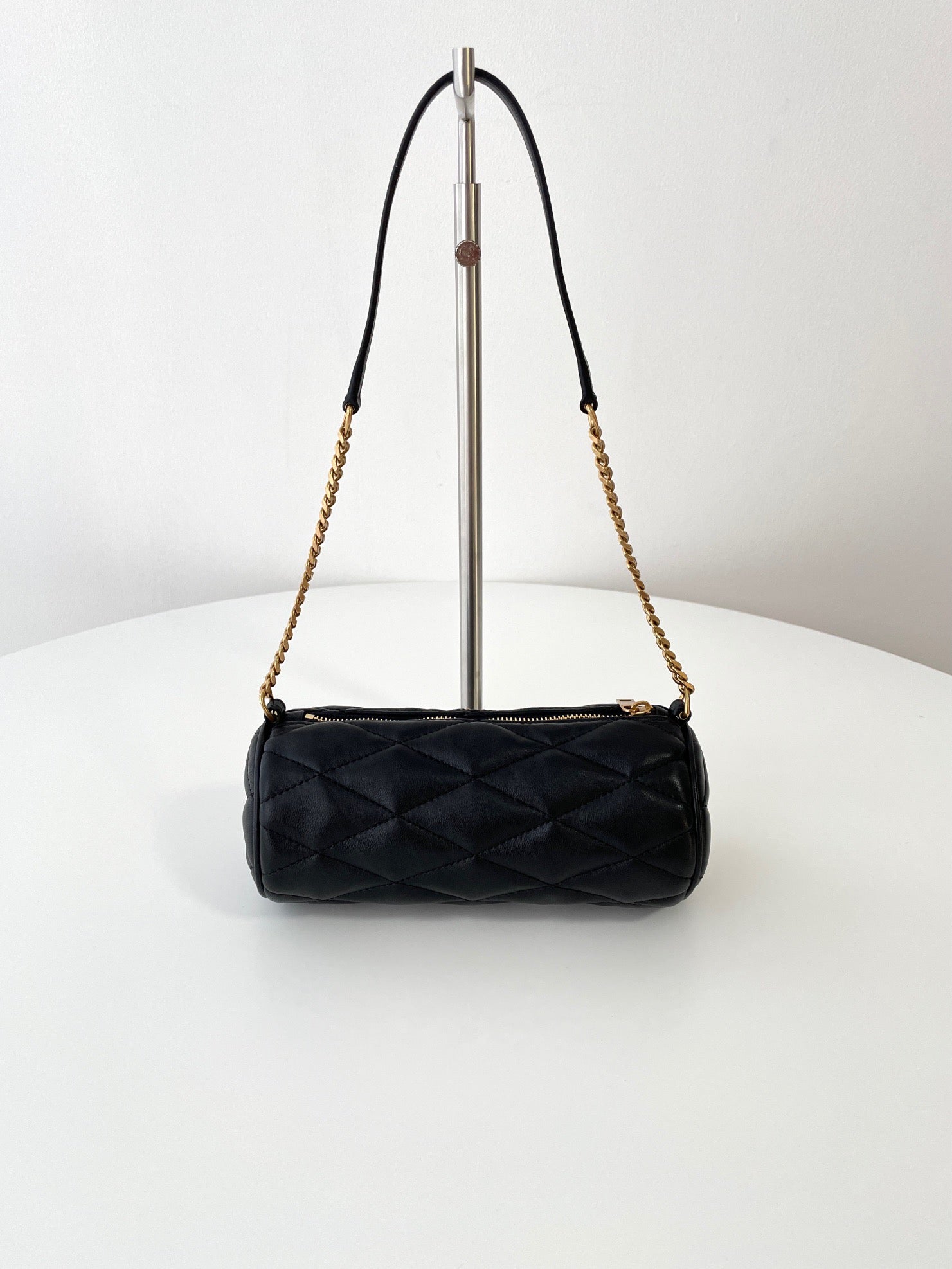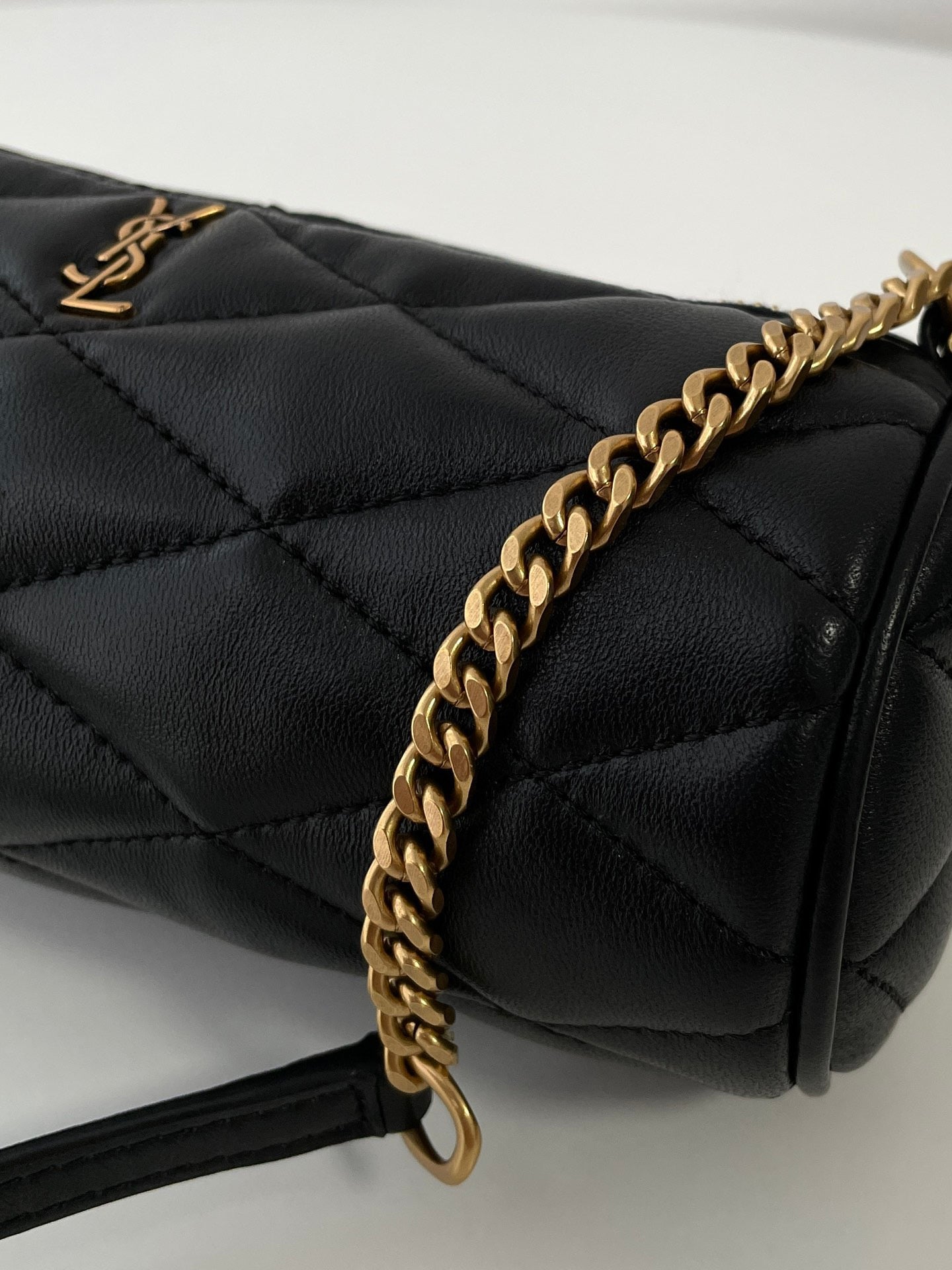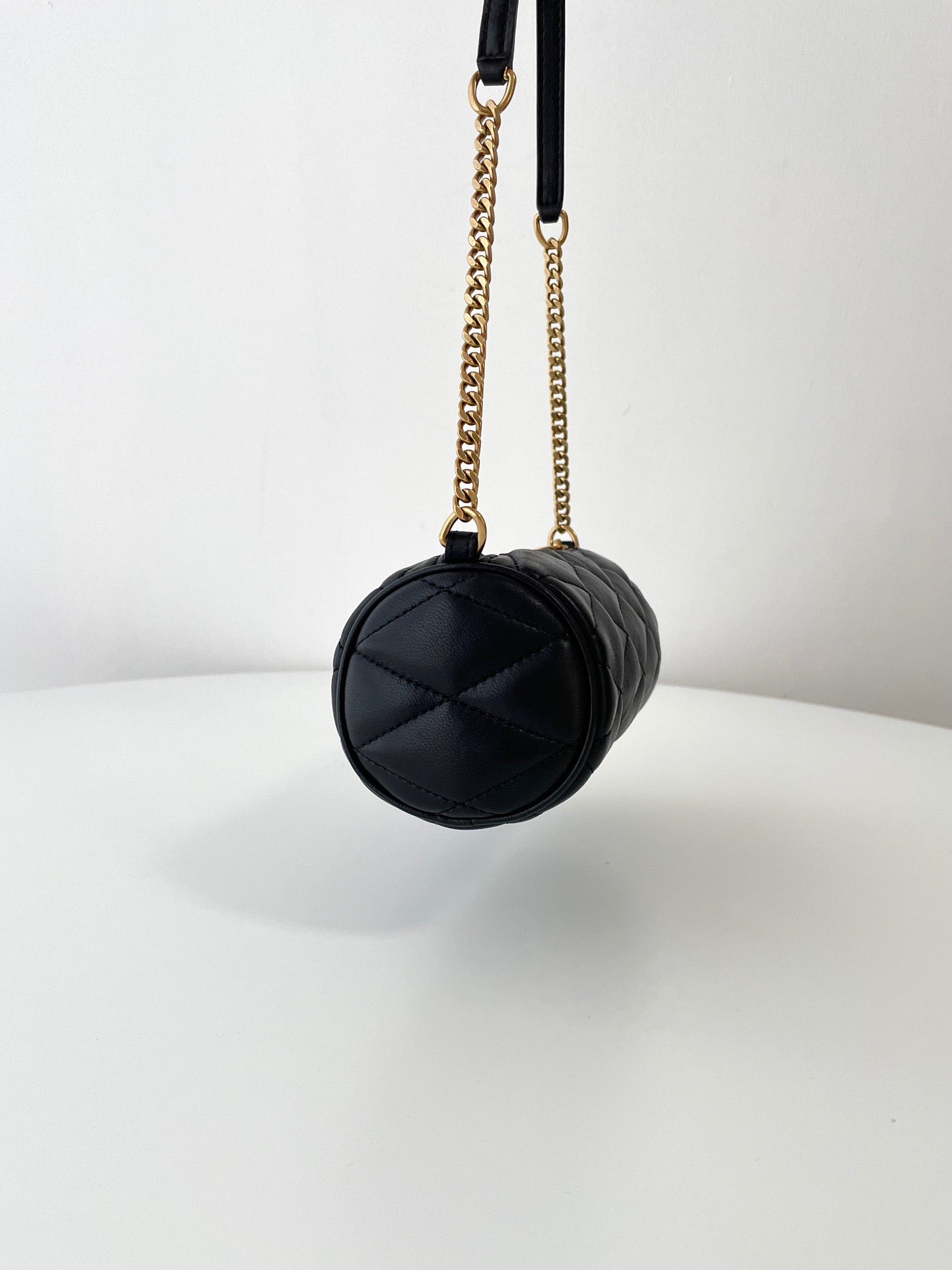 튜브형 구조에 퀼팅 램스킨과 YSL 로고 디테일이 결합되어 독특하면서도 고급스러운 인상을 줍니다.