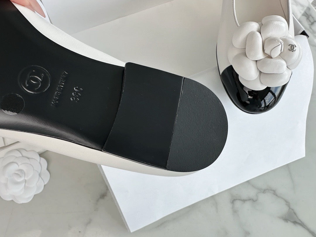 이 제품은 부드러운 가죽 또는 트위드 소재 위에 수공예로 완성된 까멜리아 장식이 얹어진 디자인이 특징입니다. 둥근 앞코와 낮은 굽, 섬세한 곡선 실루엣이 발의 라인을 아름답게 연출해주며, 샤넬 특유의 페미닌한 감성을 표현합니다.