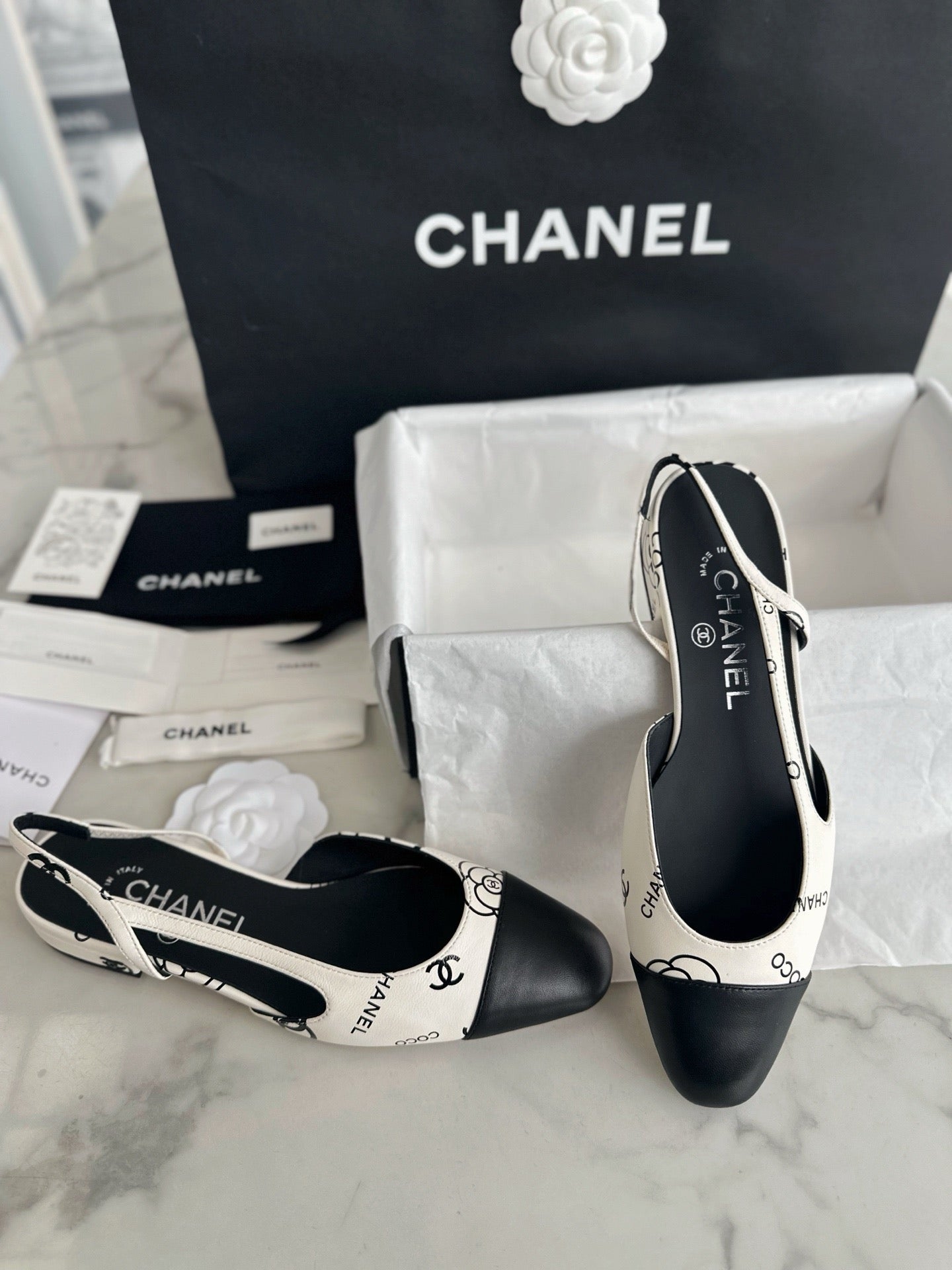 이 슬링백 슈즈는 샤넬의 상징인 로고가 전체에 패턴으로 적용되어 독특하면서도 로맨틱한 분위기를 자아냅니다. 브랜드의 정체성을 강조하며, 부드러운 곡선의 실루엣과 섬세한 마감 처리가 고급스러움을 더합니다.