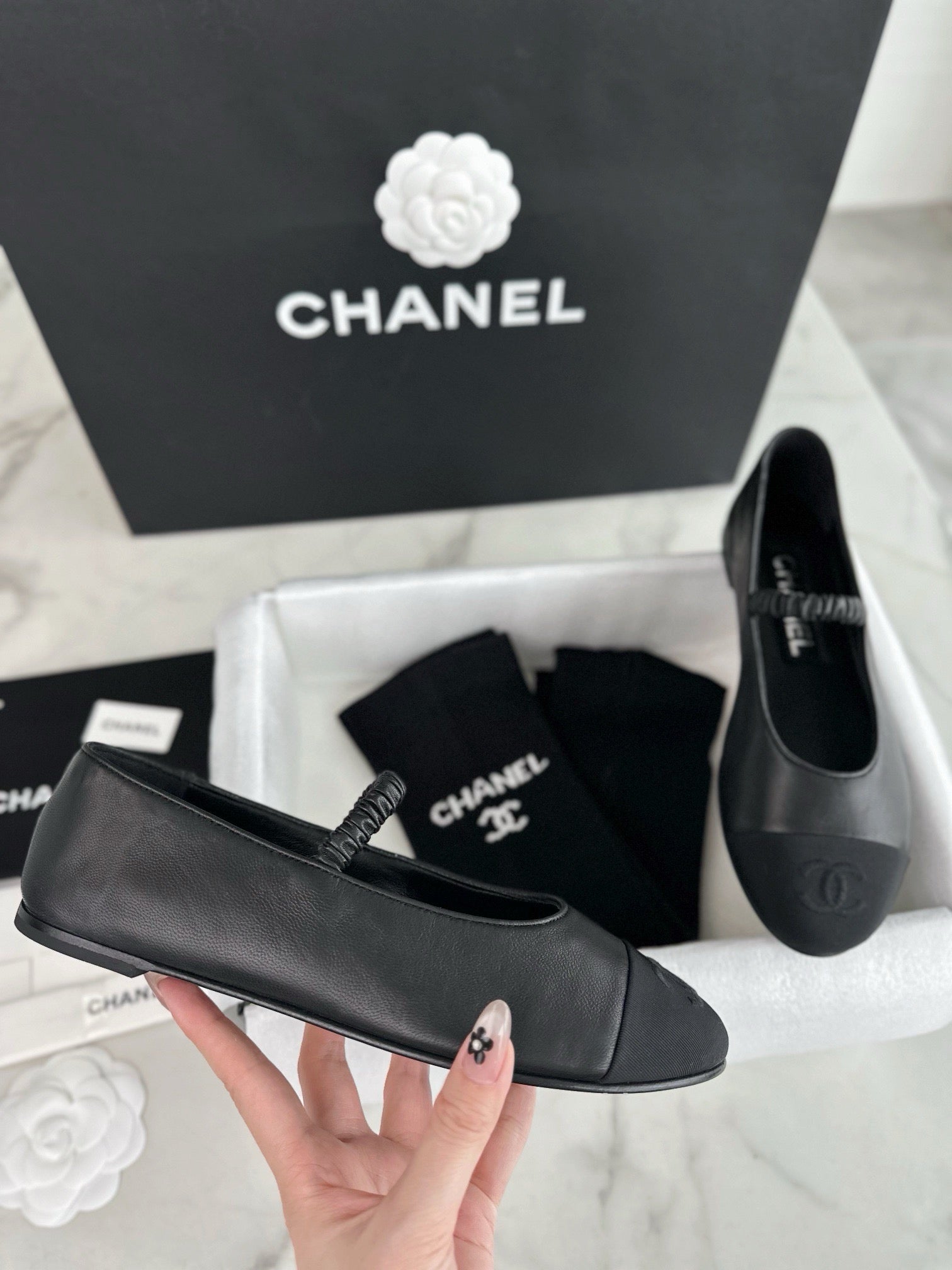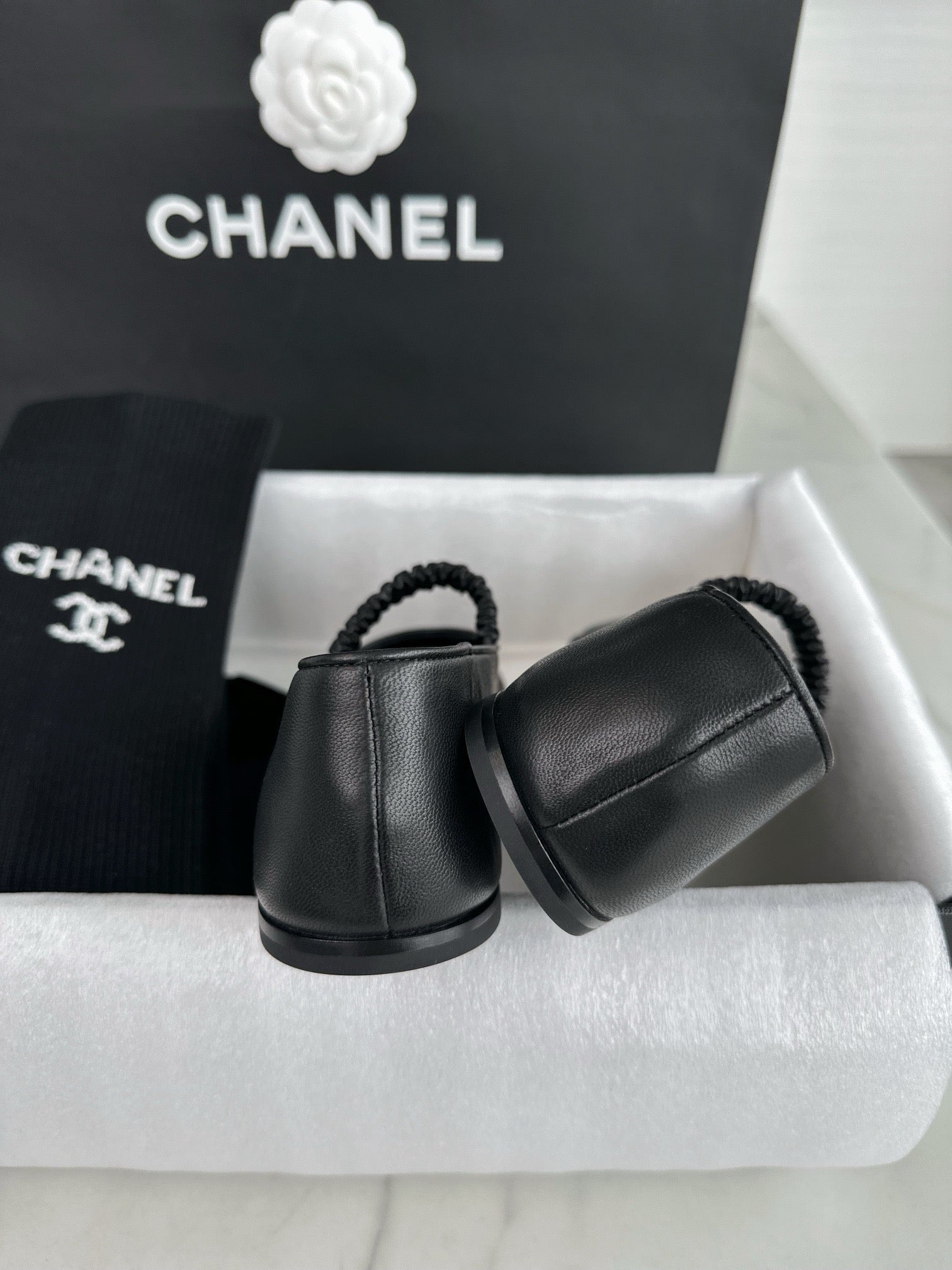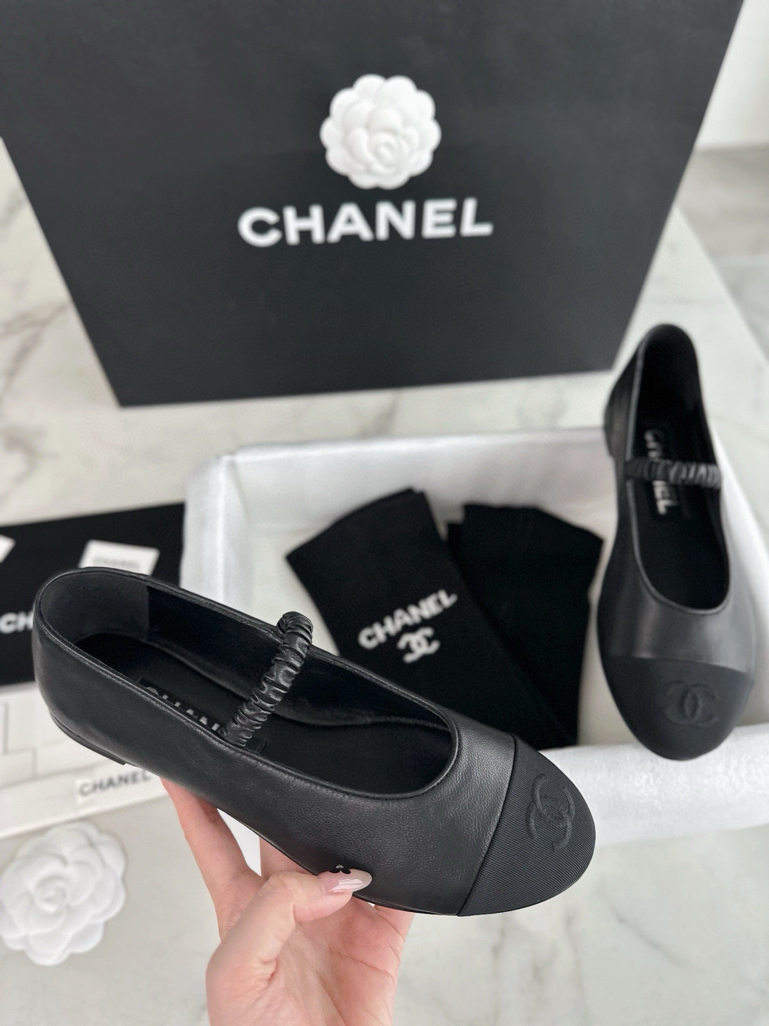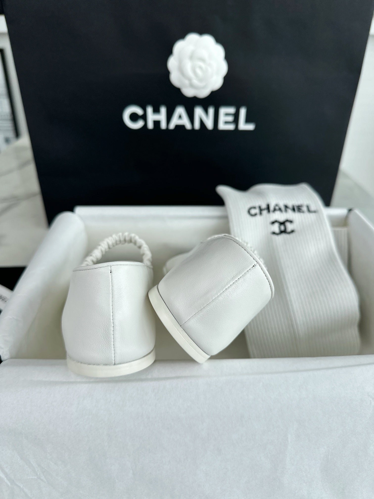 부드러운 가죽 소재의 클래식 메리제인 플랫에 니트 레그워머가 더해진 구성으로, 계절감을 고려한 트렌디한 스타일링이 가능합니다. 발등의 스트랩 디테일과 둥근 앞코 라인은 여성스럽고 단정한 무드를 연출하며, 샤넬 로고 디테일로 고급스러움을 더했습니다.