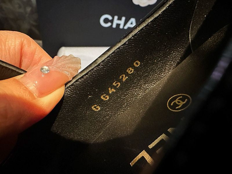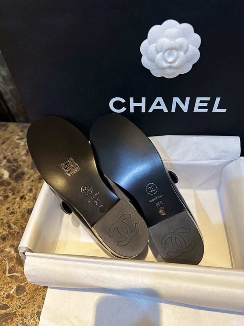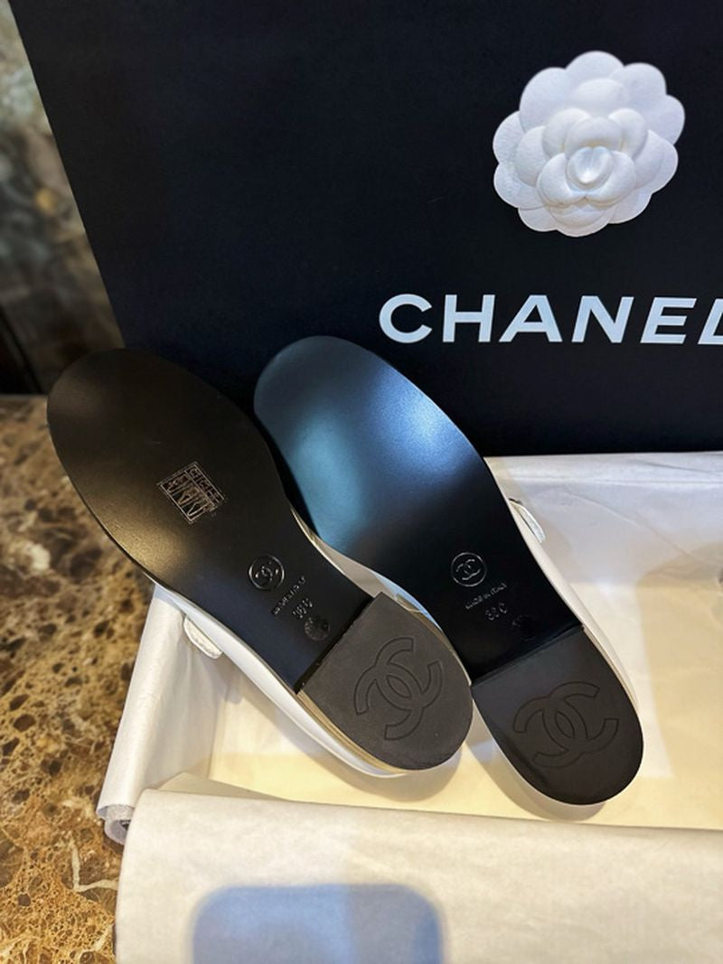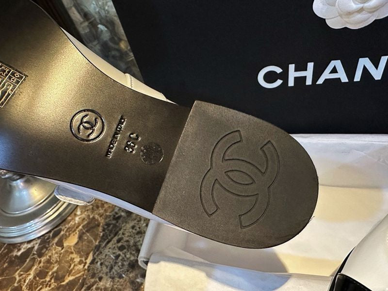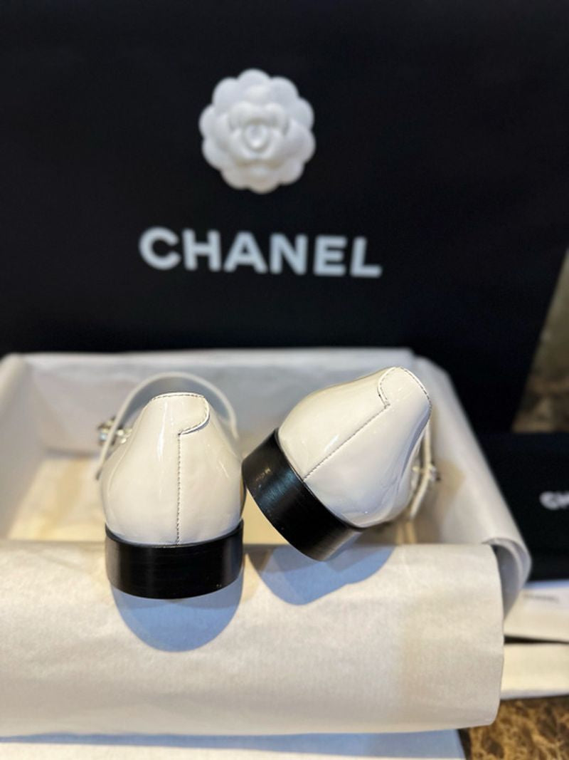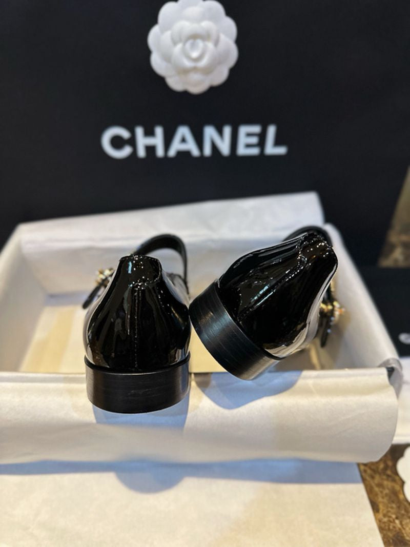 앞코의 턴락 장식은 샤넬만의 아이코닉한 디자인 요소로, 심플한 실루엣에 독창적인 포인트를 더합니다. 둥근 앞코와 발등을 감싸는 스트랩이 안정적인 착화감을 제공합니다.