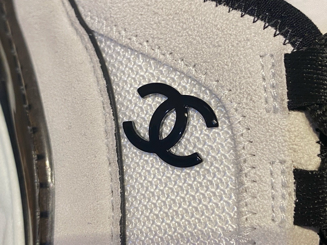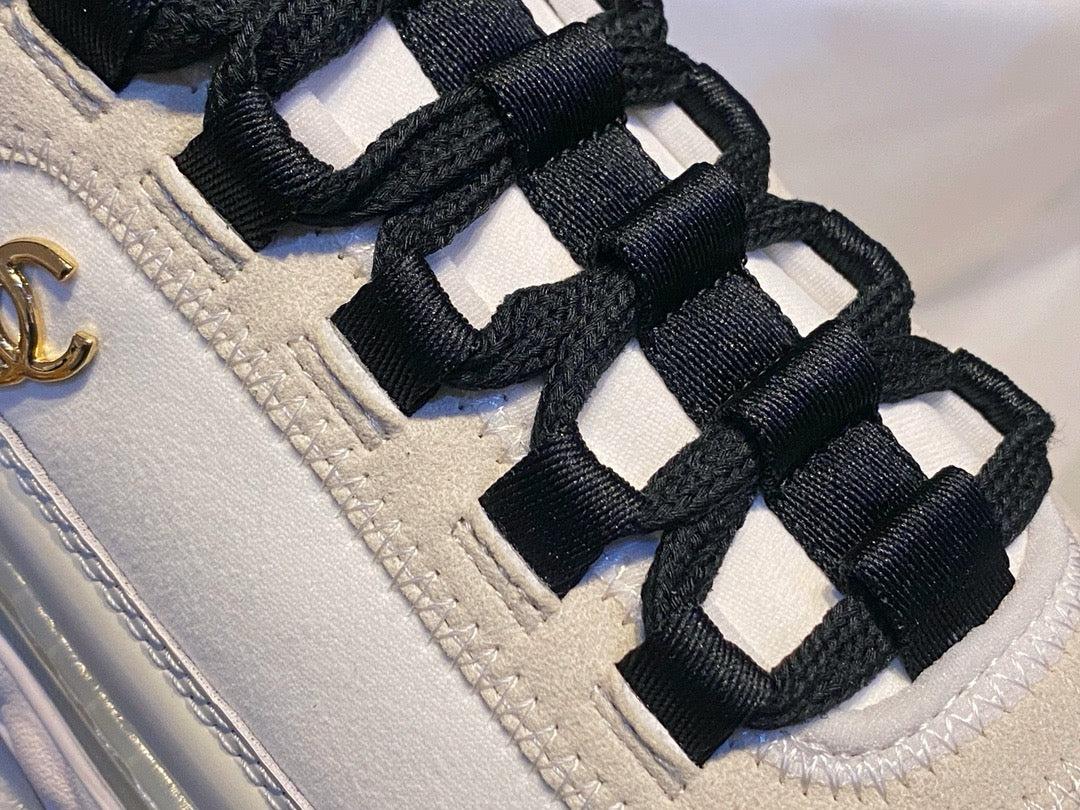 이 스니커즈는 메시, 텍스타일, 스웨이드, 가죽 등의 다양한 소재가 믹스된 어퍼 디자인이 특징입니다. 소재 간의 텍스처 대비가 세련된 분위기를 자아내며, 측면 또는 힐탭에는 샤넬 로고가 섬세하게 자수 또는 프린트로 표현되어 브랜드의 정체성을 강조합니다.