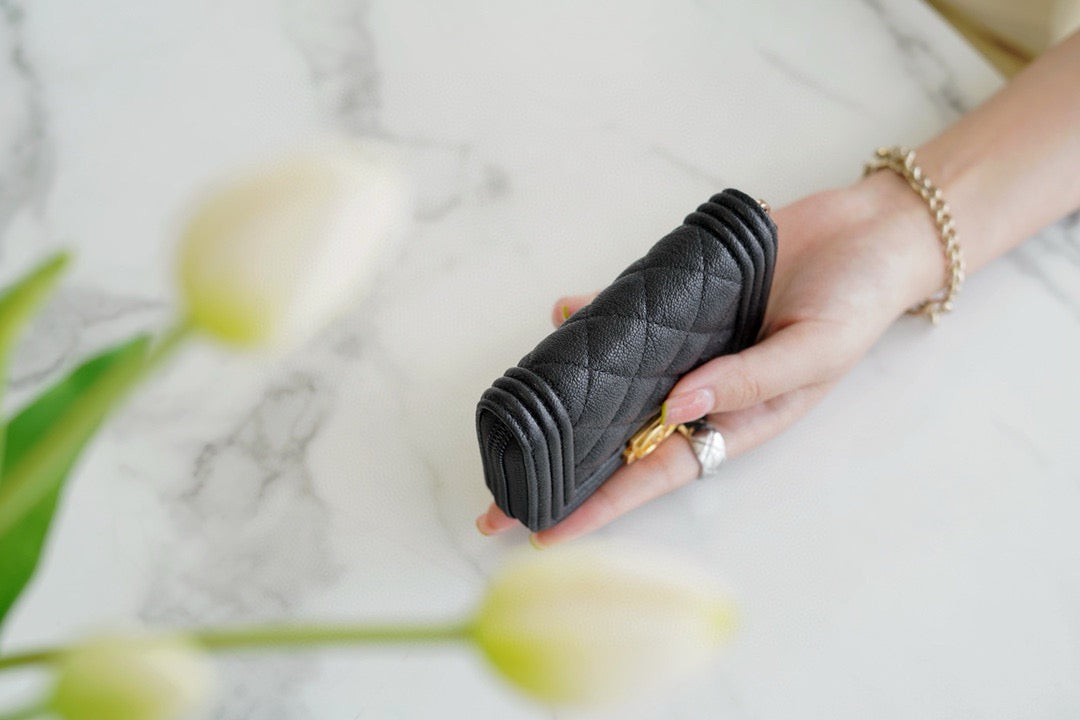 이 지갑은 보이 샤넬의 직선적인 퀼팅 디테일과 중심의 보이 락 장식이 특징이며, 캐비어 가죽 또는 램스킨 소재로 제작되어 스크래치에 강하고 오래 사용해도 형태가 잘 유지됩니다. 지퍼 클로저 방식으로 내용물을 안전하게 보관할 수 있어 데일리 지갑으로 매우 적합합니다.