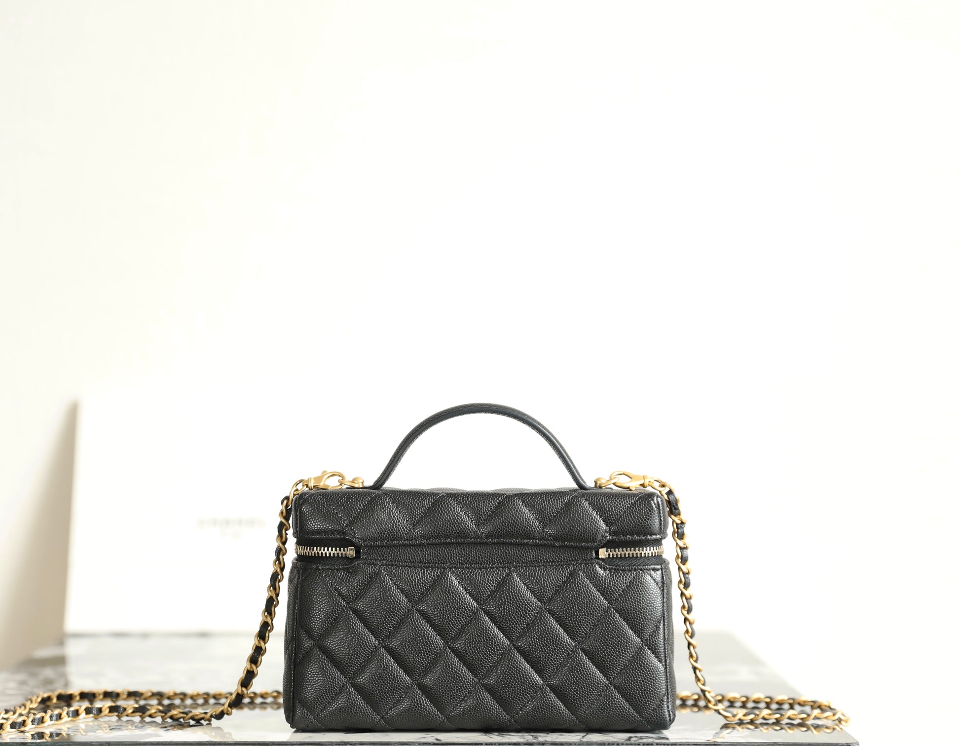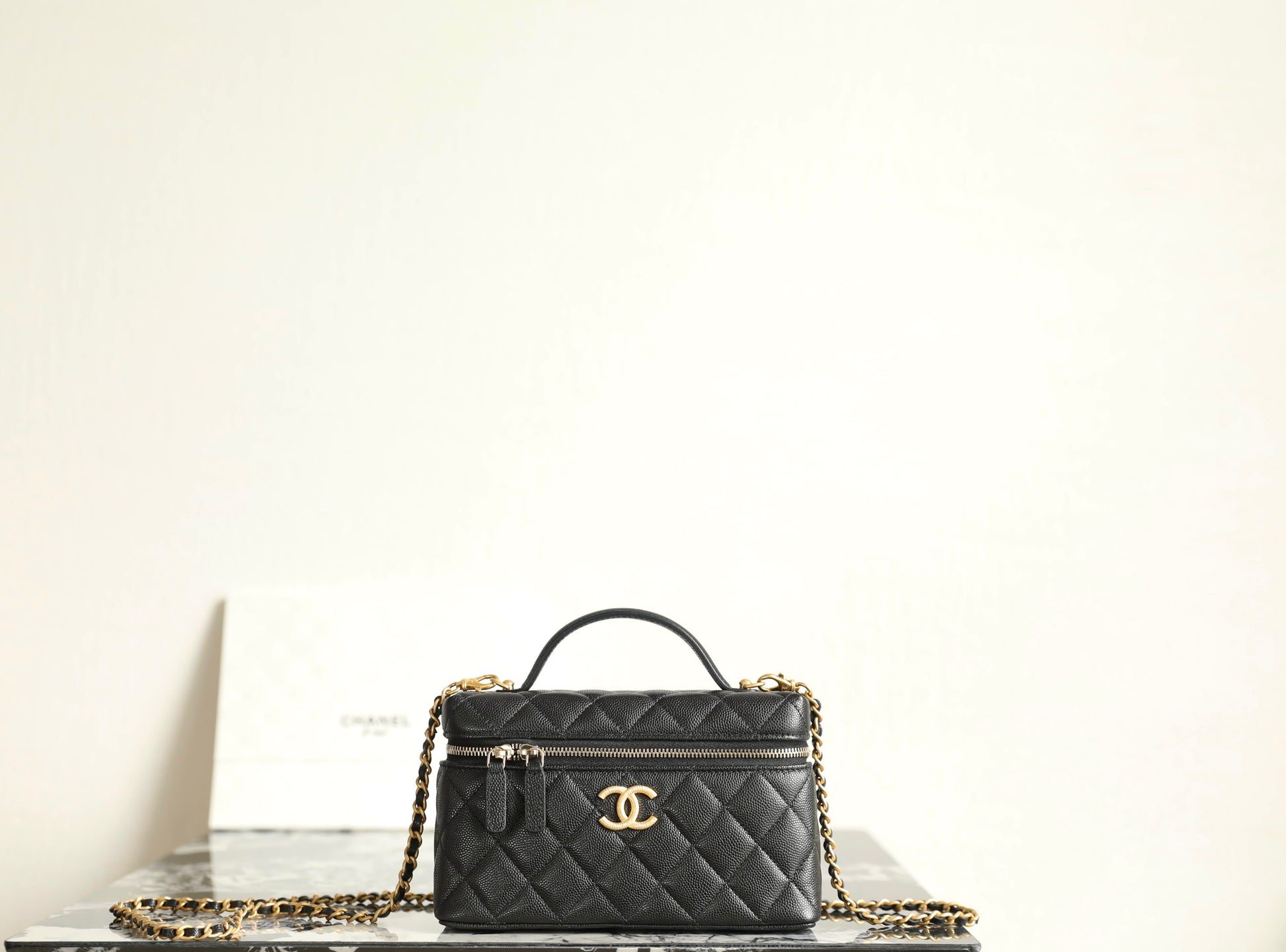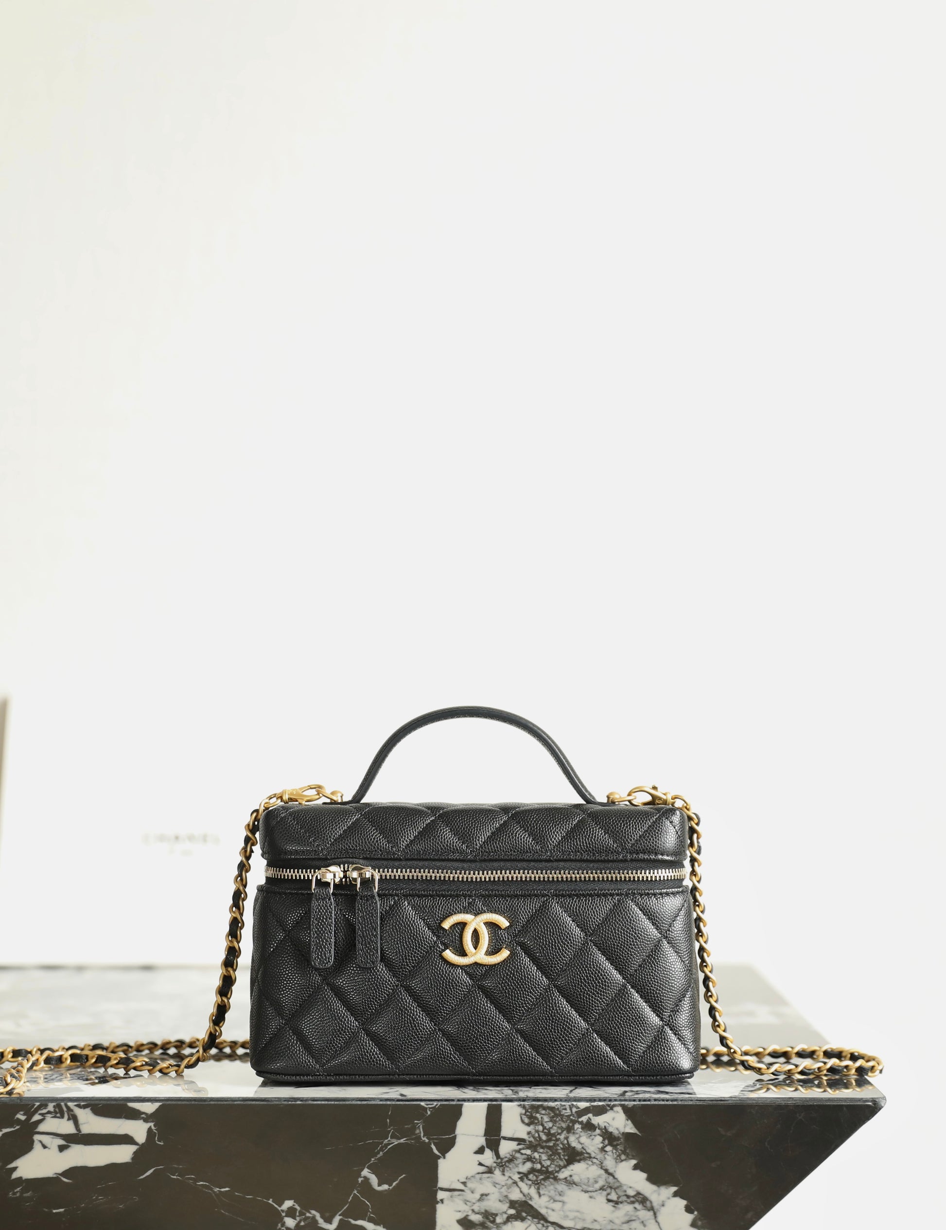 이 백은 세로로 긴 박스 형태로 디자인되어 립스틱, 쿠션, 손거울 등 뷰티 아이템 수납에 최적화된 구조를 자랑하며, 전면에는 입체적인 대형 CC 로고가 장식되어 강렬한 브랜드 아이덴티티를 드러냅니다. 상단 지퍼 여밈과 견고한 탑 핸들, 체인 스트랩으로 구성되어 휴대성과 스타일을 동시에 만족시킵니다.