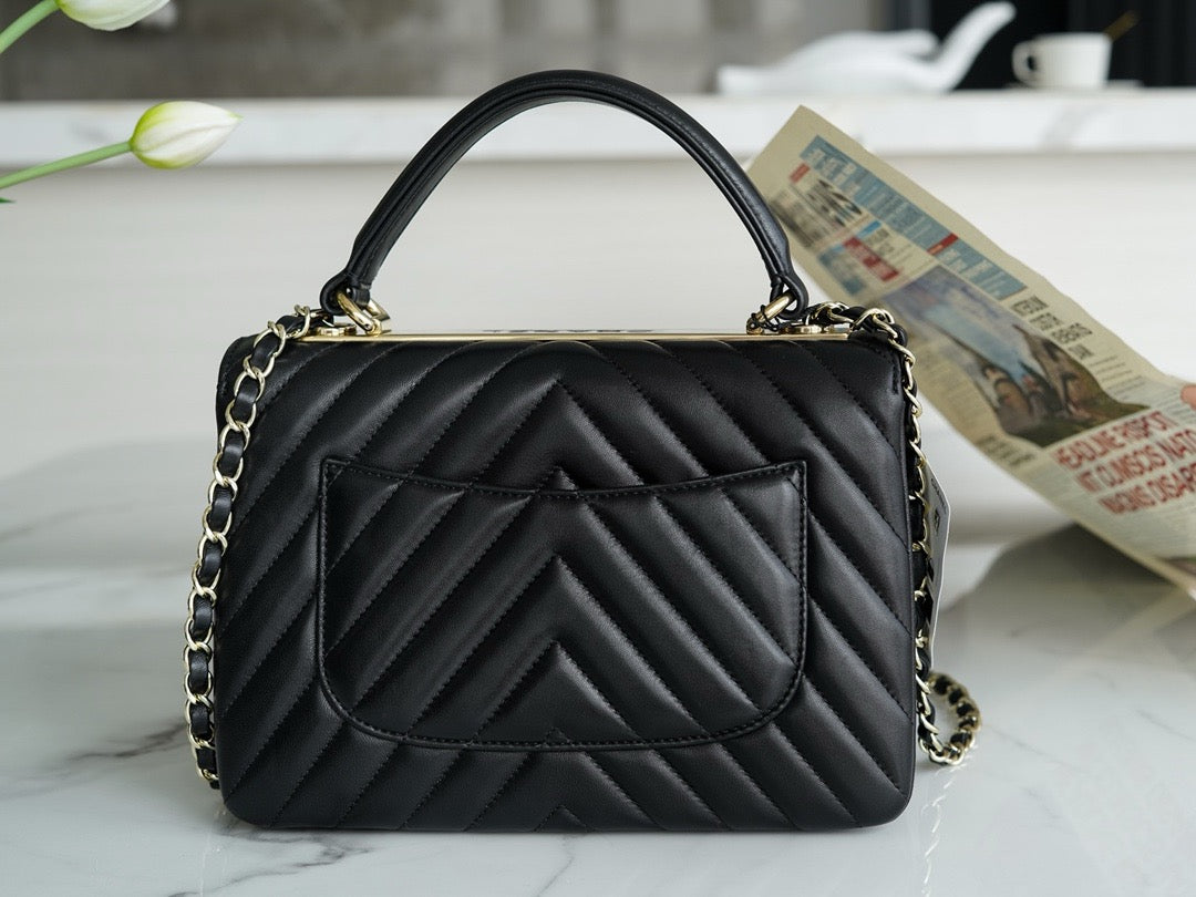 샤넬 쉐브론 트렌디 CC는 샤넬(Chanel)의 트렌디 CC 라인에 쉐브론 퀼팅 패턴이 더해진 고급스러운 탑핸들백으로, 우아하고 세련된 실루엣과 실용적인 구조로 다양한 스타일링에 활용되는 대표적인 아이템입니다.