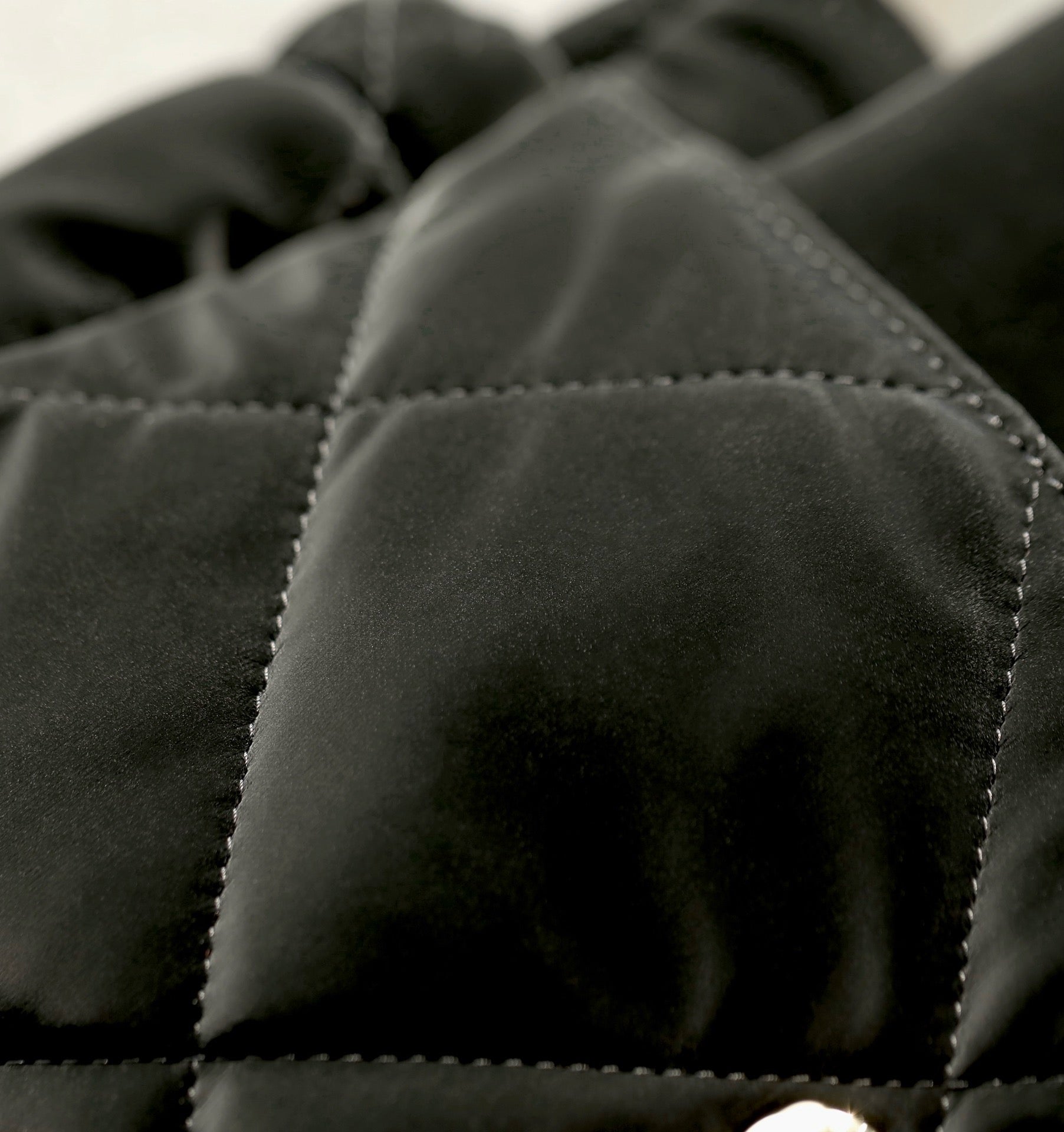이 백은 부드럽고 따뜻한 플리스 또는 패딩 소재와 퀼팅 가죽 디테일이 조화를 이루며, 전면에는 상징적인 CC 턴락이 적용되어 고급스러운 포인트를 완성합니다. 볼링백 특유의 곡선 실루엣과 넉넉한 수납력은 실용성과 스타일을 동시에 만족시킵니다.