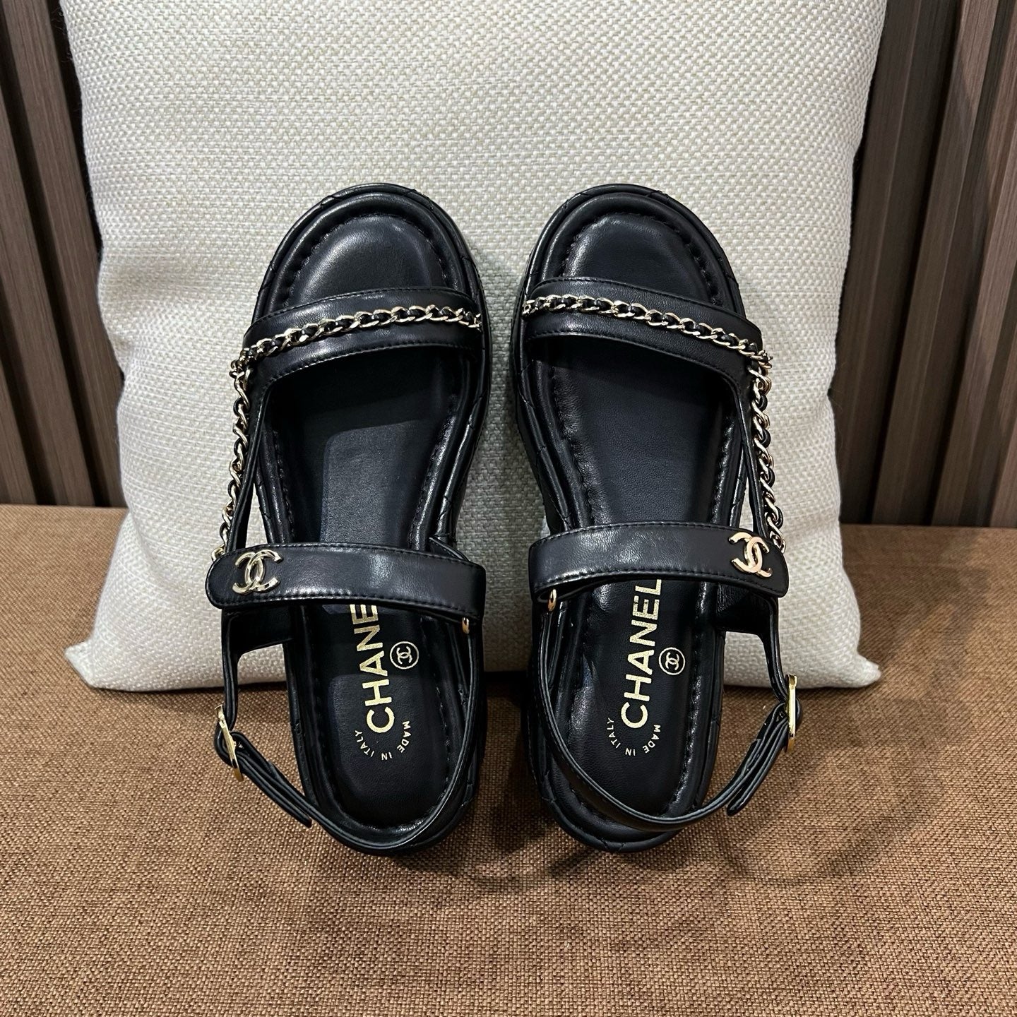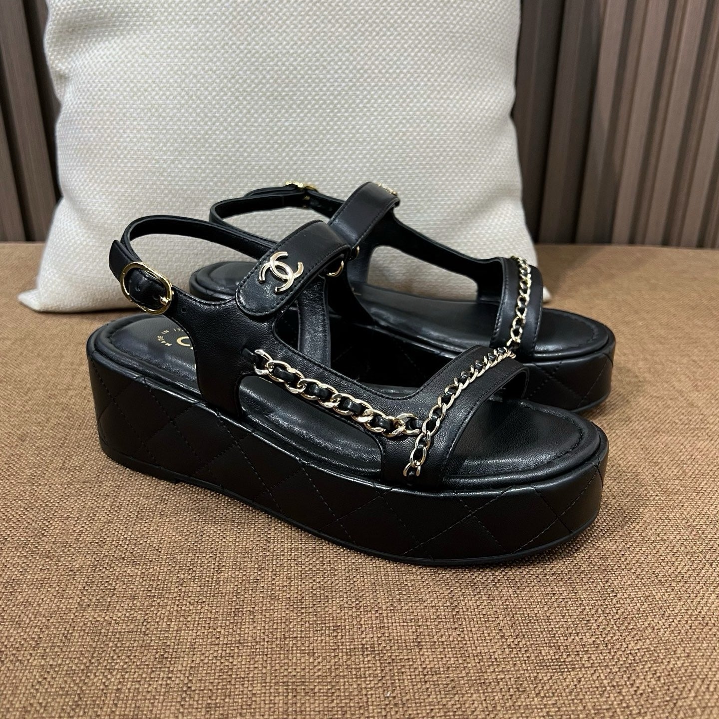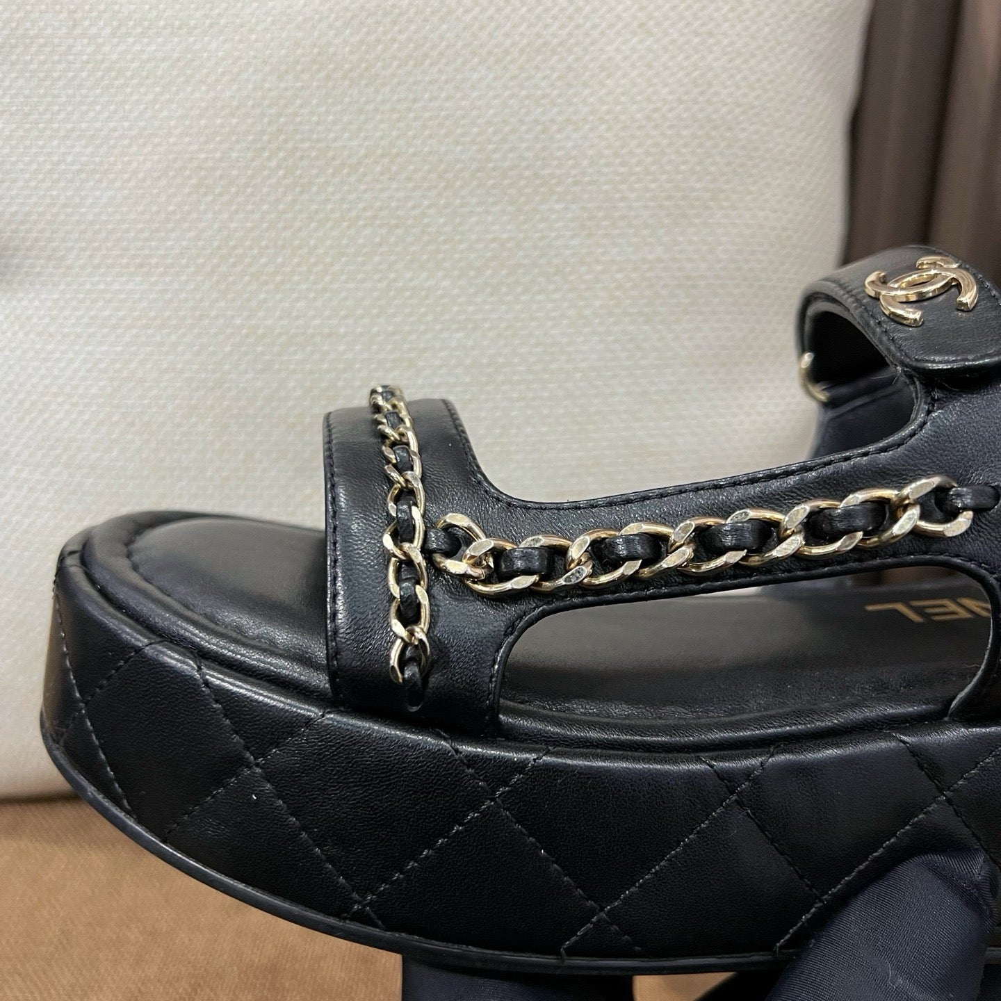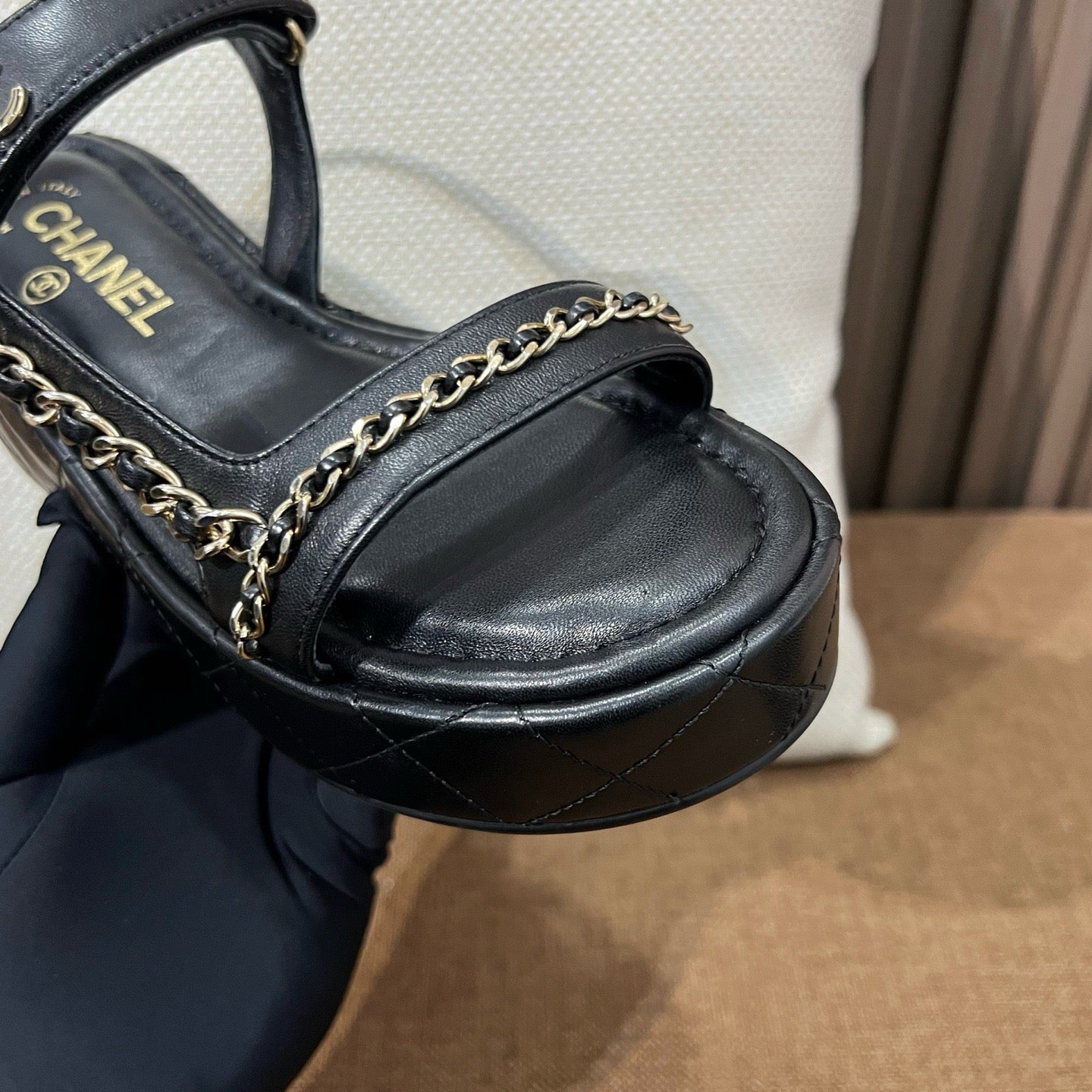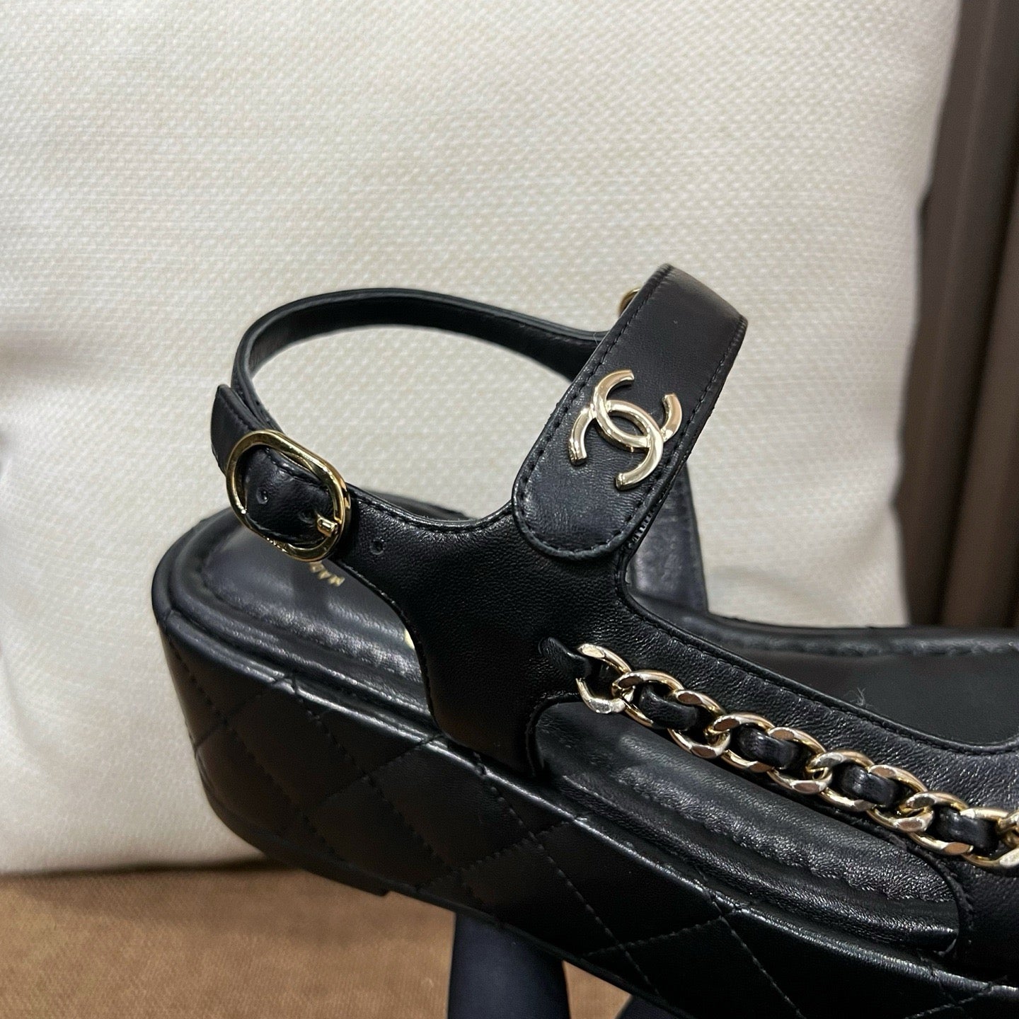 이 샌들은 샤넬 특유의 퀄팅 가죽 디테일이 인솔과 스트랩에 적용되어 있으며, 체인 스트랩은 골드 또는 실버 톤 메탈 소재로 구성되어 세련된 포인트를 더합니다. 약 6~8cm 높이의 웨지 힐은 안정적인 착화감을 제공하면서도 자연스러운 키높이 효과를 주어 데일리룩이나 이브닝룩 모두에 적합합니다.