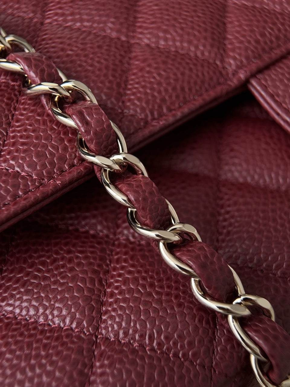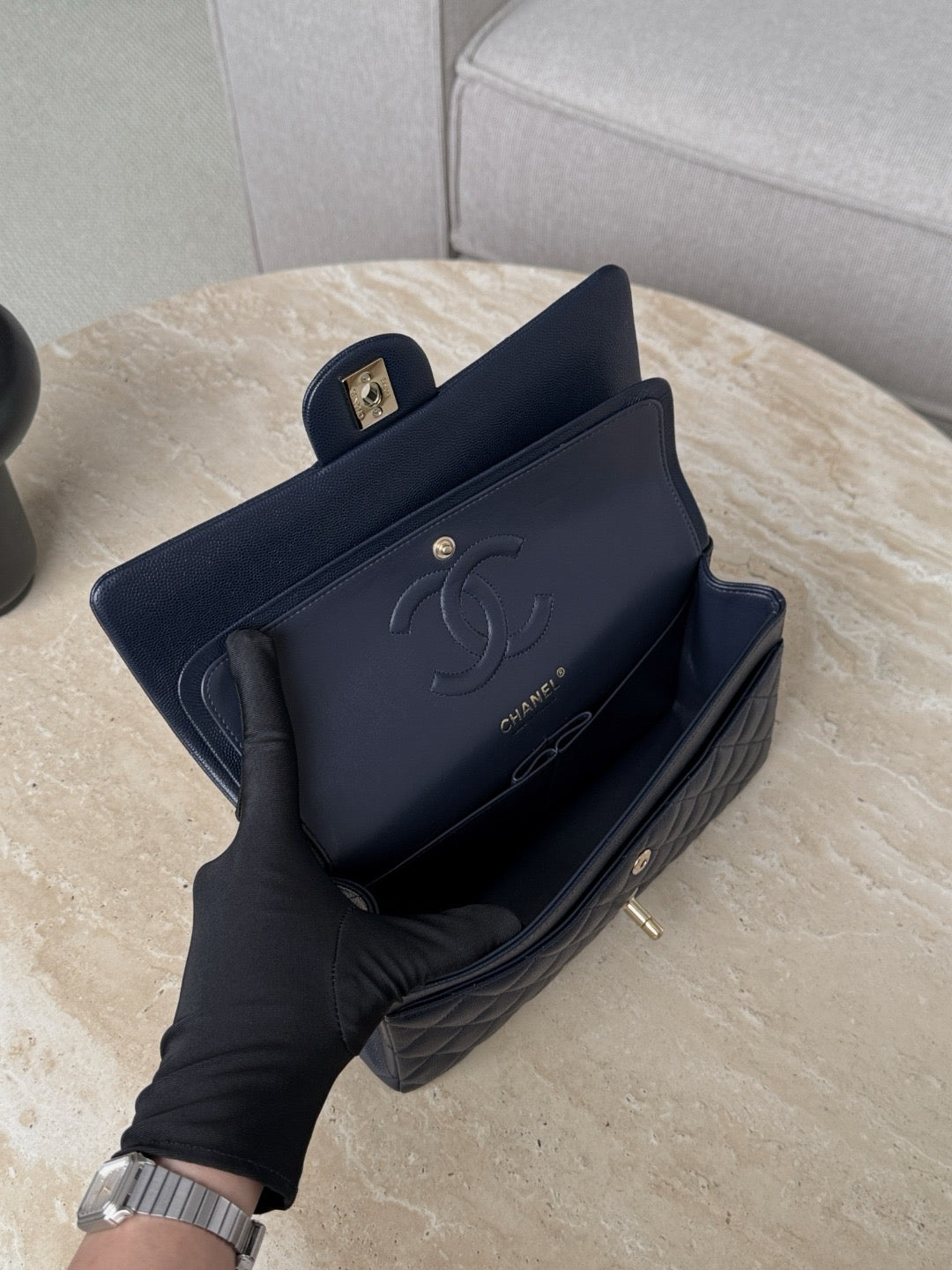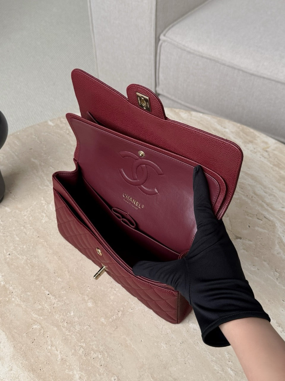 샤넬 클래식 플랩백 미디움은 마드모아젤 샤넬이 직접 디자인한 더블 플랩 구조와 체인 & 가죽 스트랩, 더블 C 로고 잠금 장식이 특징입니다. 캐비어 가죽 특유의 내구성과 고급스러운 질감이 결합되어 오래도록 클래식한 아름다움을 유지할 수 있습니다.