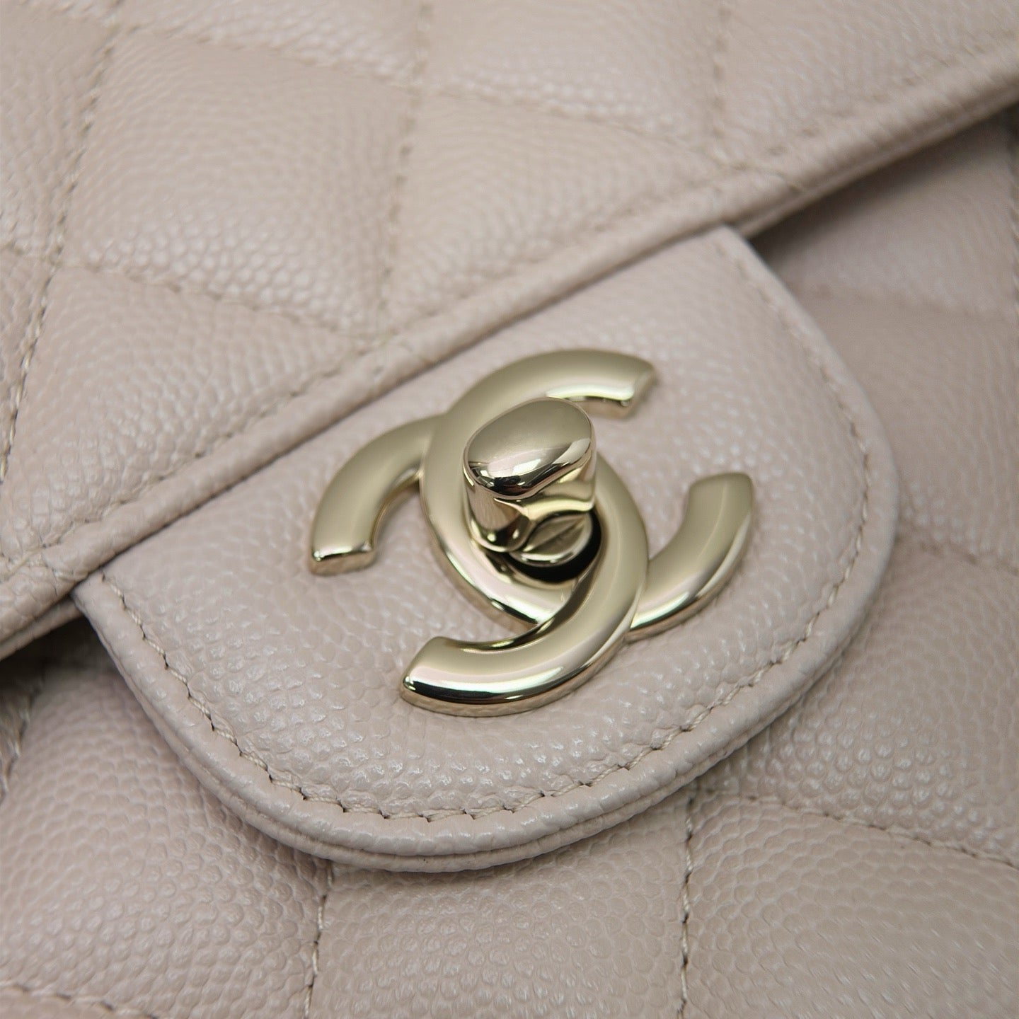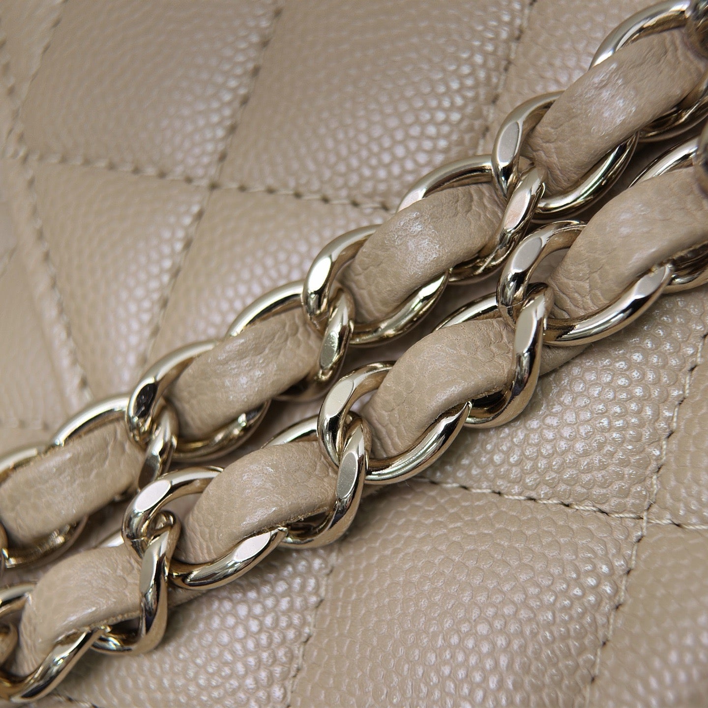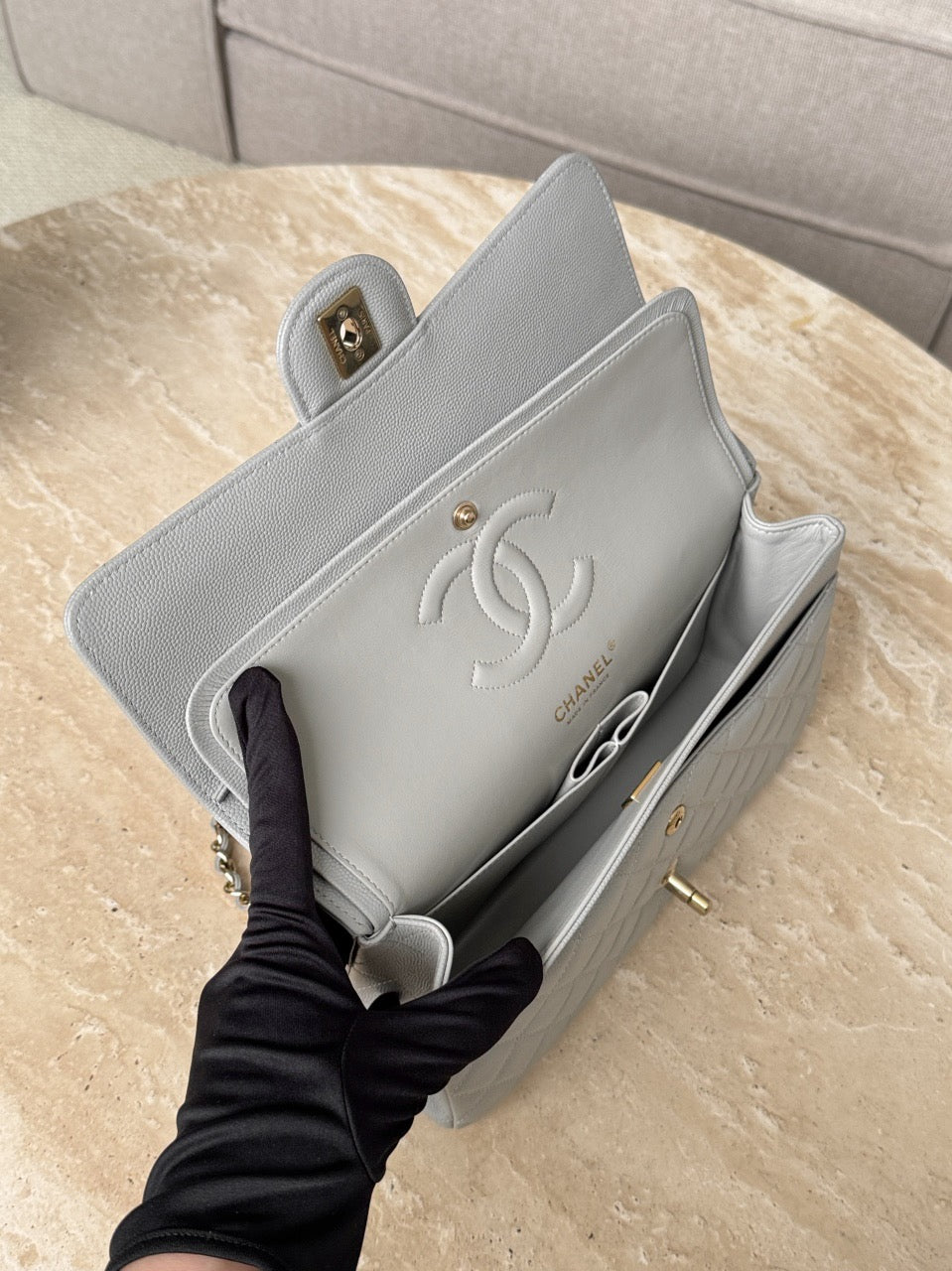 샤넬 클래식 플랩백 미디움은 마드모아젤 샤넬이 직접 디자인한 더블 플랩 구조와 체인 & 가죽 스트랩, 더블 C 로고 잠금 장식이 특징입니다. 캐비어 가죽 특유의 내구성과 고급스러운 질감이 결합되어 오래도록 클래식한 아름다움을 유지할 수 있습니다.