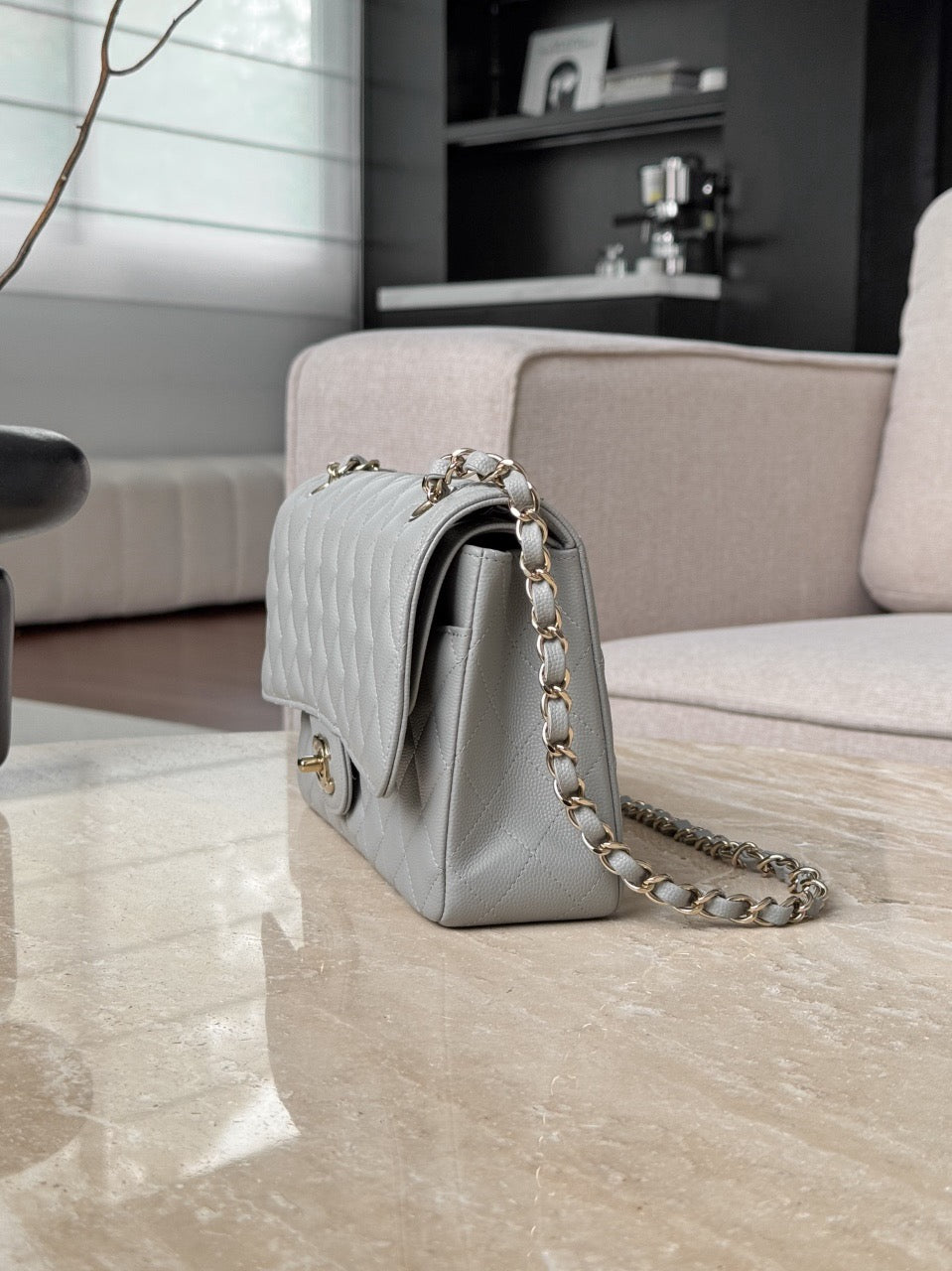 샤넬 클래식 플랩백 미디움 캐비어(Chanel Classic Flap Bag Medium Caviar)는 샤넬의 시그니처 디자인 중 가장 아이코닉한 아이템으로, 고급스러운 캐비어 가죽과 견고한 구조, 세련된 디테일로 시대를 초월해 사랑받는 클래식 백입니다. 데일리부터 포멀룩까지 어떤 착장에도 자연스럽게 어울리는 만능 아이템입니다.