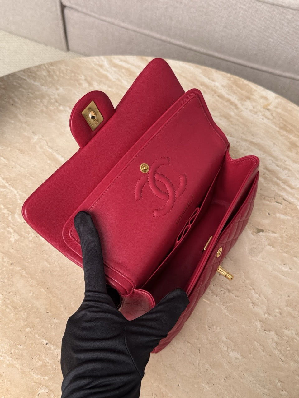 샤넬 클래식 플랩백 스몰 램스킨은 더블 플랩 구조와 퀼팅 텍스처, 더블 C 턴락, 체인 & 가죽 혼합 스트랩이 특징입니다. 램스킨은 손에 닿는 감촉이 부드럽고 고급스러우며, 정제된 분위기를 연출하는 데 탁월합니다.