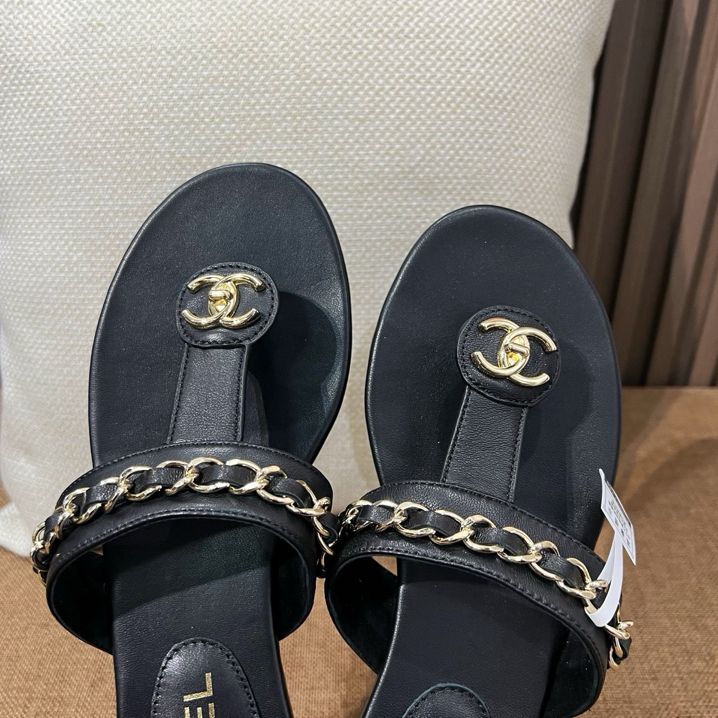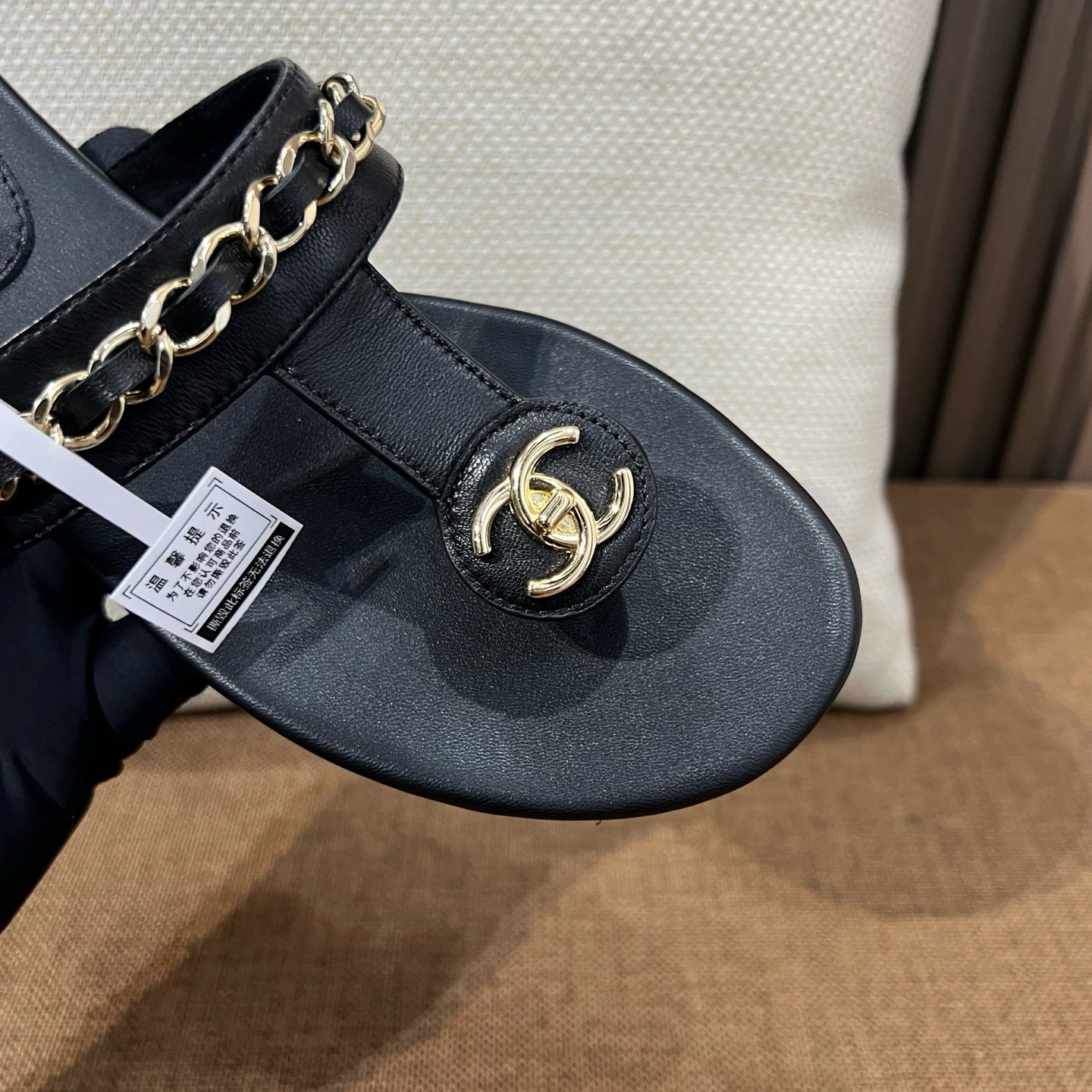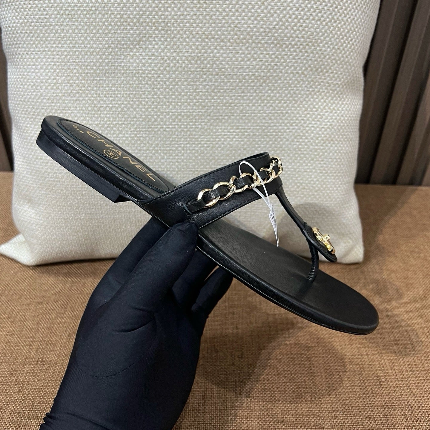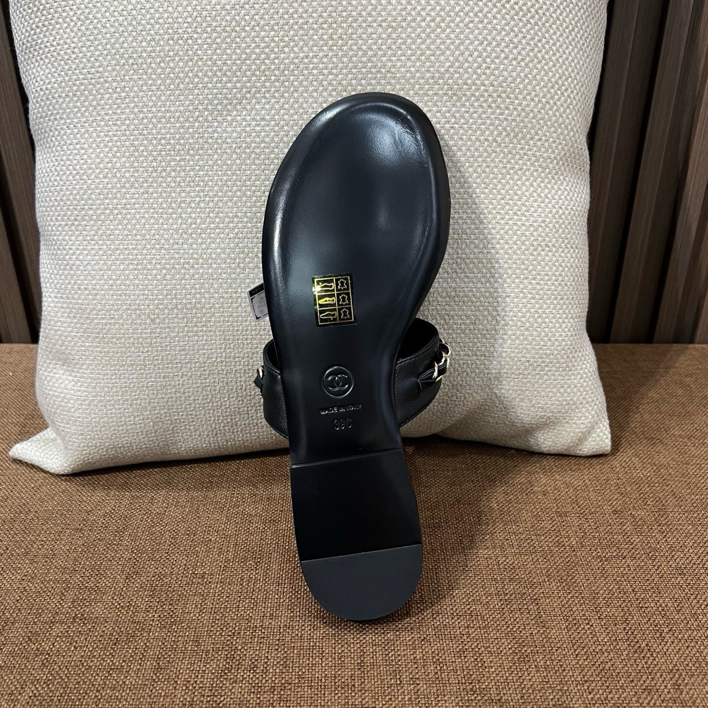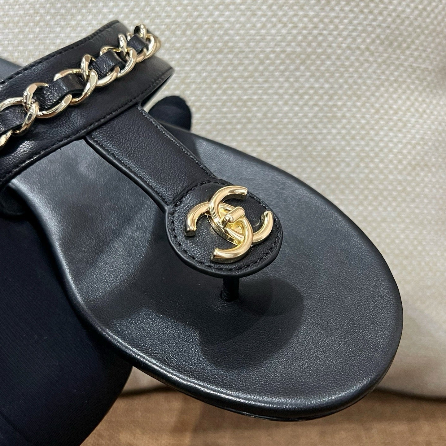 샤넬의 상징적인 턴락 메탈 장식이 스트랩 중앙에 배치되어 포인트를 주며, 발가락 사이를 감싸는 쪼리 스타일의 디자인은 여름철 시원한 착화감을 제공합니다. 가죽 또는 고무 스트랩과 함께 가볍고 유연한 고무 밑창이 적용되어 편안한 착용감을 선사합니다.