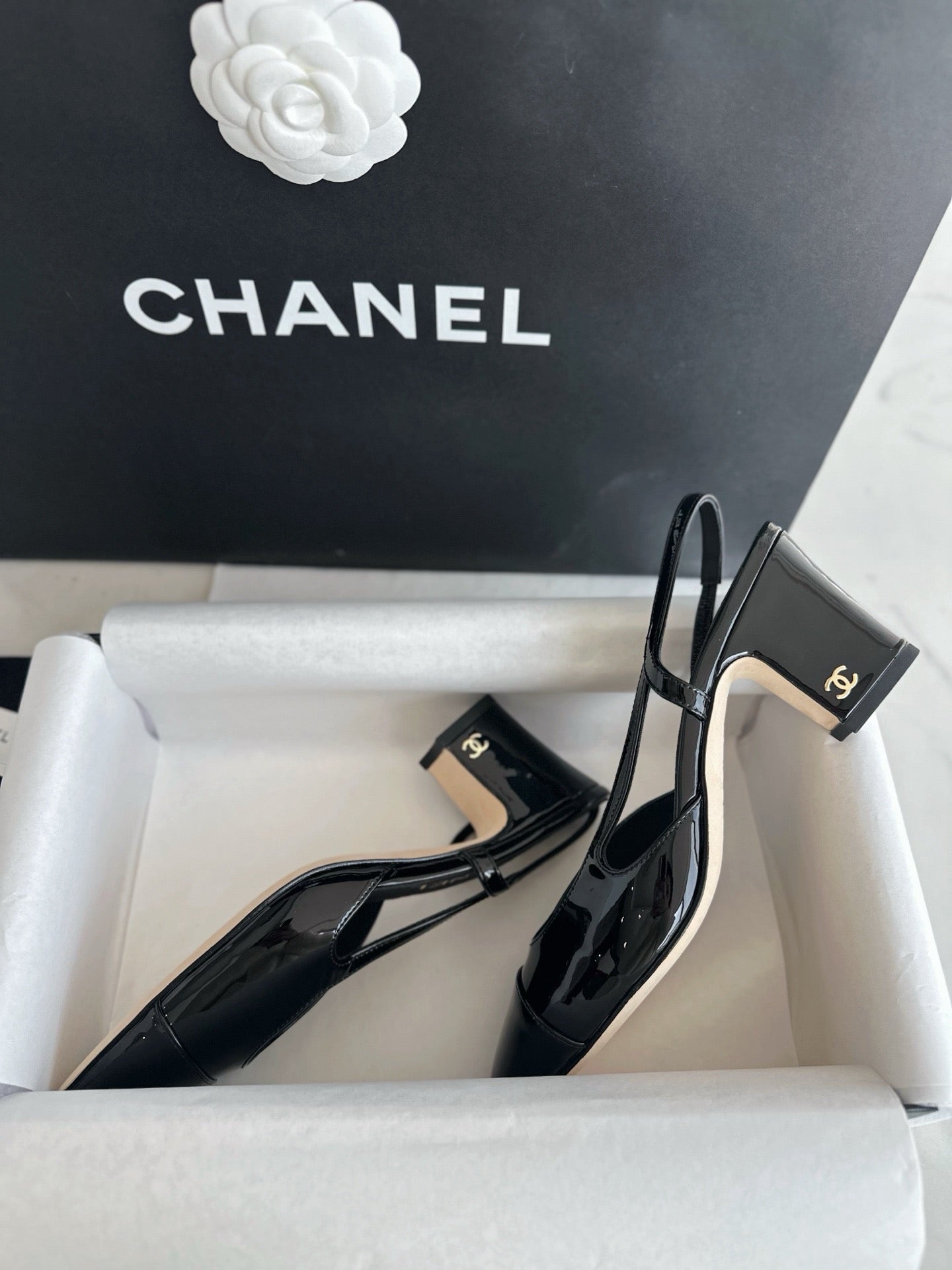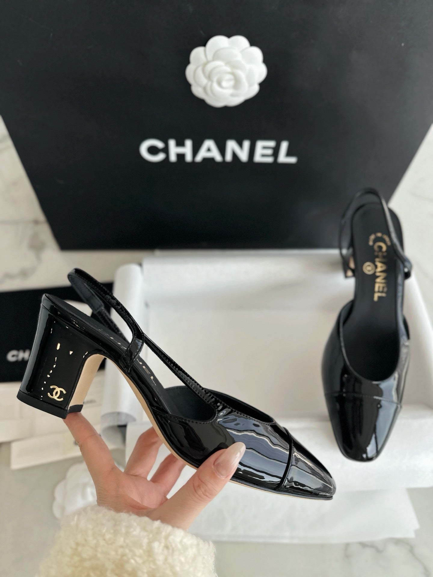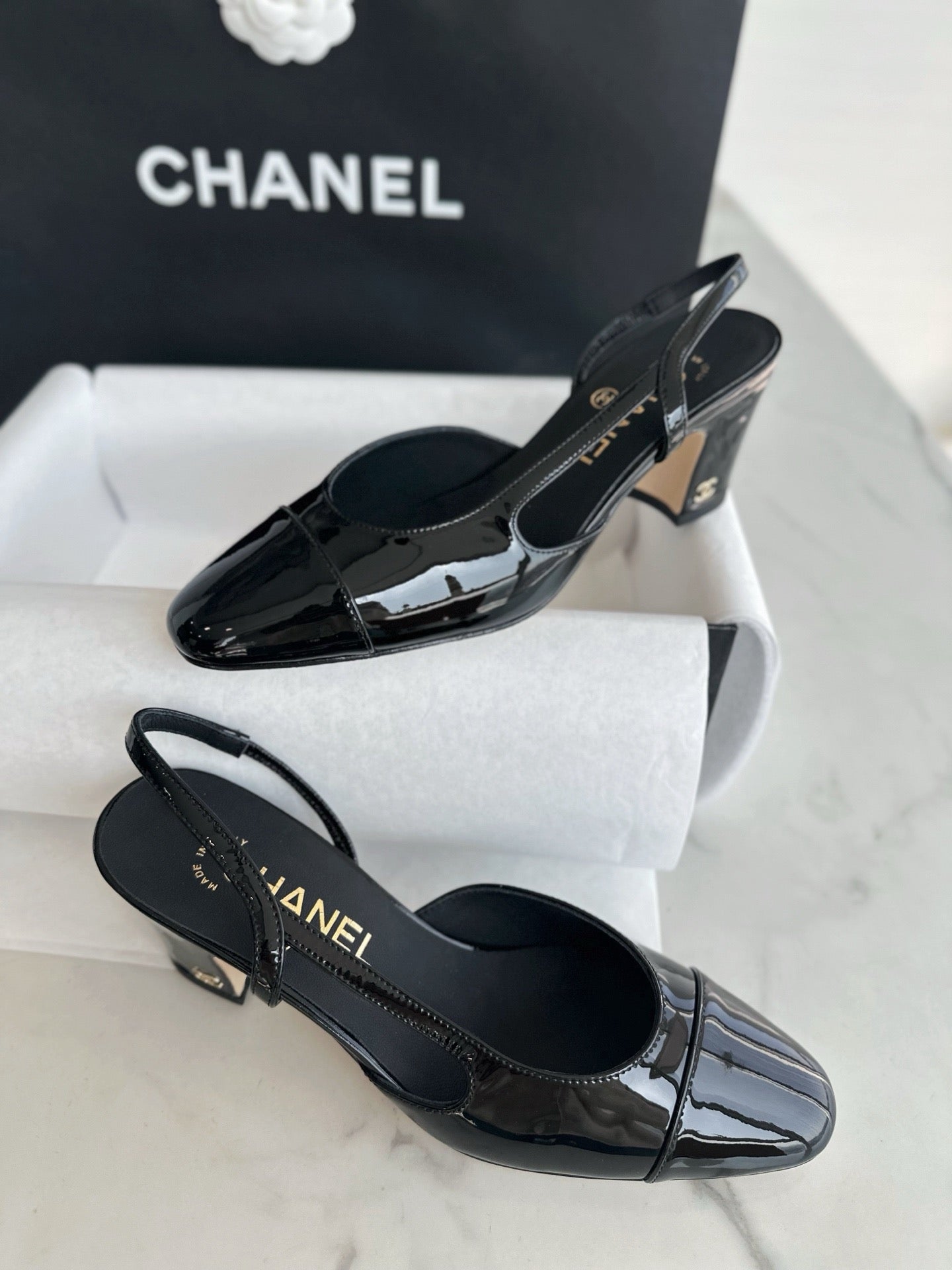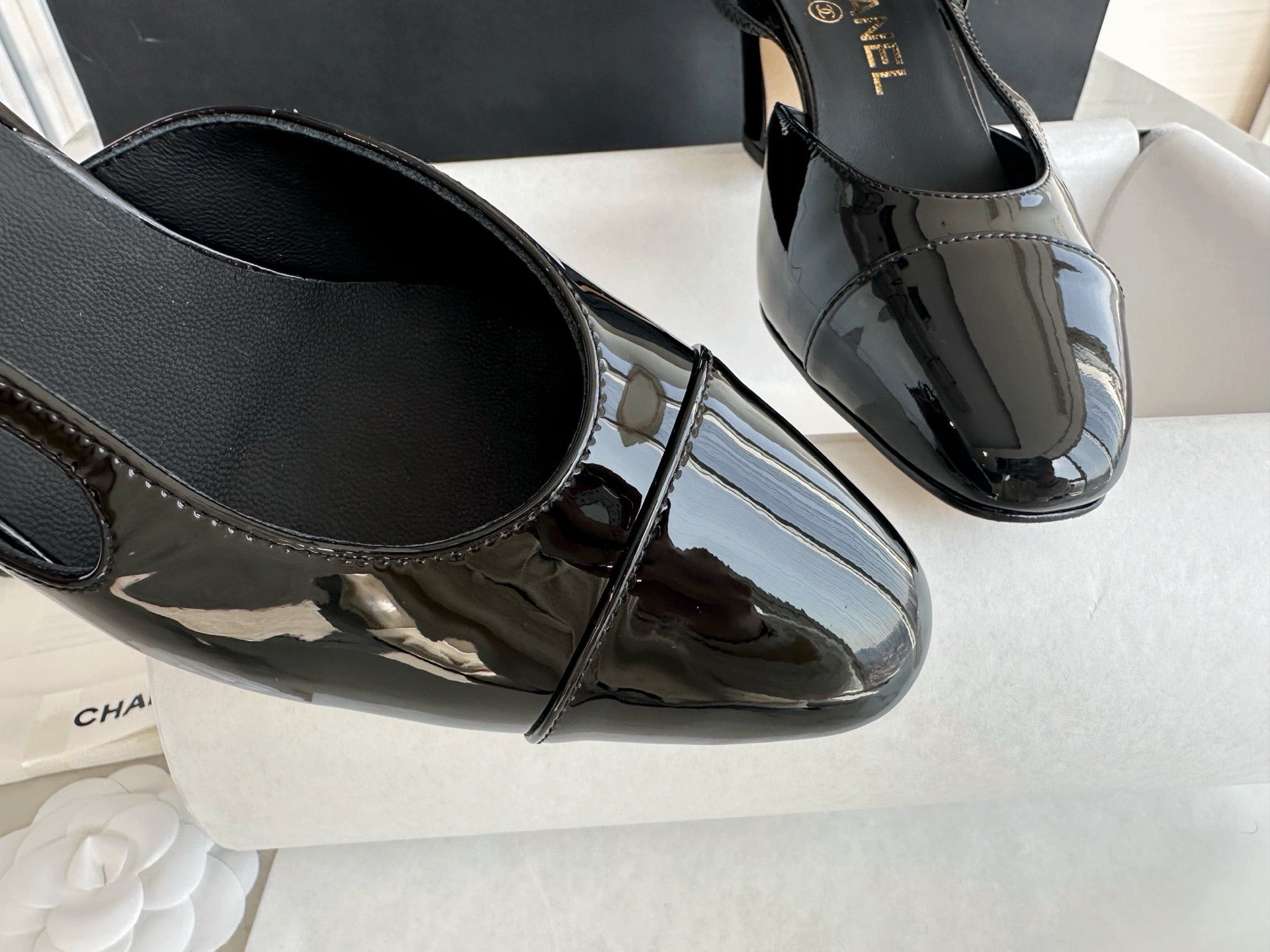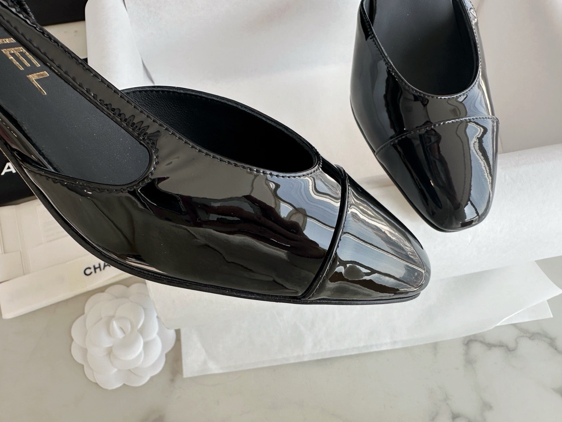 샤넬 페이던트 슬링백 미드힐(Chanel Patent Slingback Mid Heels) - 안정감 있는 우아함