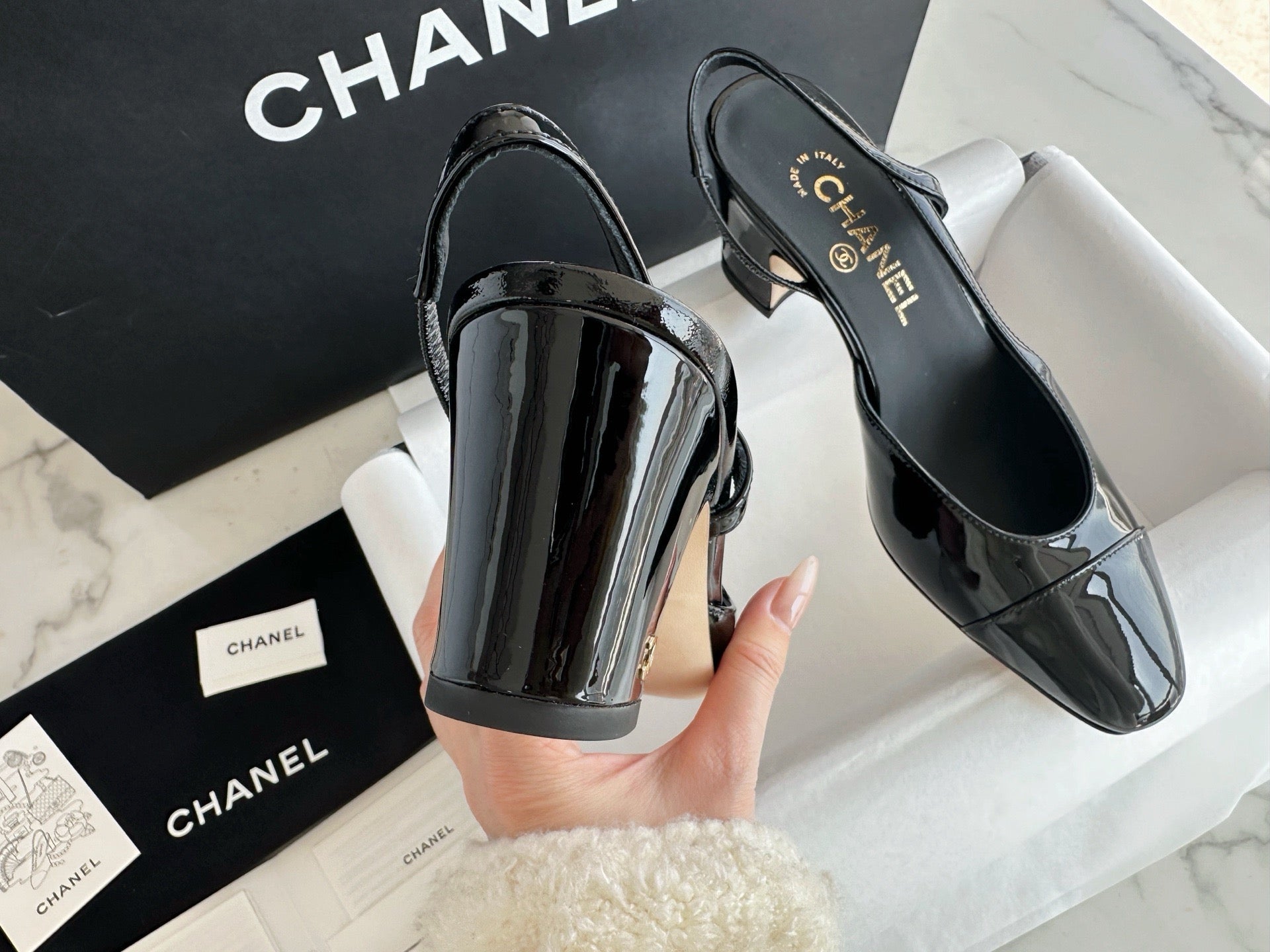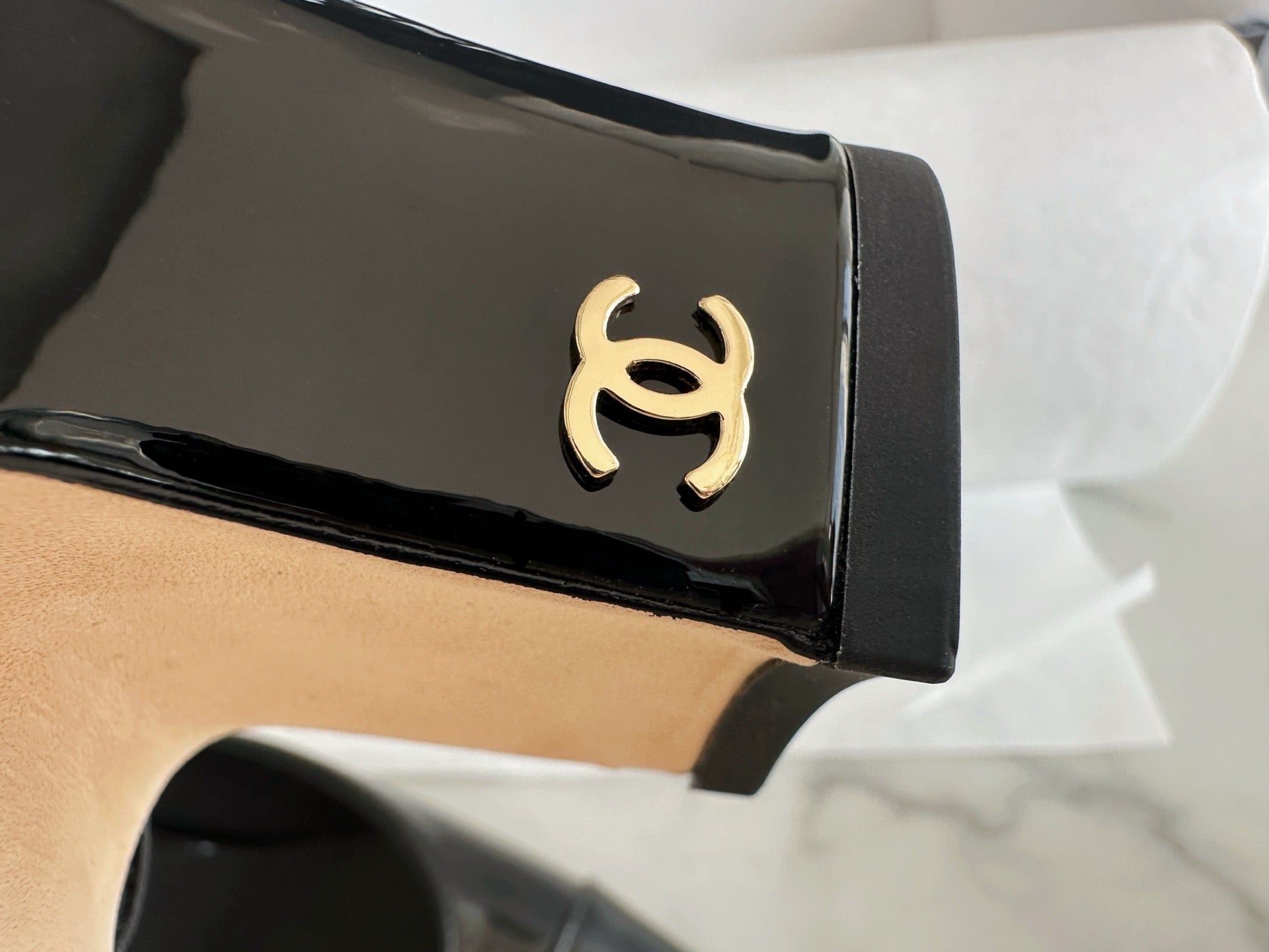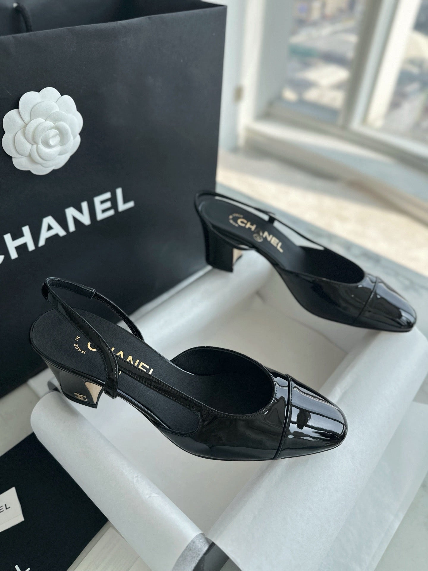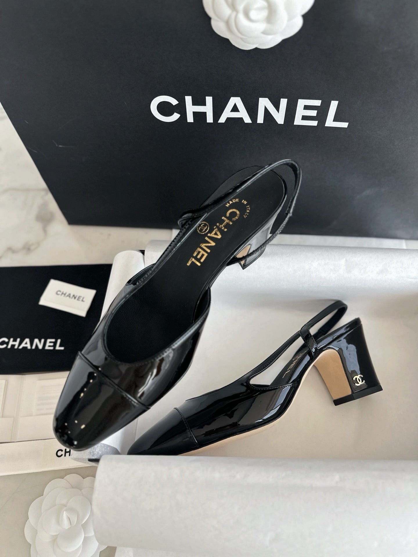 샤넬 페이던트 슬링백 미드힐(Chanel Patent Slingback Mid Heels) - 안정감 있는 우아함