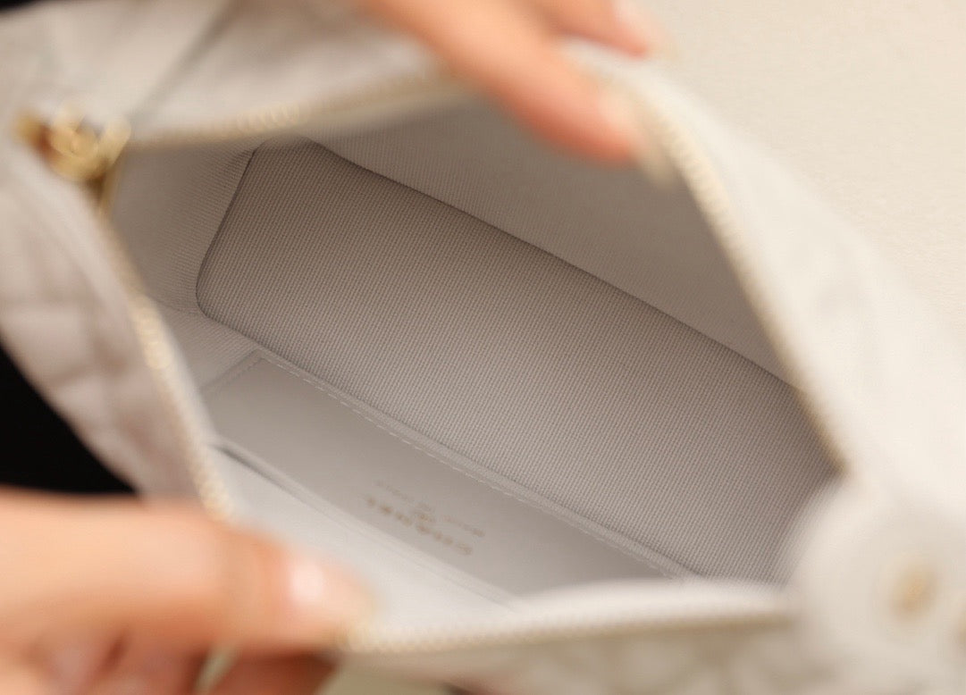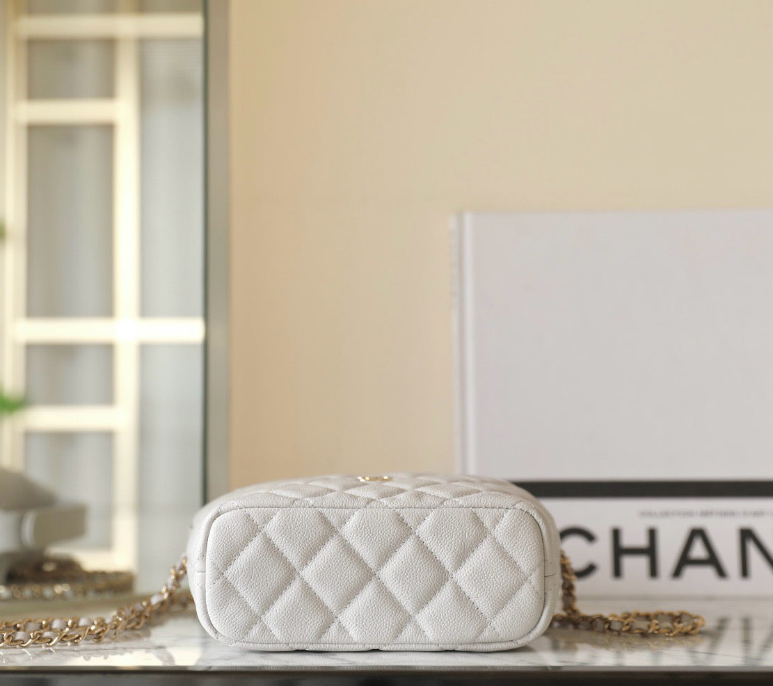 디테일: 퀼팅 텍스처, 금장 더블 C 로고, 체인 스트랩, 마그네틱 또는 지퍼 여밈