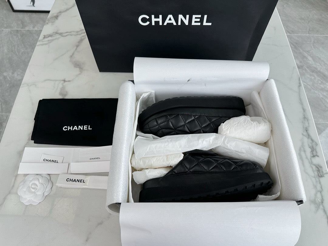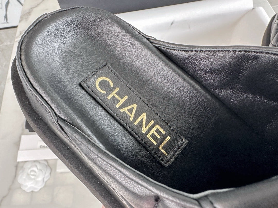이 뮬은 샤넬 클래식 플랩백에서 영감을 받은 디자인으로, 가죽 위에 정교하게 새겨진 퀄팅 패턴과 더블 C 로고가 새겨진 메탈 턴락 장식이 특징입니다. 슬립온 스타일로 신고 벗기 편리하며, 낮은 굽 구조로 장시간 착용에도 편안함을 제공합니다.