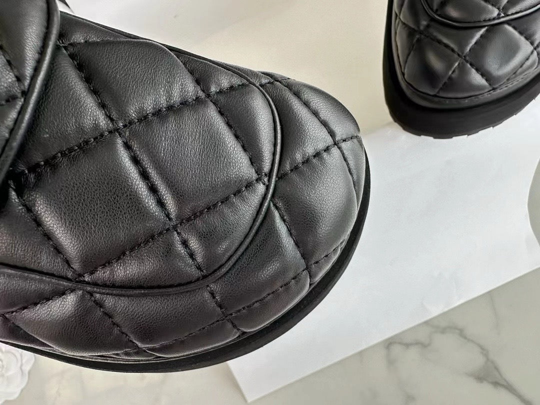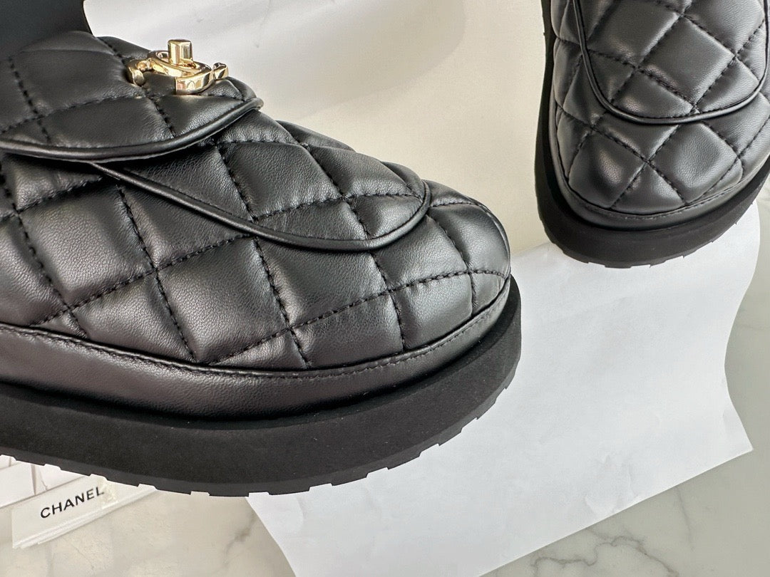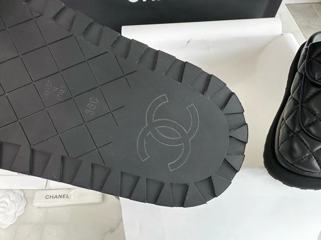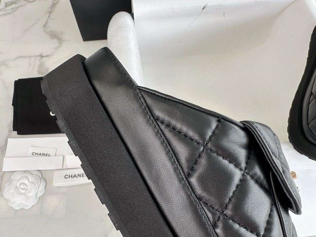 샤넬 플랩백의 상징적인 디자인을 슈즈에 적용한 독창적인 디자인과 고급 가죽 소재, 턴락 디테일이 돋보입니다.
