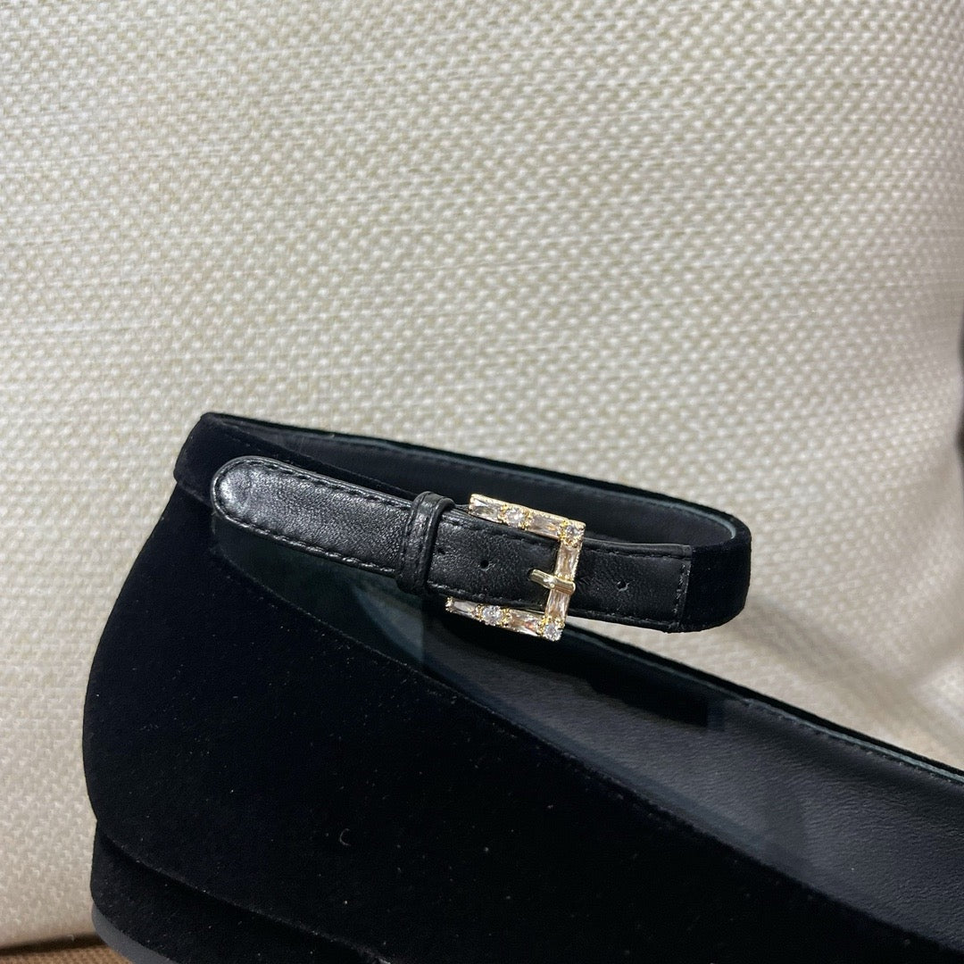 이 제품은 전통적인 메리제인 디자인을 샤넬식으로 재해석한 아이템으로, 벨벳 특유의 부드러운 질감과 광택이 돋보입니다. 발등을 감싸는 리본 스트랩에는 은은하게 빛나는 CC 로고 메탈 장식이 더해져, 단순한 슈즈 이상의 세련된 인상을 줍니다.