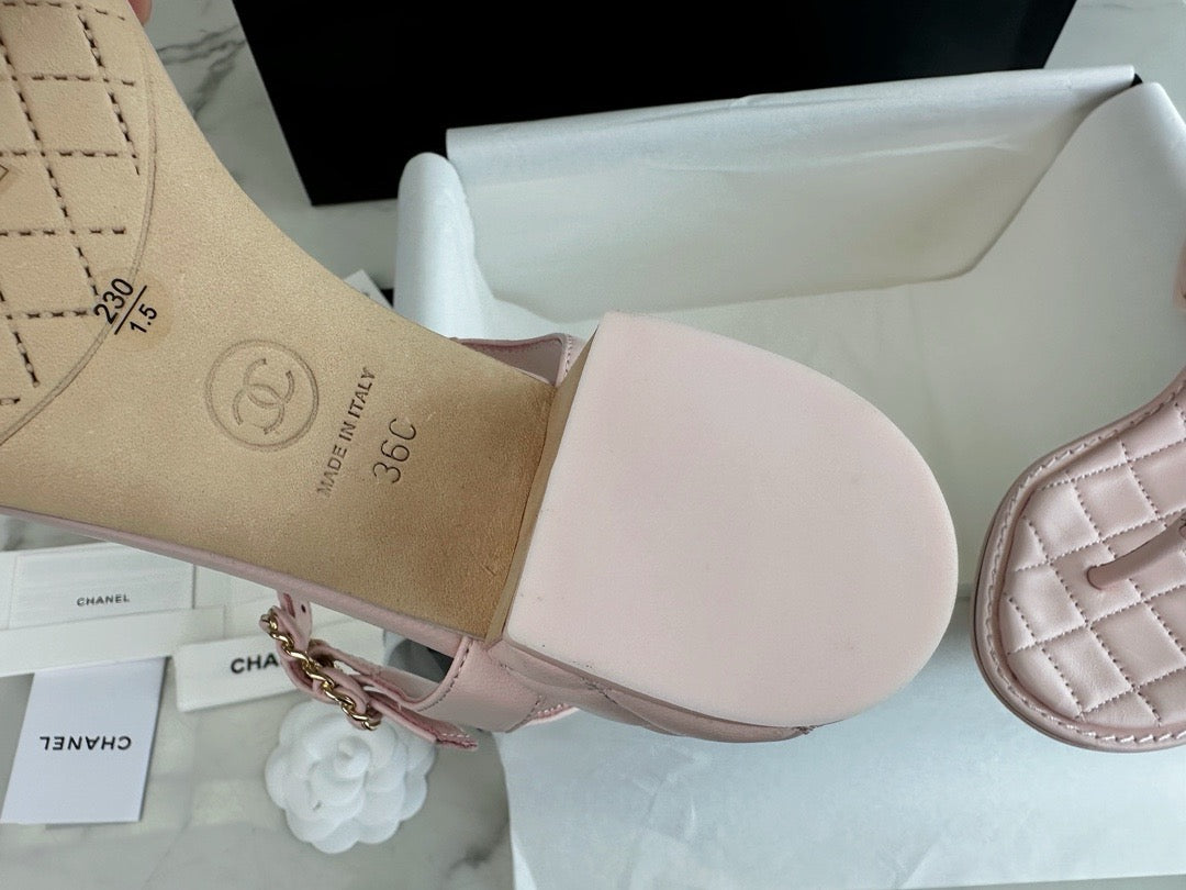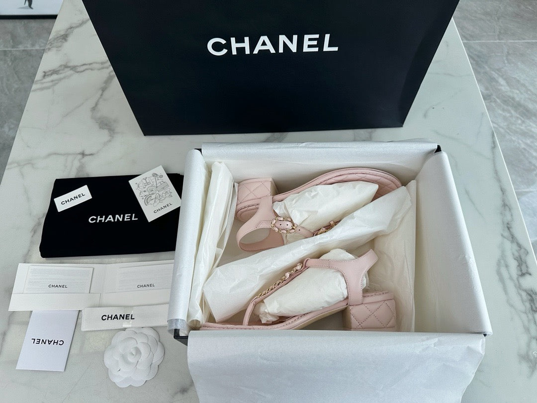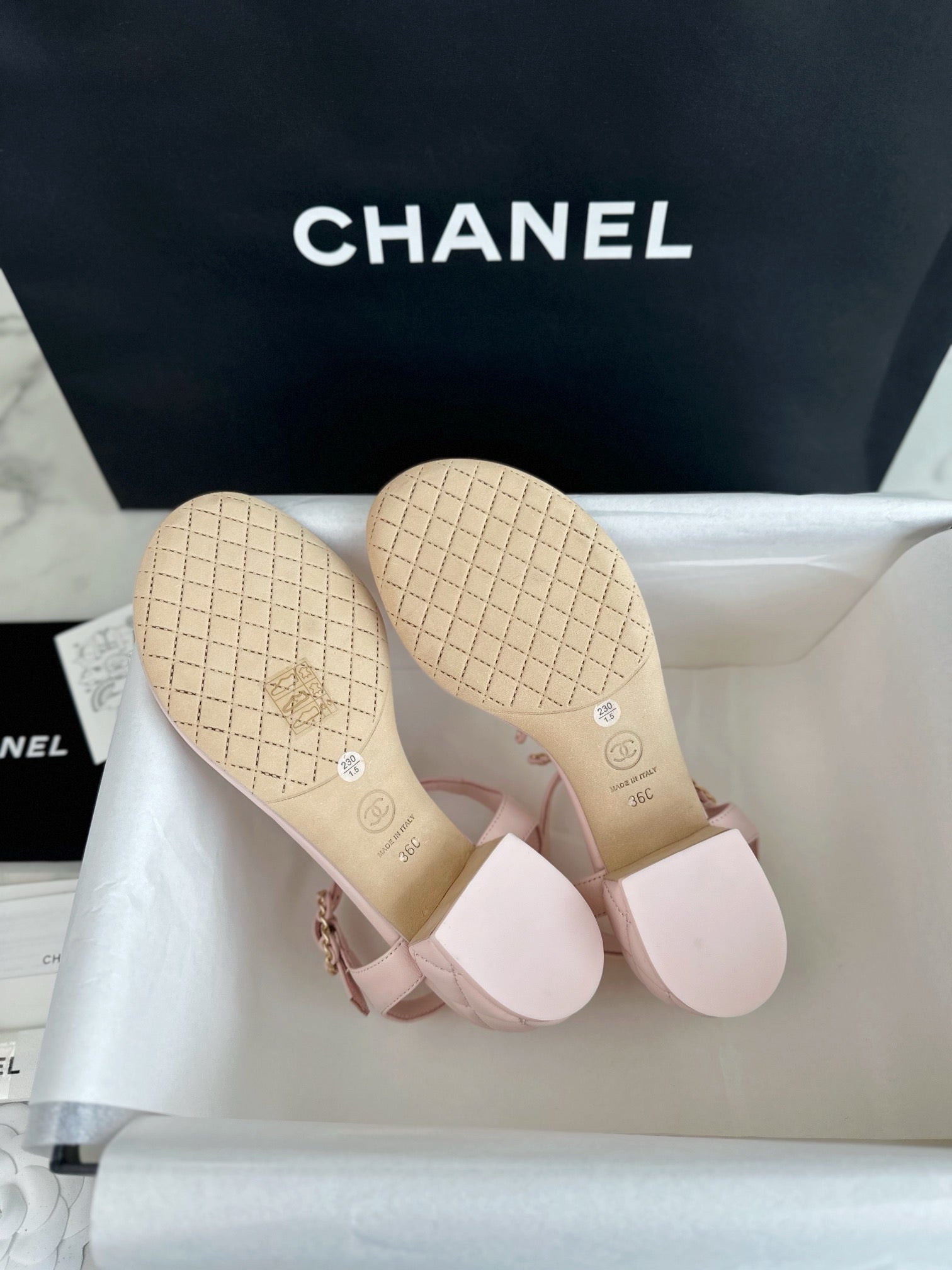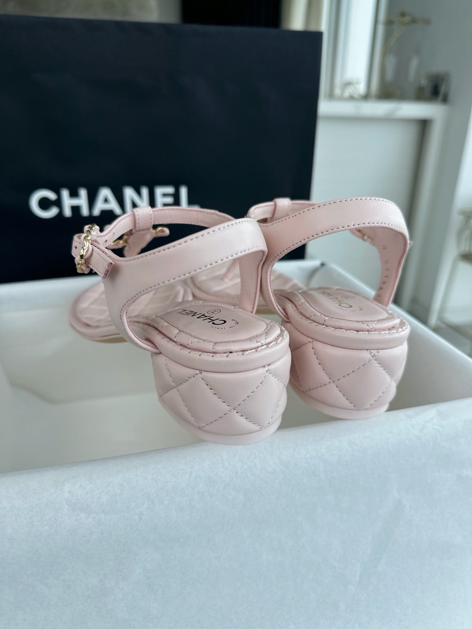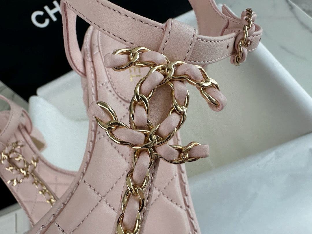 이 샌들은 샤넬의 전통적인 퀄팅 디자인을 기반으로 제작되었으며, 부드러운 가죽 소재에 정교한 스티치가 더해져 정제된 실루엣을 완성합니다. 발등을 감싸는 스트랩에는 금장 체인과 더블 C 로고가 장식되어 있어 브랜드의 아이덴티티를 강하게 드러냅니다.