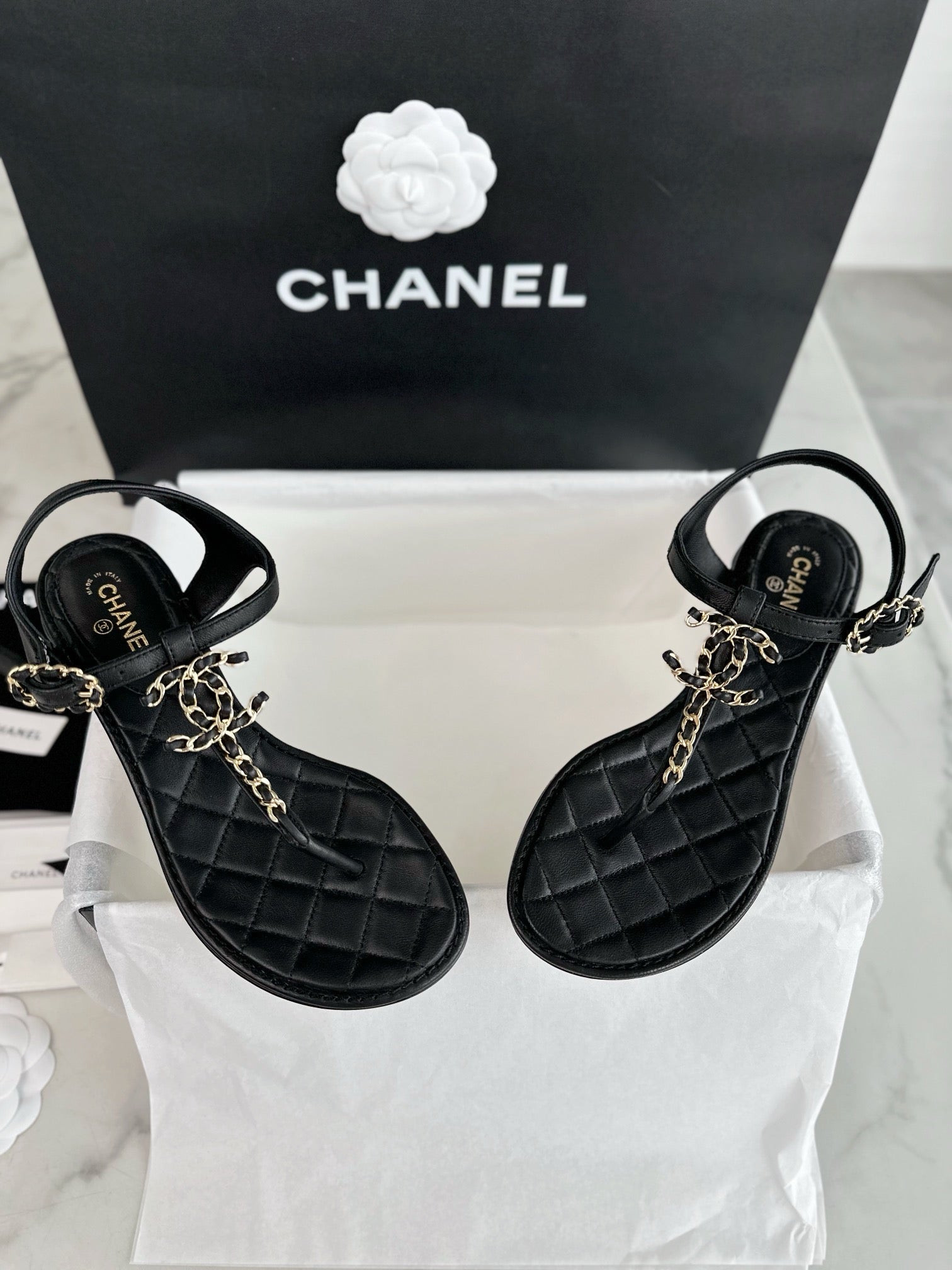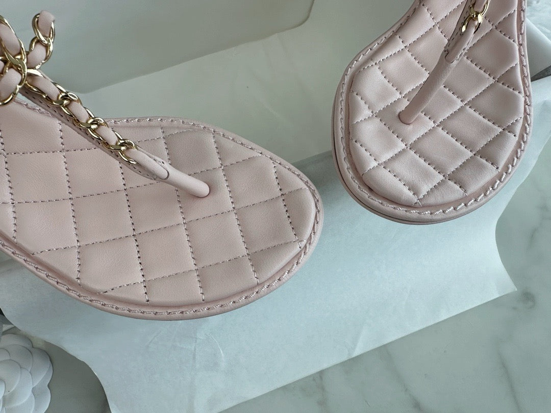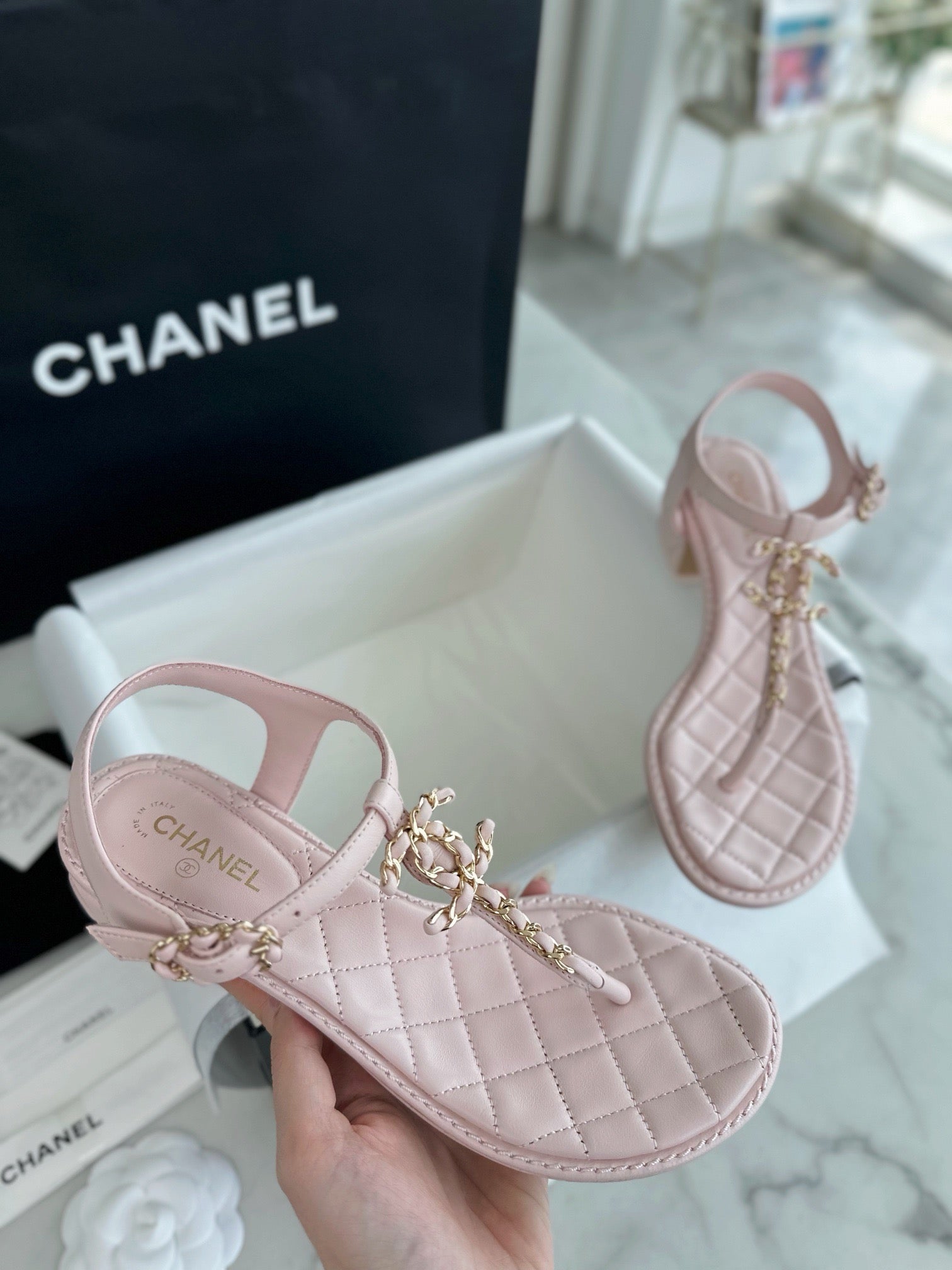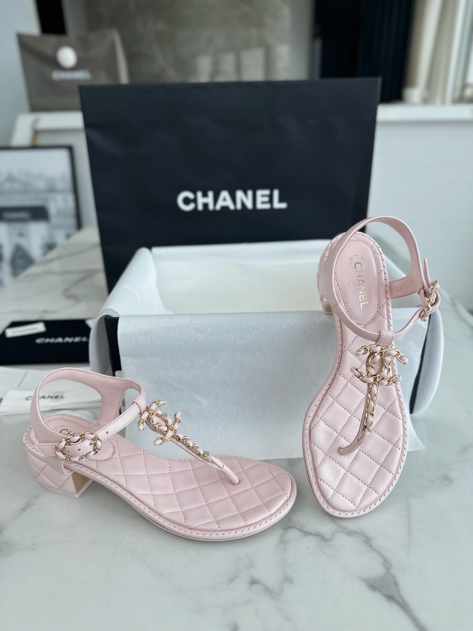 이 샌들은 샤넬의 전통적인 퀄팅 디자인을 기반으로 제작되었으며, 부드러운 가죽 소재에 정교한 스티치가 더해져 정제된 실루엣을 완성합니다. 발등을 감싸는 스트랩에는 금장 체인과 더블 C 로고가 장식되어 있어 브랜드의 아이덴티티를 강하게 드러냅니다.