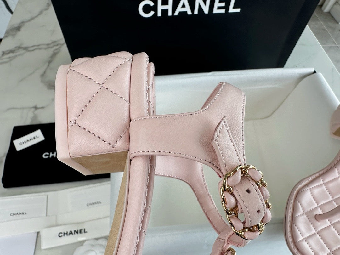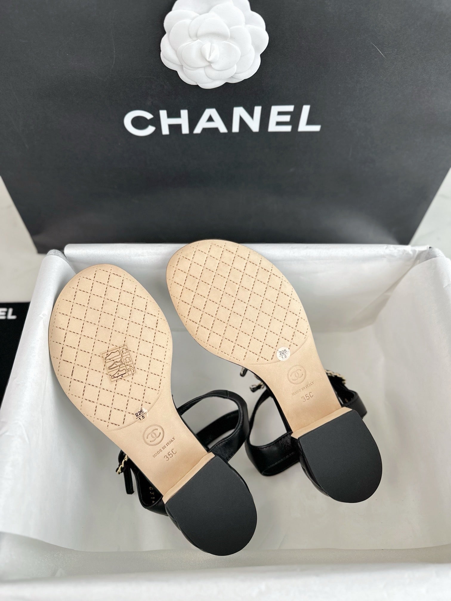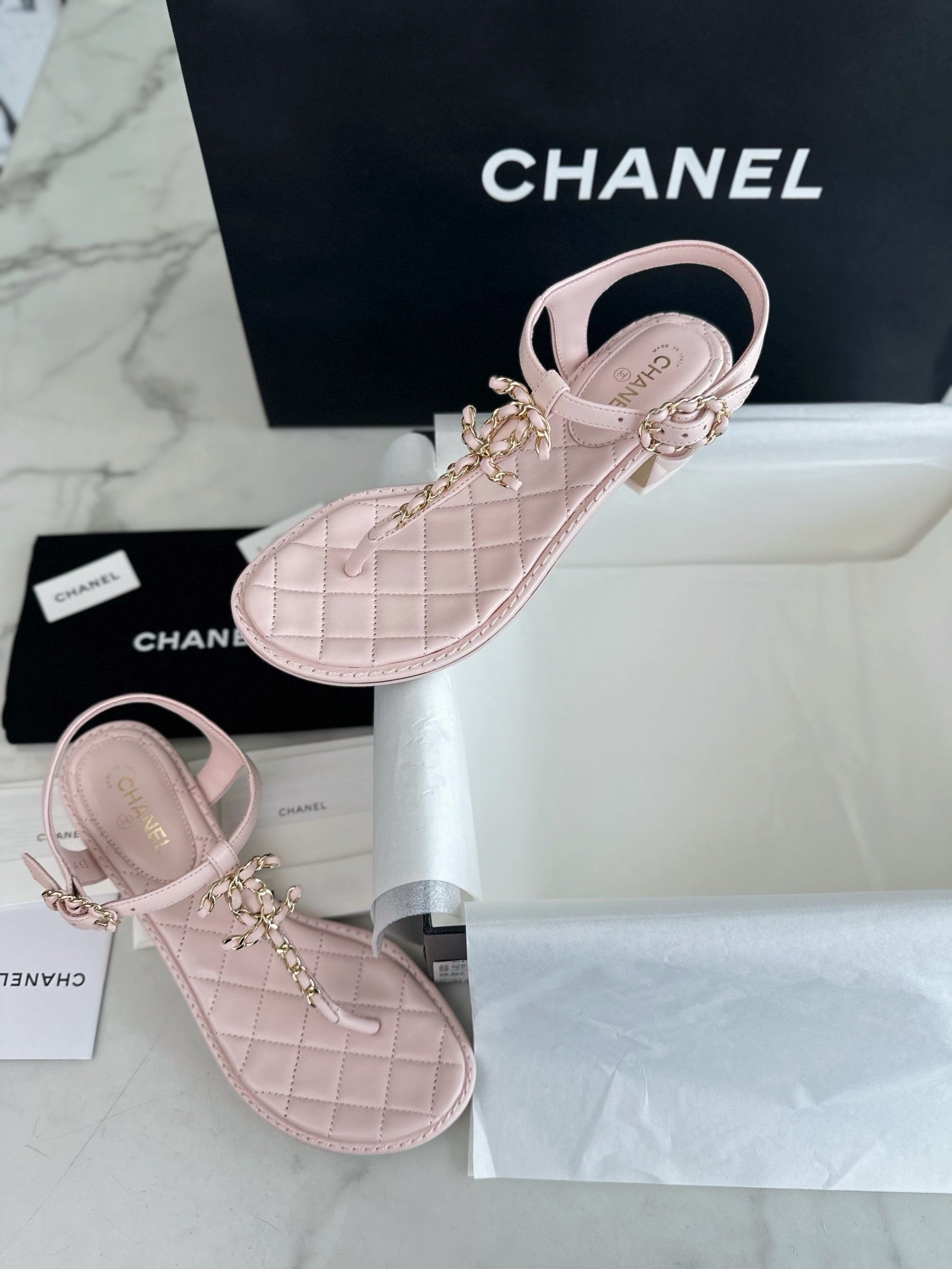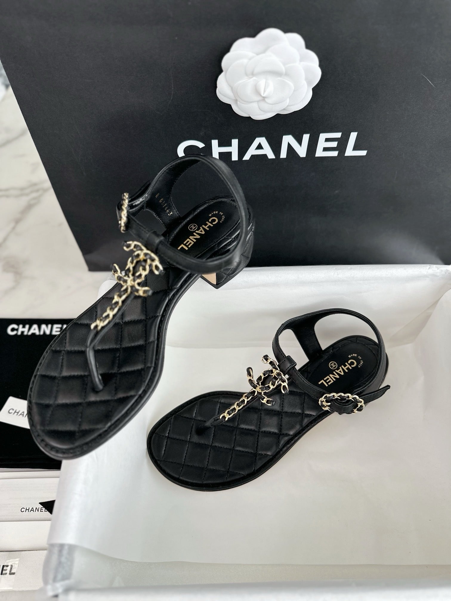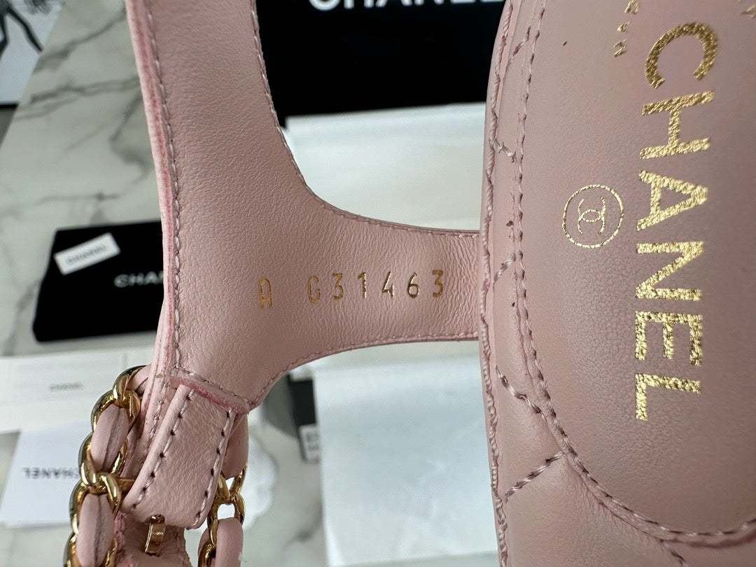 이 샌들은 샤넬의 전통적인 퀄팅 디자인을 기반으로 제작되었으며, 부드러운 가죽 소재에 정교한 스티치가 더해져 정제된 실루엣을 완성합니다. 발등을 감싸는 스트랩에는 금장 체인과 더블 C 로고가 장식되어 있어 브랜드의 아이덴티티를 강하게 드러냅니다.