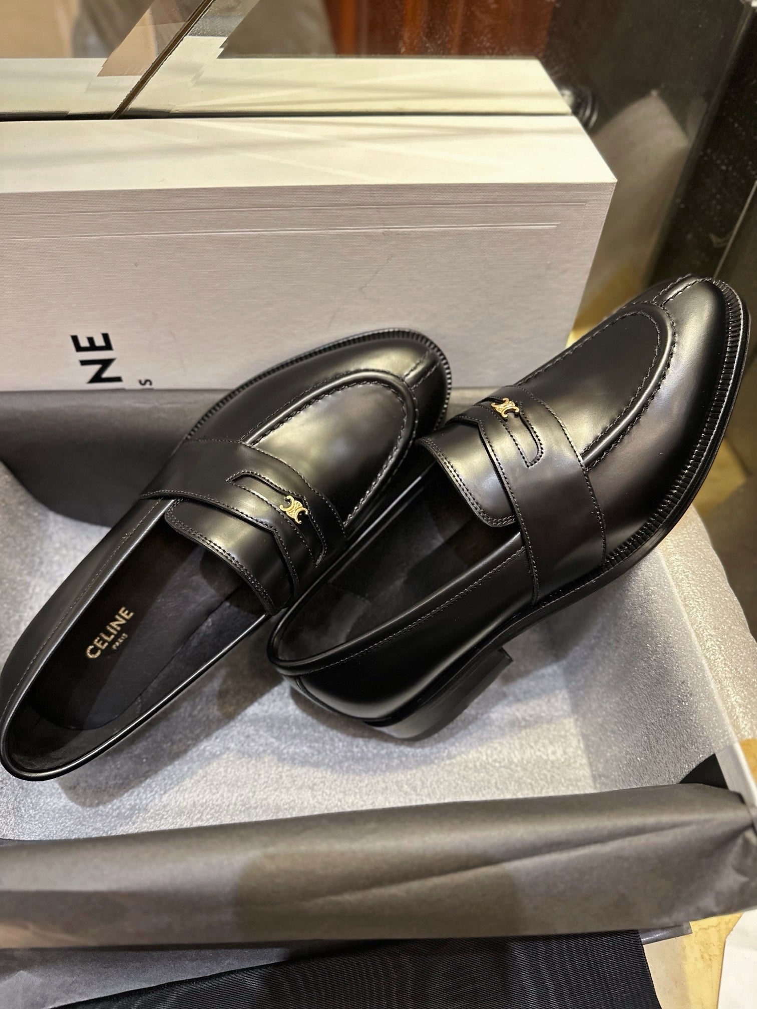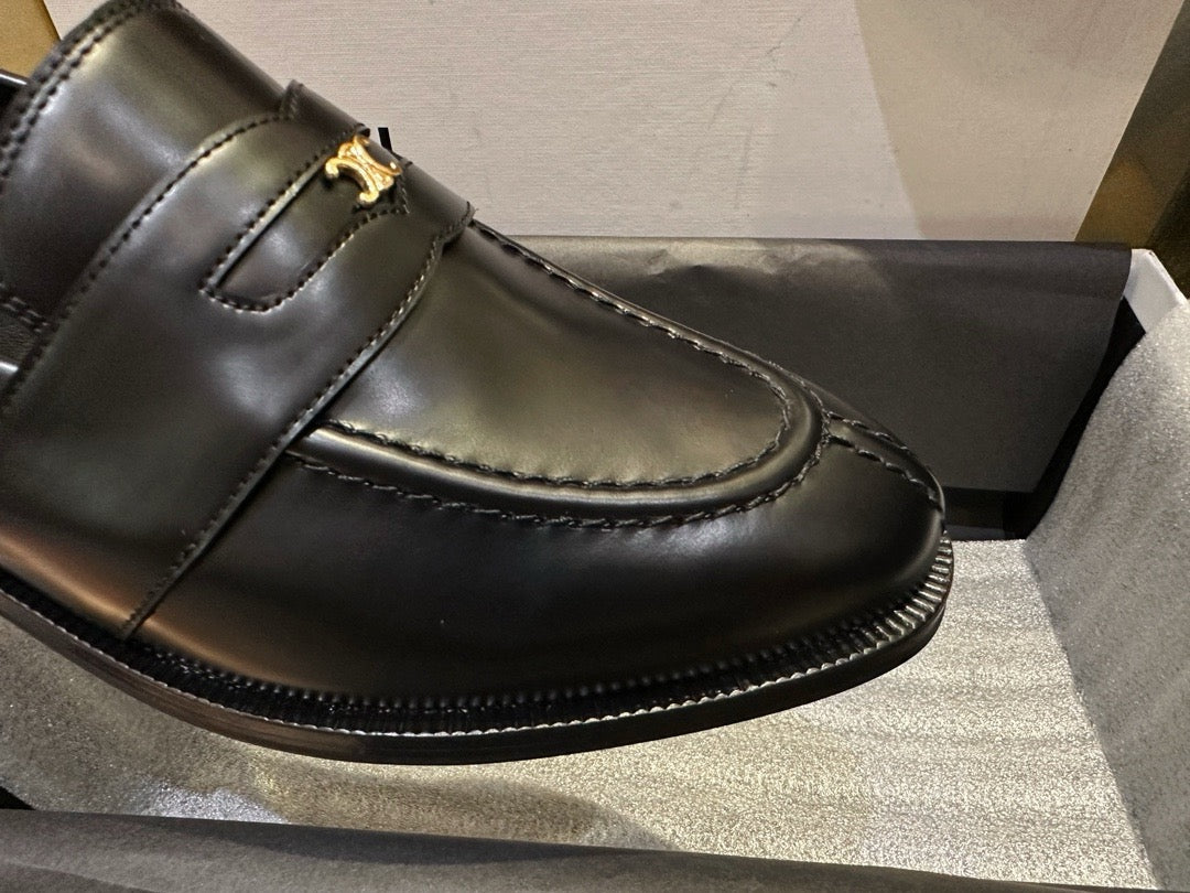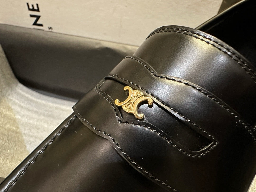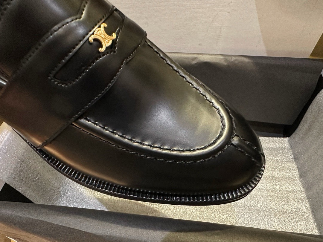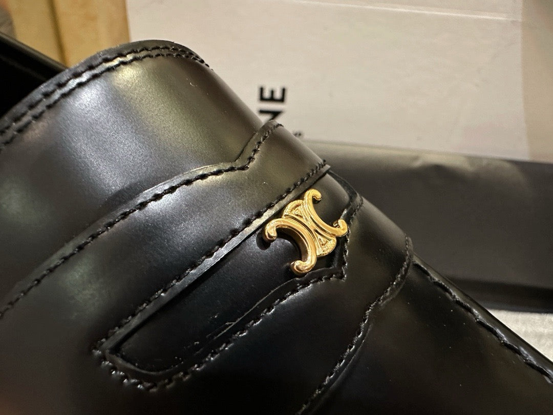 트리옹프(Triomphe) 로고가 로퍼의 메탈 하드웨어로 세련되게 장식되어 있으며, 셀린느 브랜드 고유의 심플하면서도 강한 아이덴티티를 담고 있습니다.
