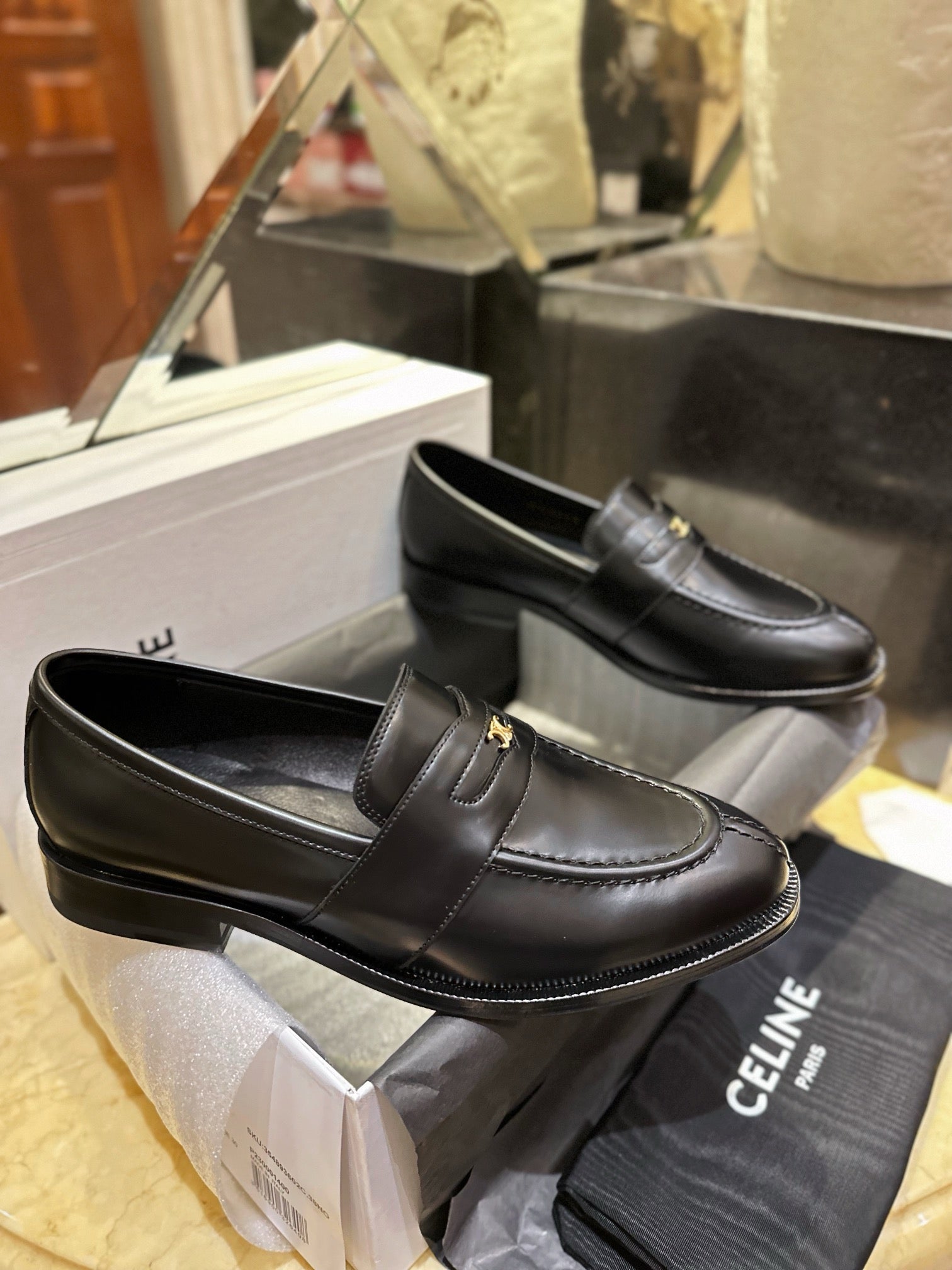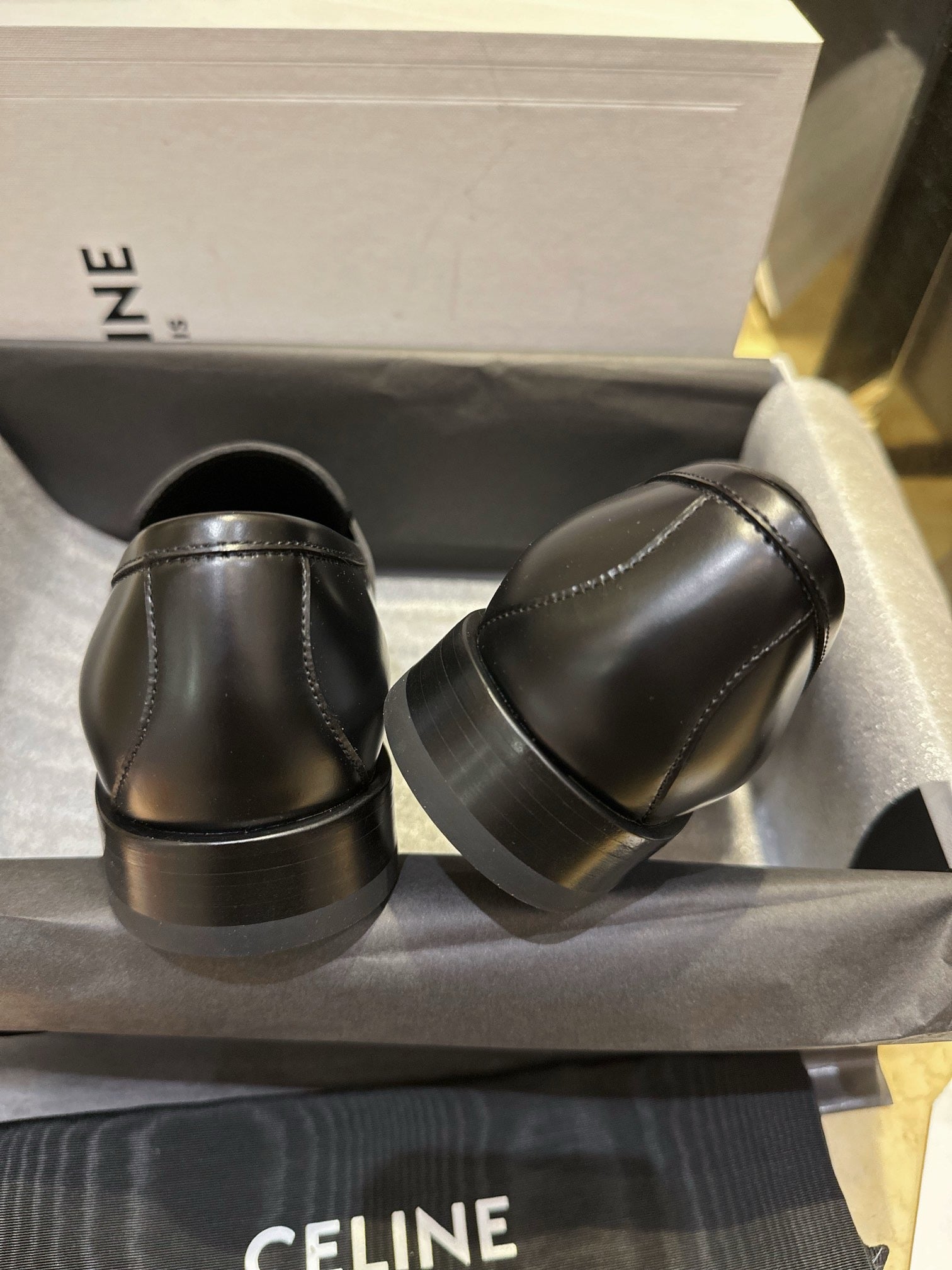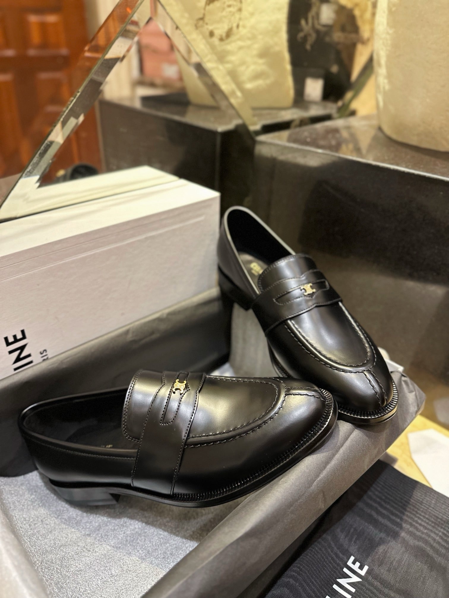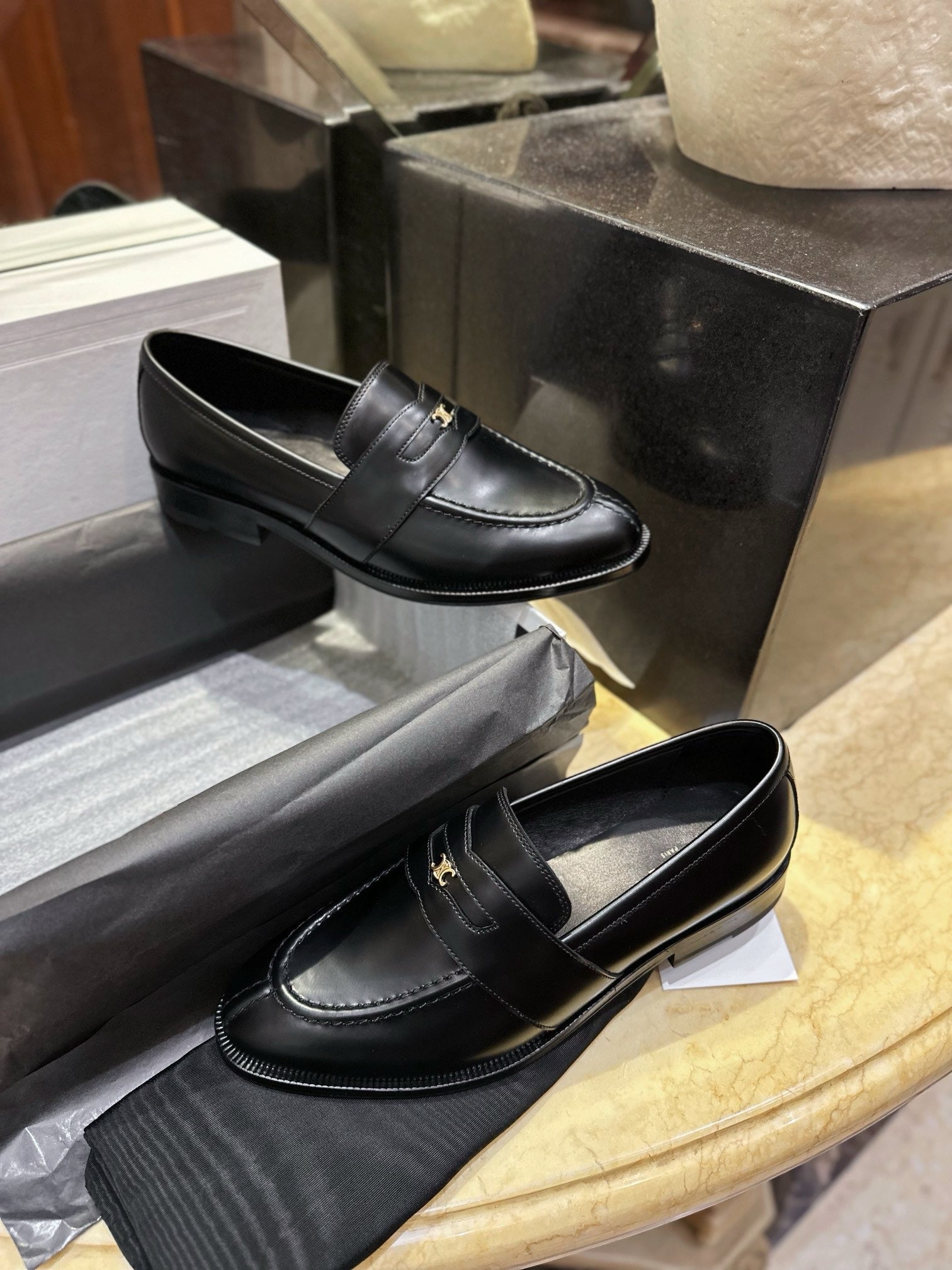 트리옹프(Triomphe) 로고가 로퍼의 메탈 하드웨어로 세련되게 장식되어 있으며, 셀린느 브랜드 고유의 심플하면서도 강한 아이덴티티를 담고 있습니다.