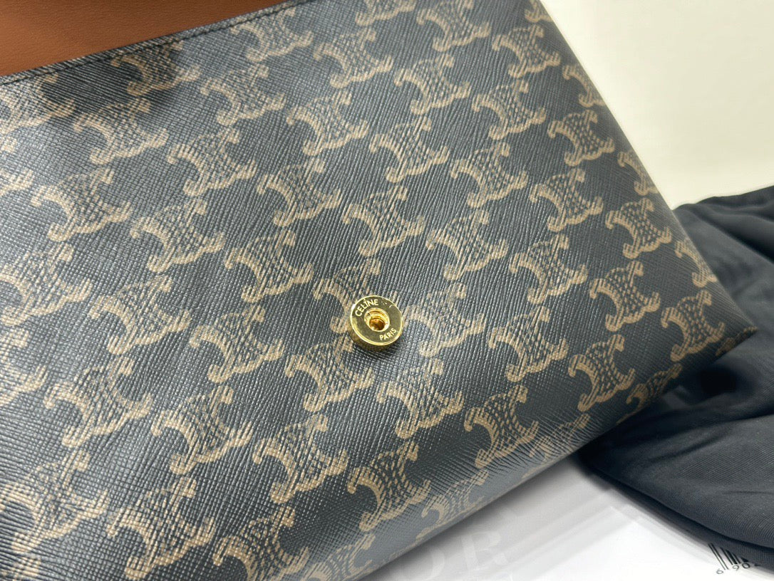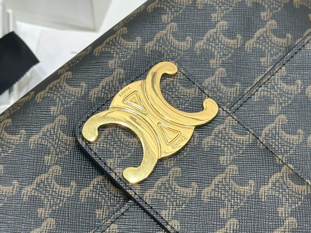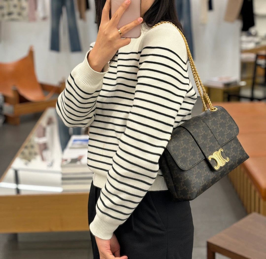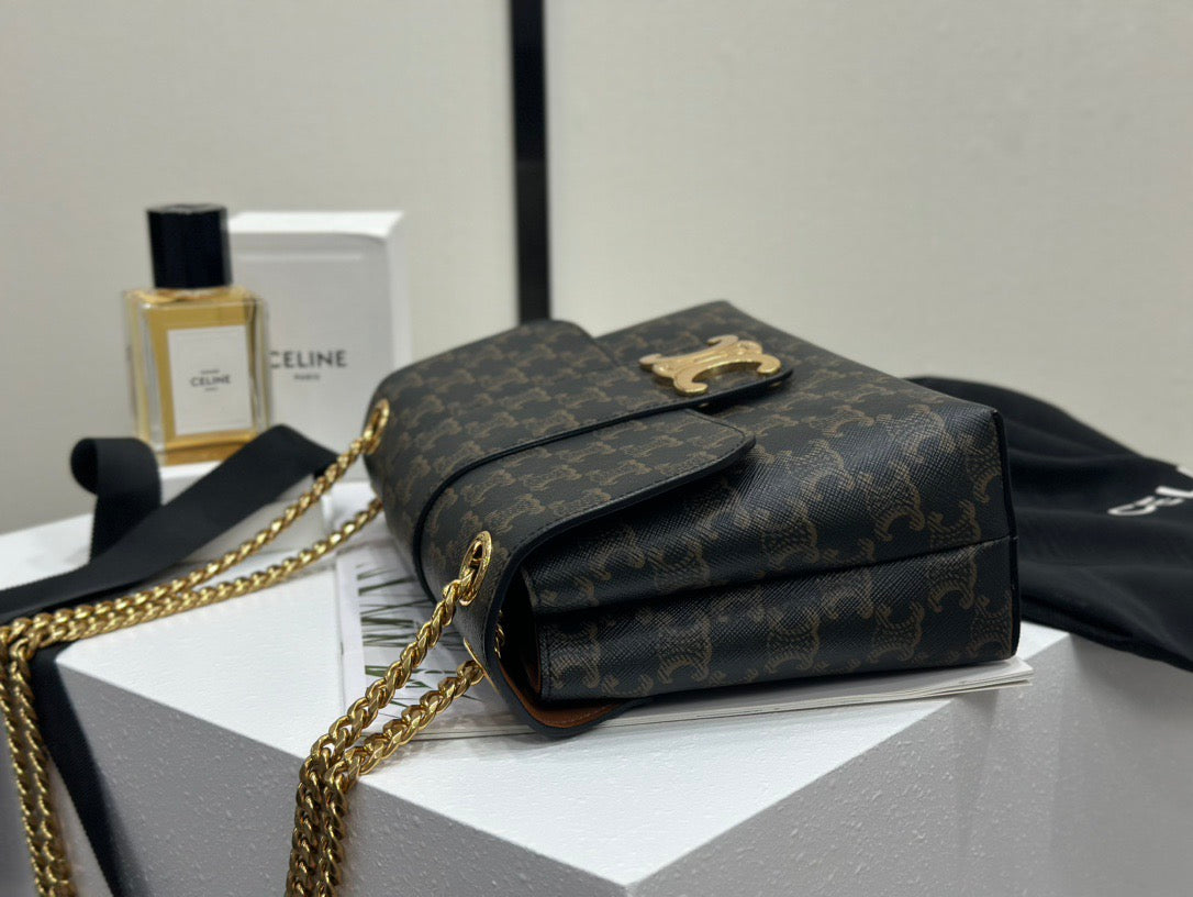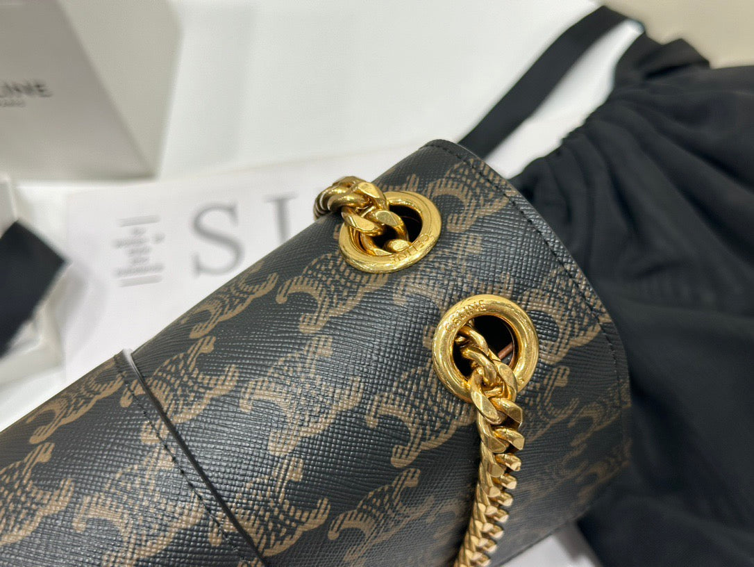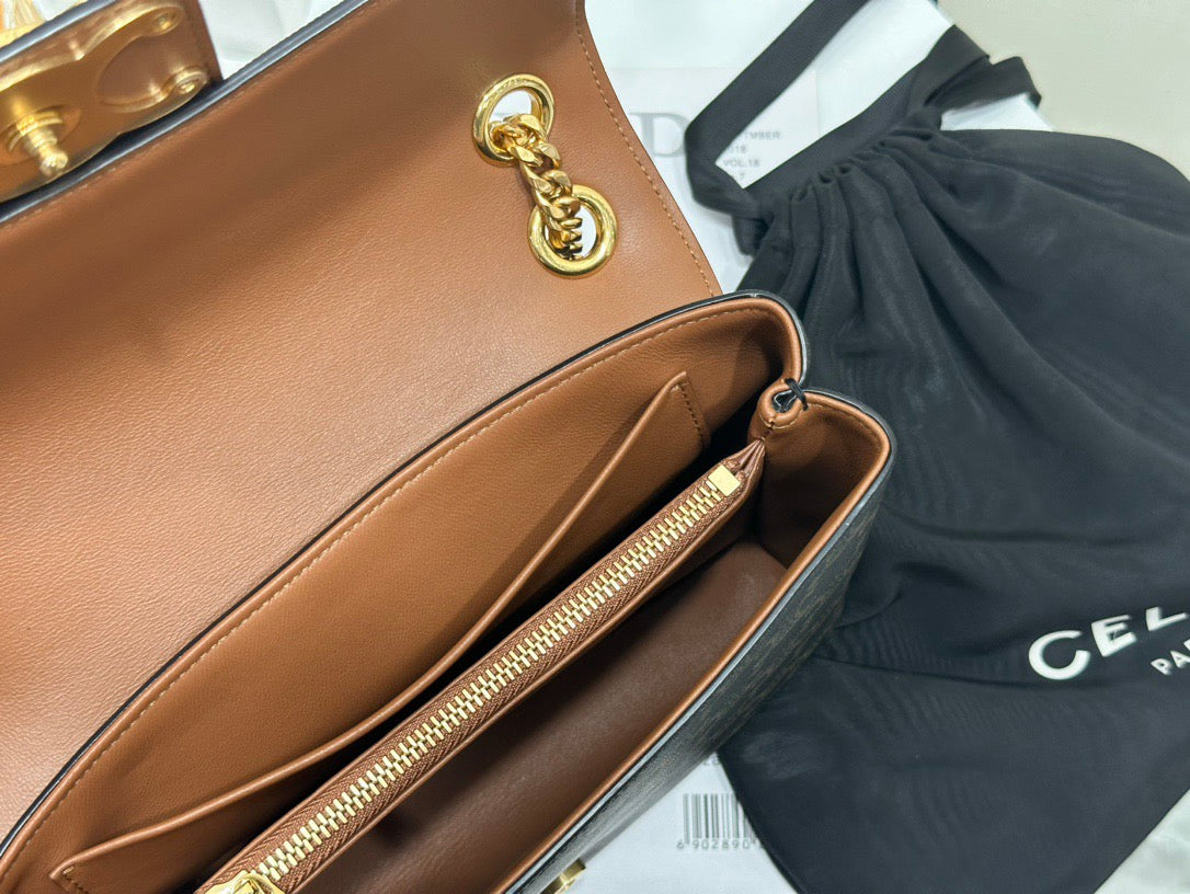직사각형 구조와 트라이엄프 골드 메탈 클로저가 중심을 잡고 있으며, 셀린느의 트리옹프 캔버스와 가죽 트리밍이 정제된 분위기를 자아냅니다. 골드 체인 스트랩은 가죽 패드와 함께 숄더백 또는 크로스백으로 다양하게 연출 가능합니다.