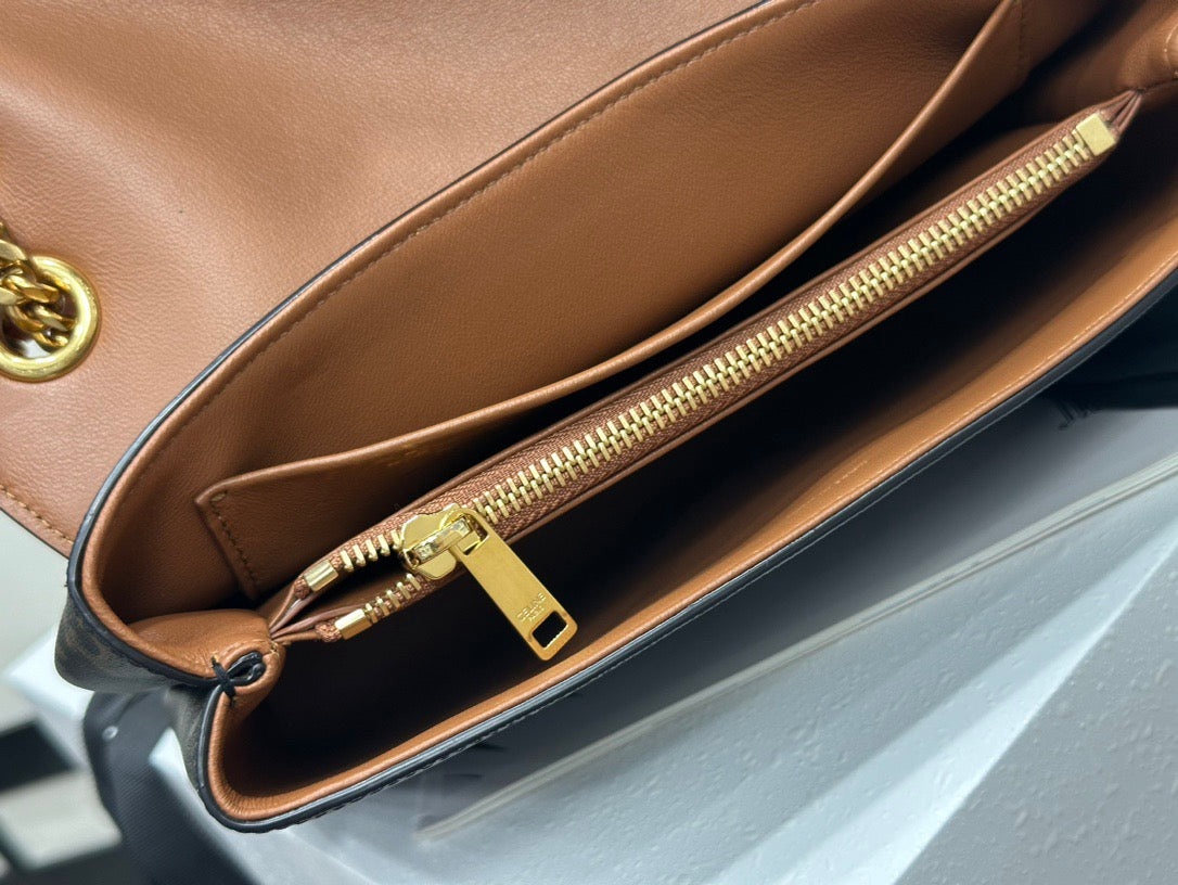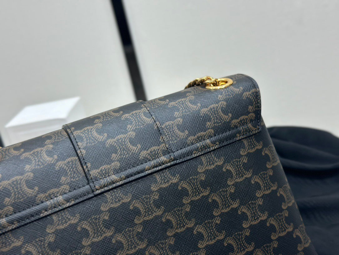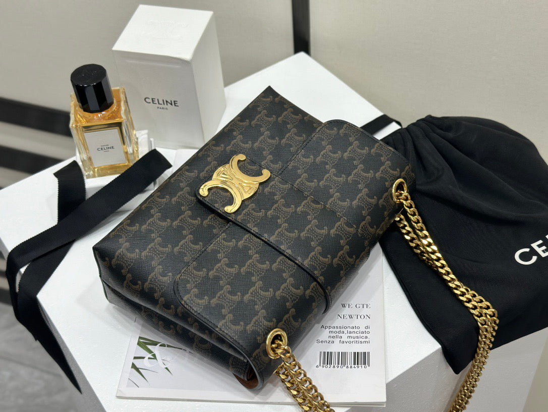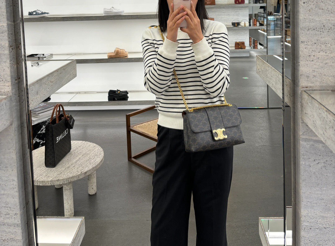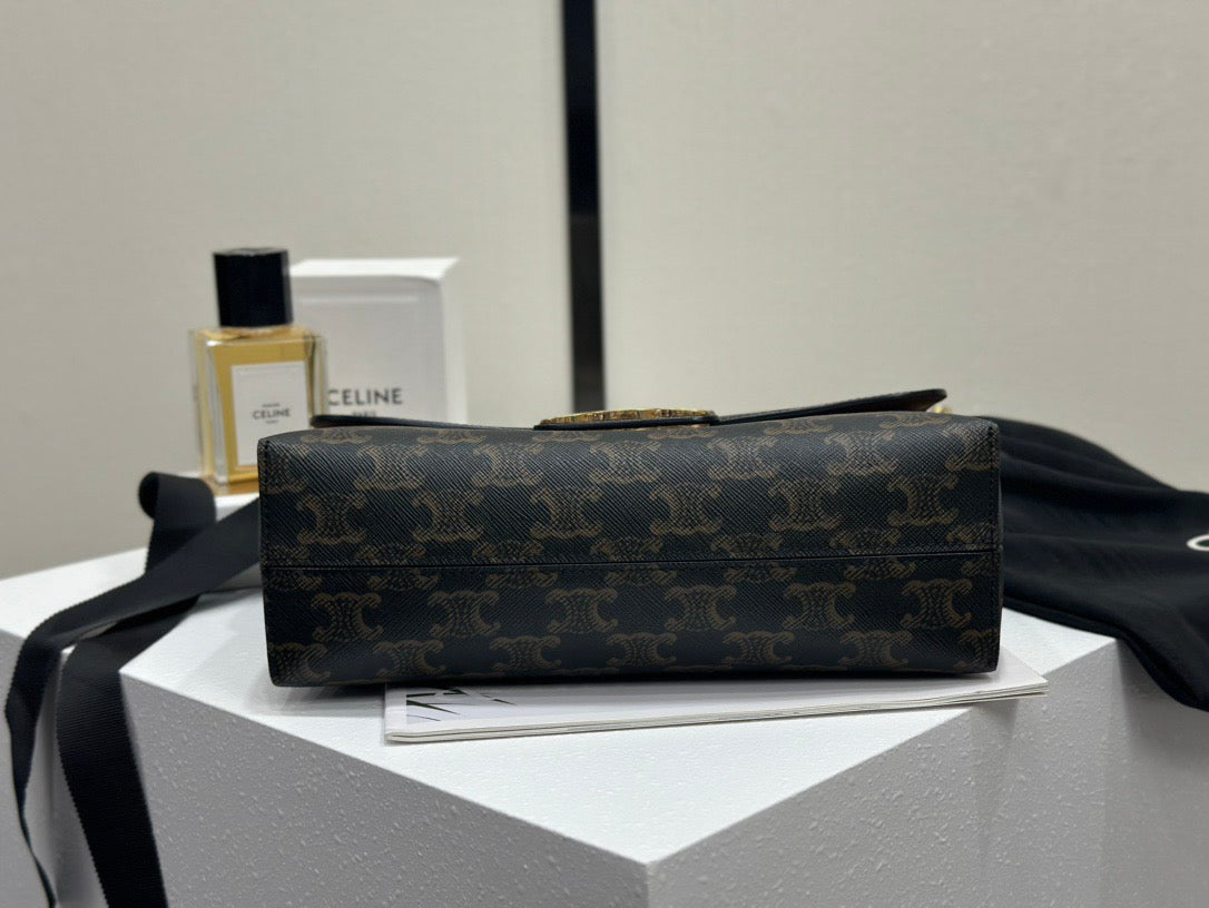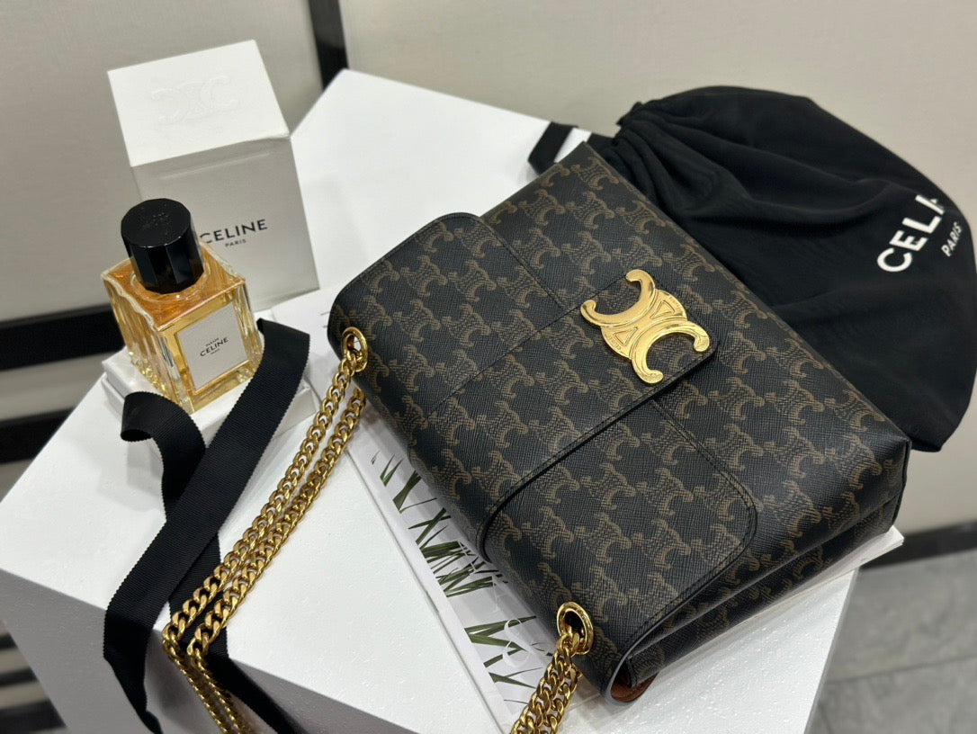 직사각형 구조와 트라이엄프 골드 메탈 클로저가 중심을 잡고 있으며, 셀린느의 트리옹프 캔버스와 가죽 트리밍이 정제된 분위기를 자아냅니다. 골드 체인 스트랩은 가죽 패드와 함께 숄더백 또는 크로스백으로 다양하게 연출 가능합니다.