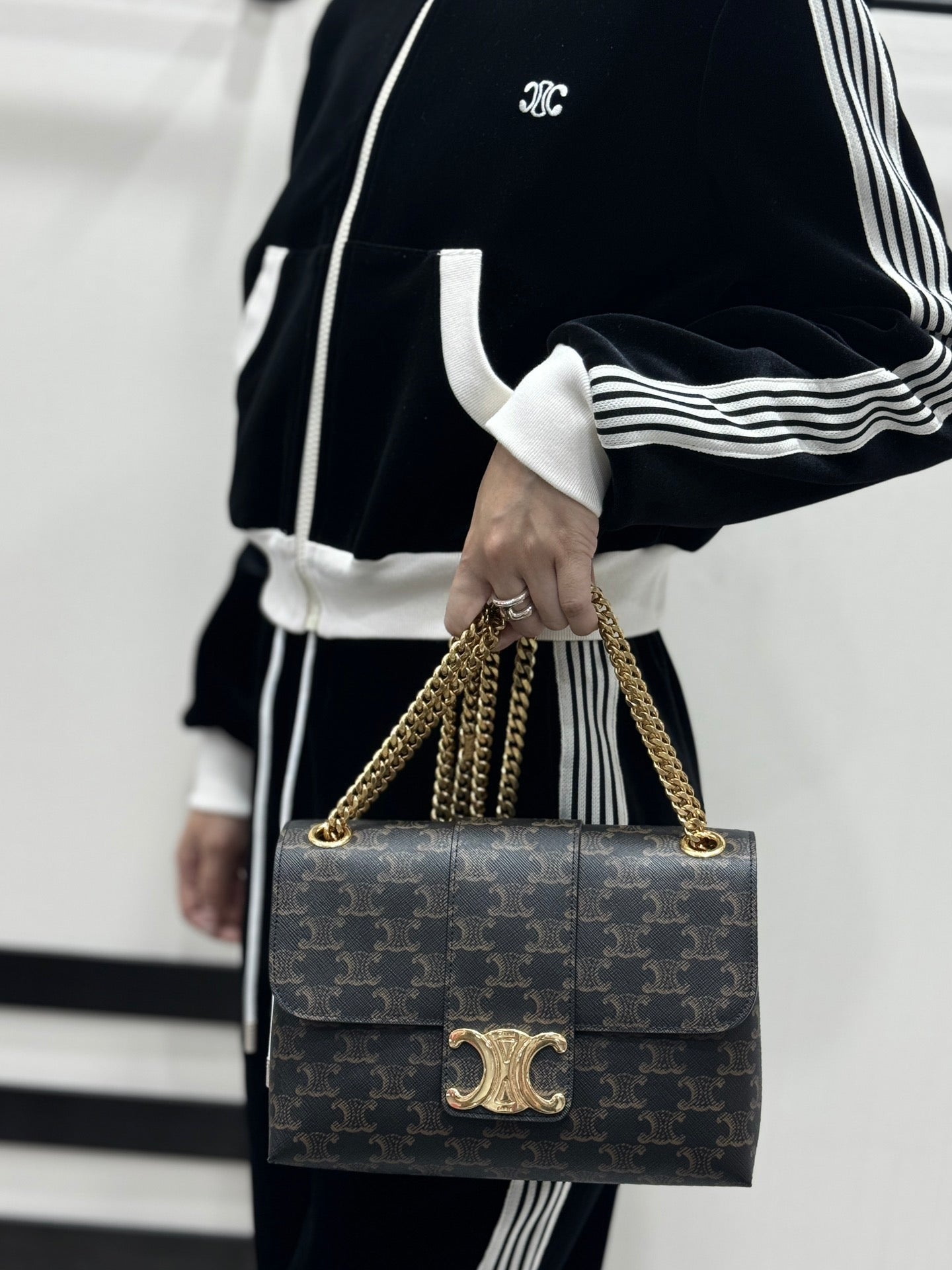 셀린느 미디움 빅투아르 체인백 캔버스(Celine Medium Victoire Chain Bag Canvas)는 셀린느의 트리옹프 모노그램이 전체적으로 적용된 클래식하고 실용적인 체인 숄더백입니다. 구조적인 실루엣과 골드 체인 스트랩이 어우러져 포멀과 데일리룩 모두에 세련된 포인트를 더합니다.