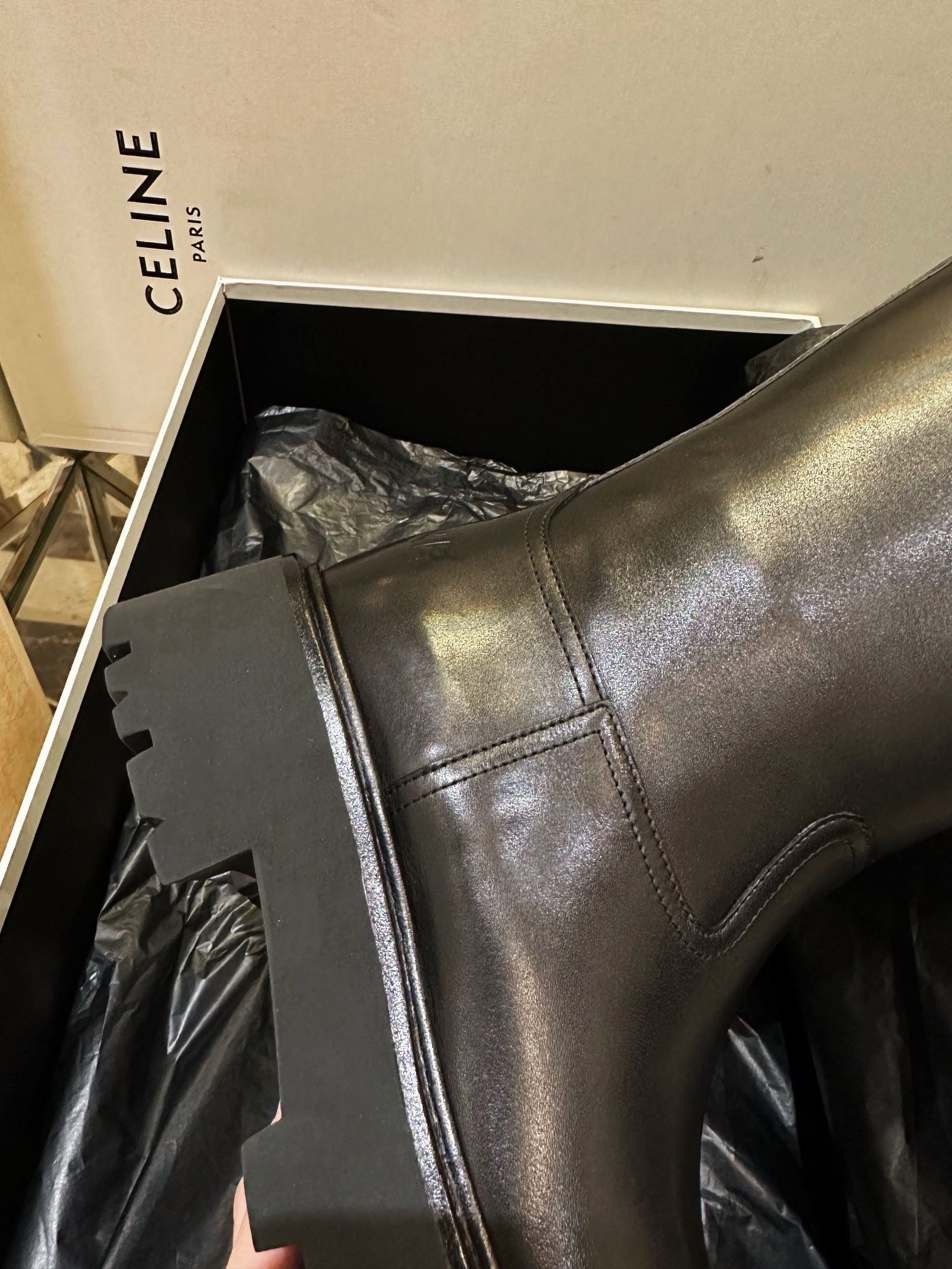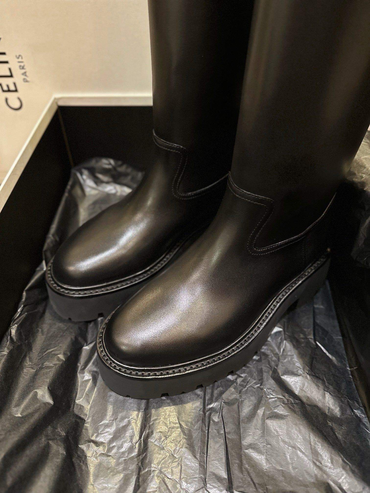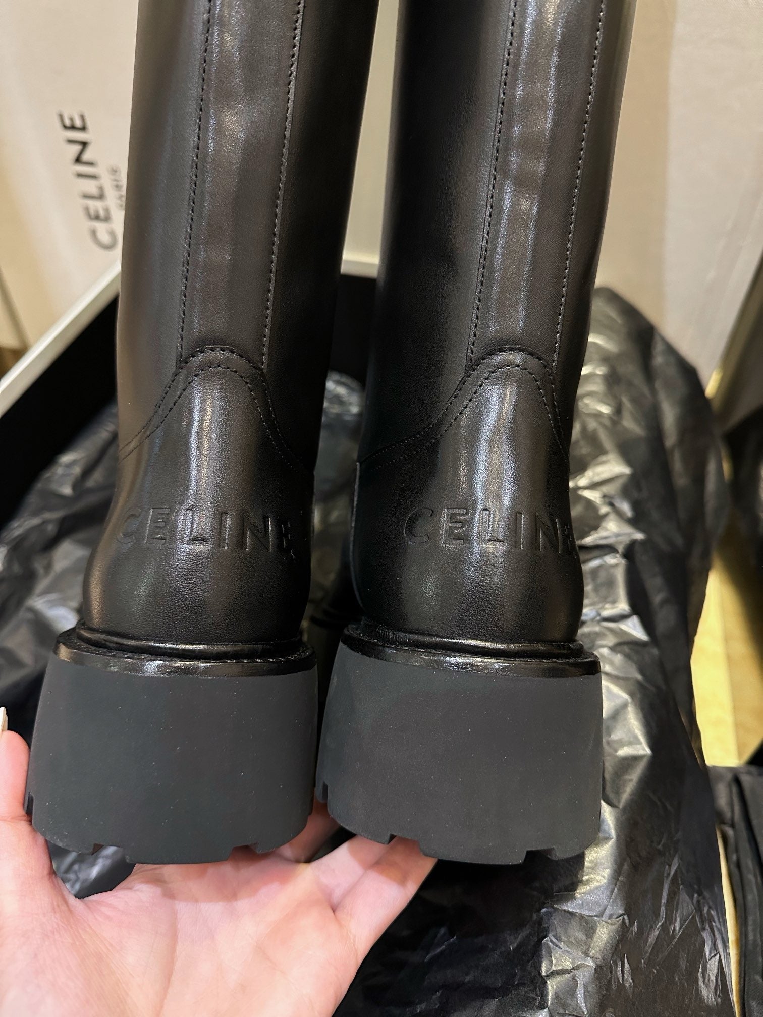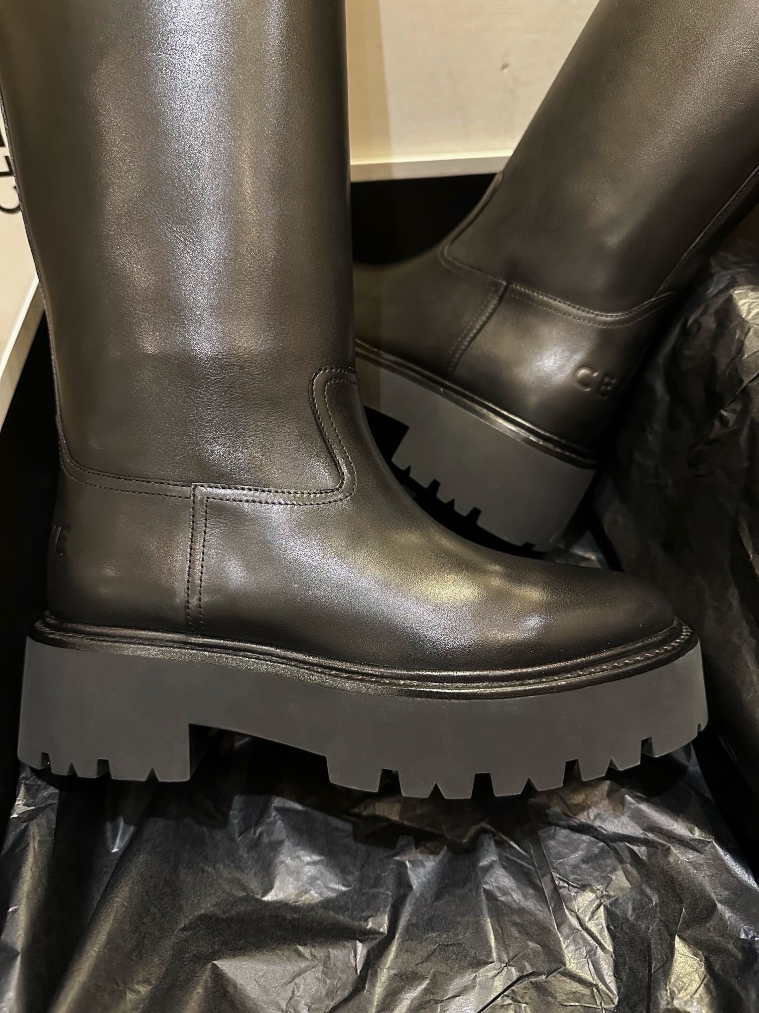 벌키한 쉐입과 두꺼운 아웃솔, 굵은 버클 스트랩이 어우러져 견고하면서도 스타일리시한 인상을 줍니다. 전체적으로 매트한 레더 질감과 셀린느만의 도시적인 무드를 극대화하며, 무릎 아래까지 오는 하이 디자인으로 착용 시 다리를 더욱 길어 보이게 해줍니다.