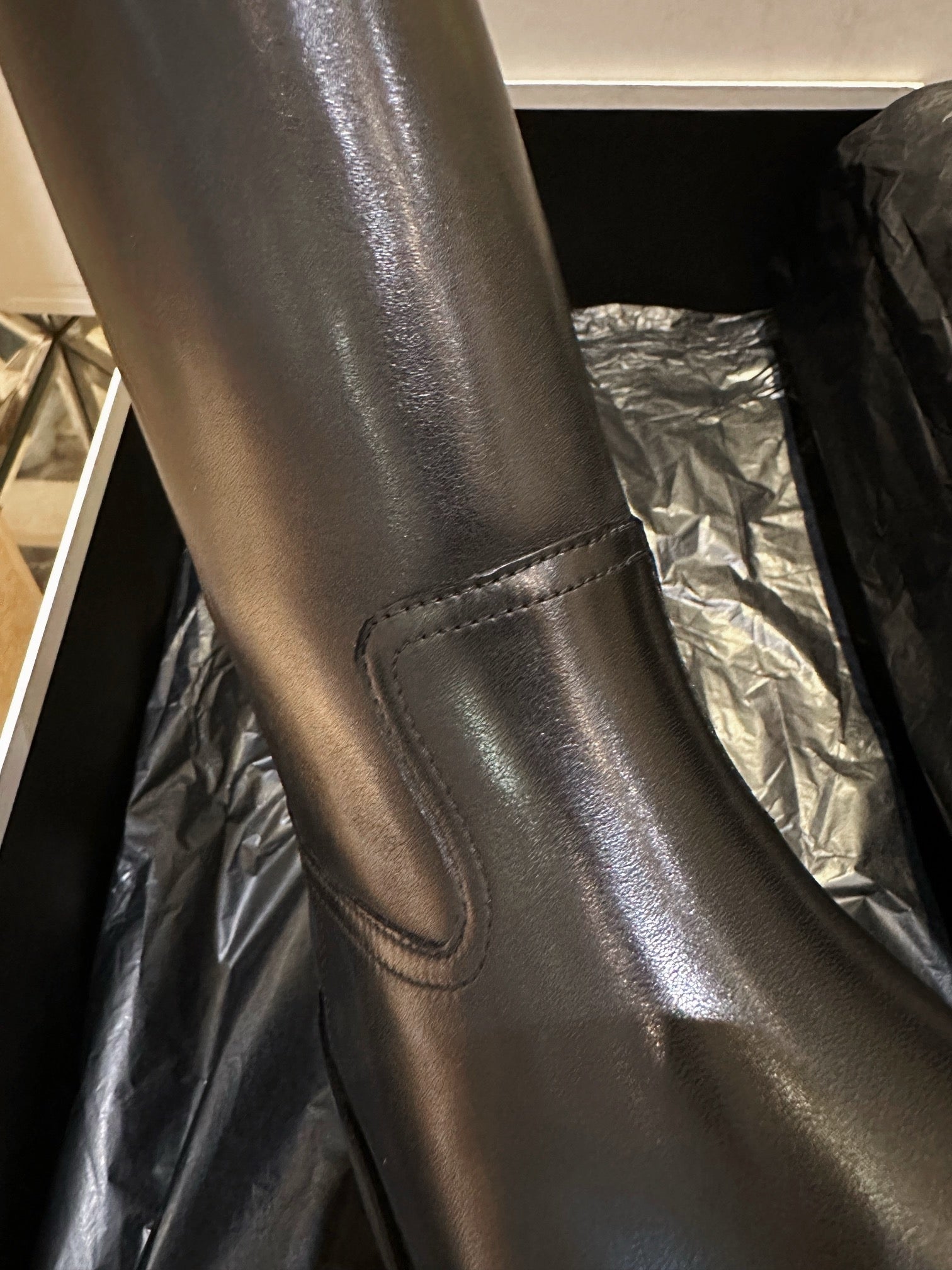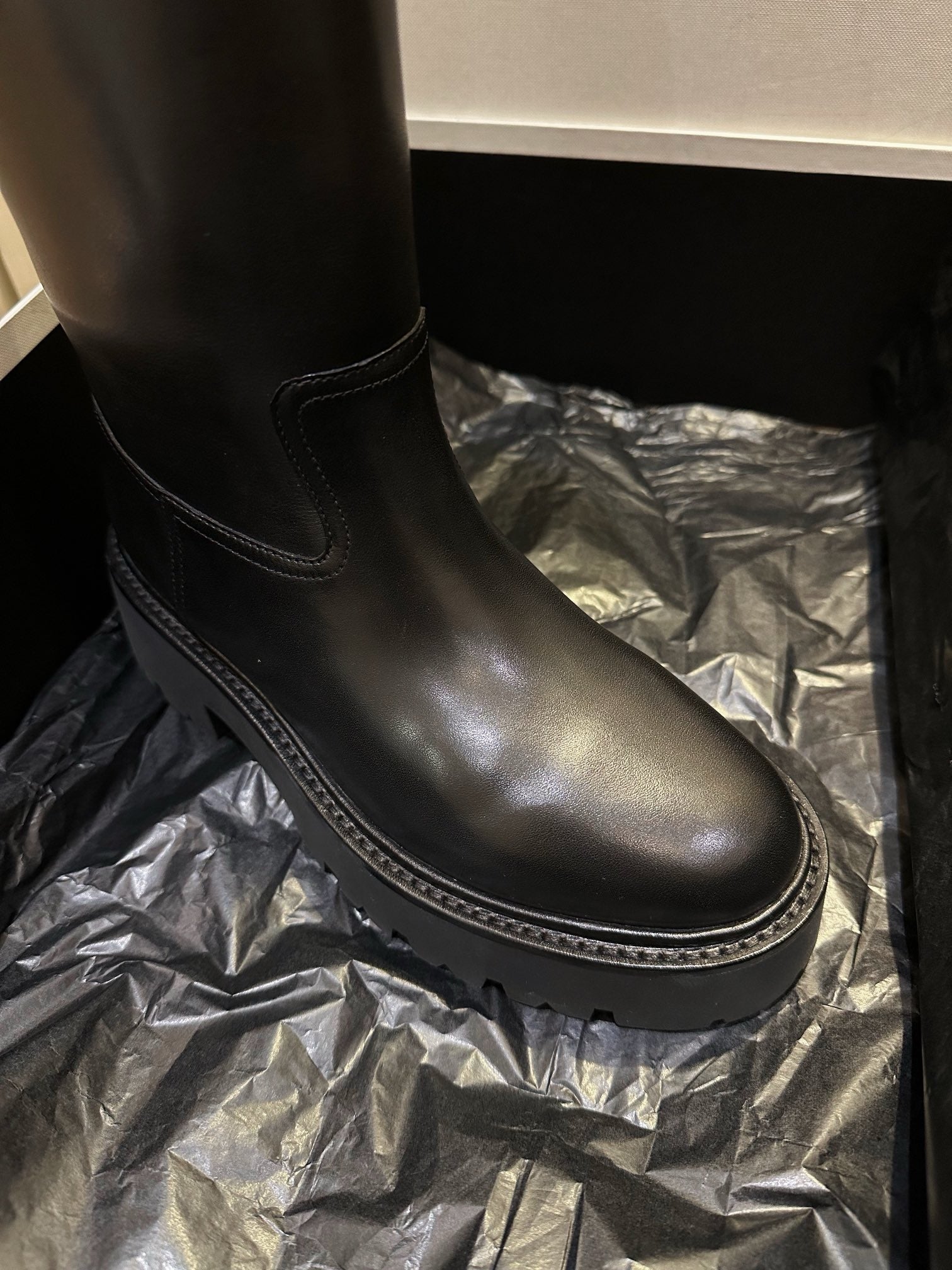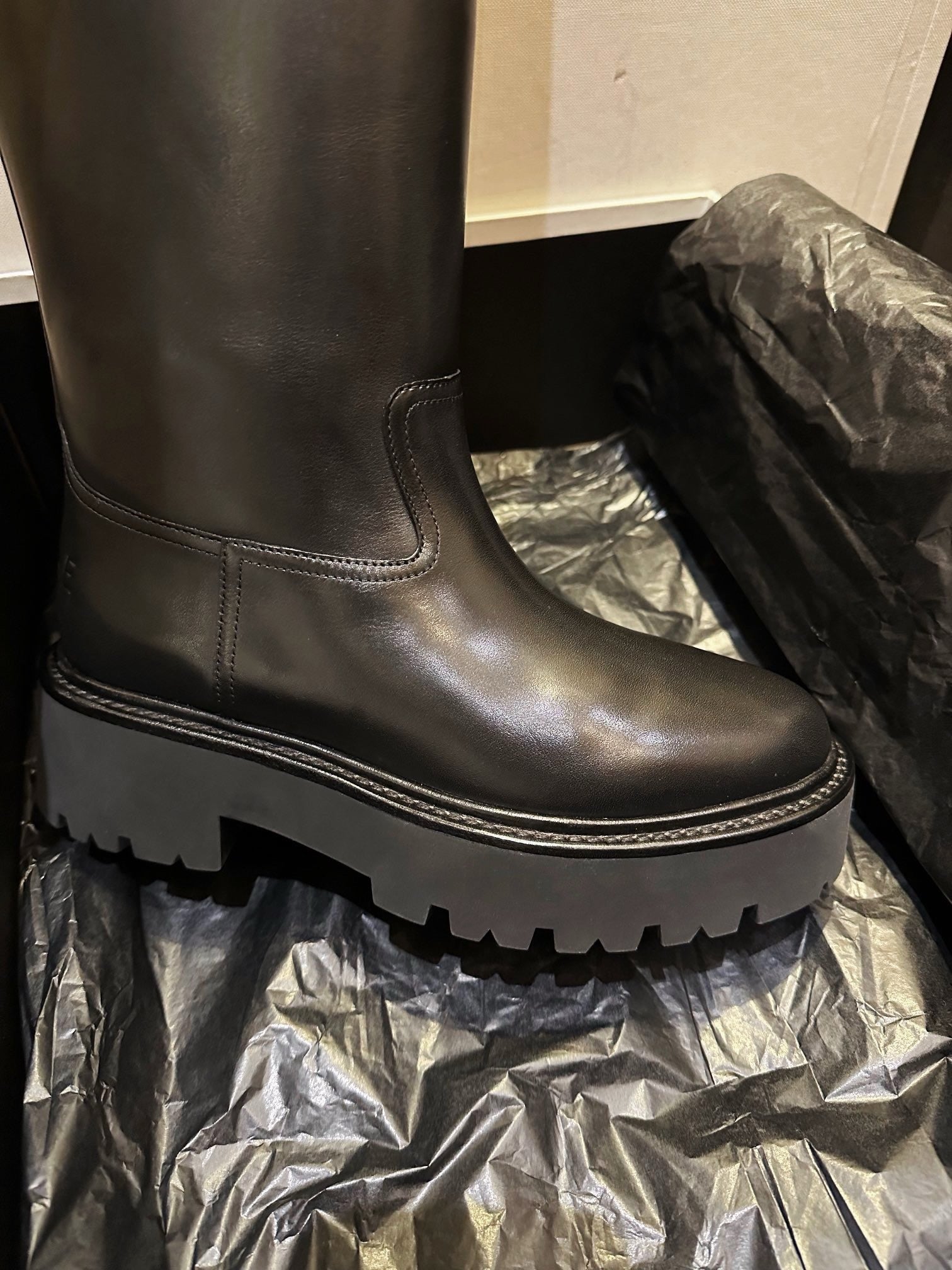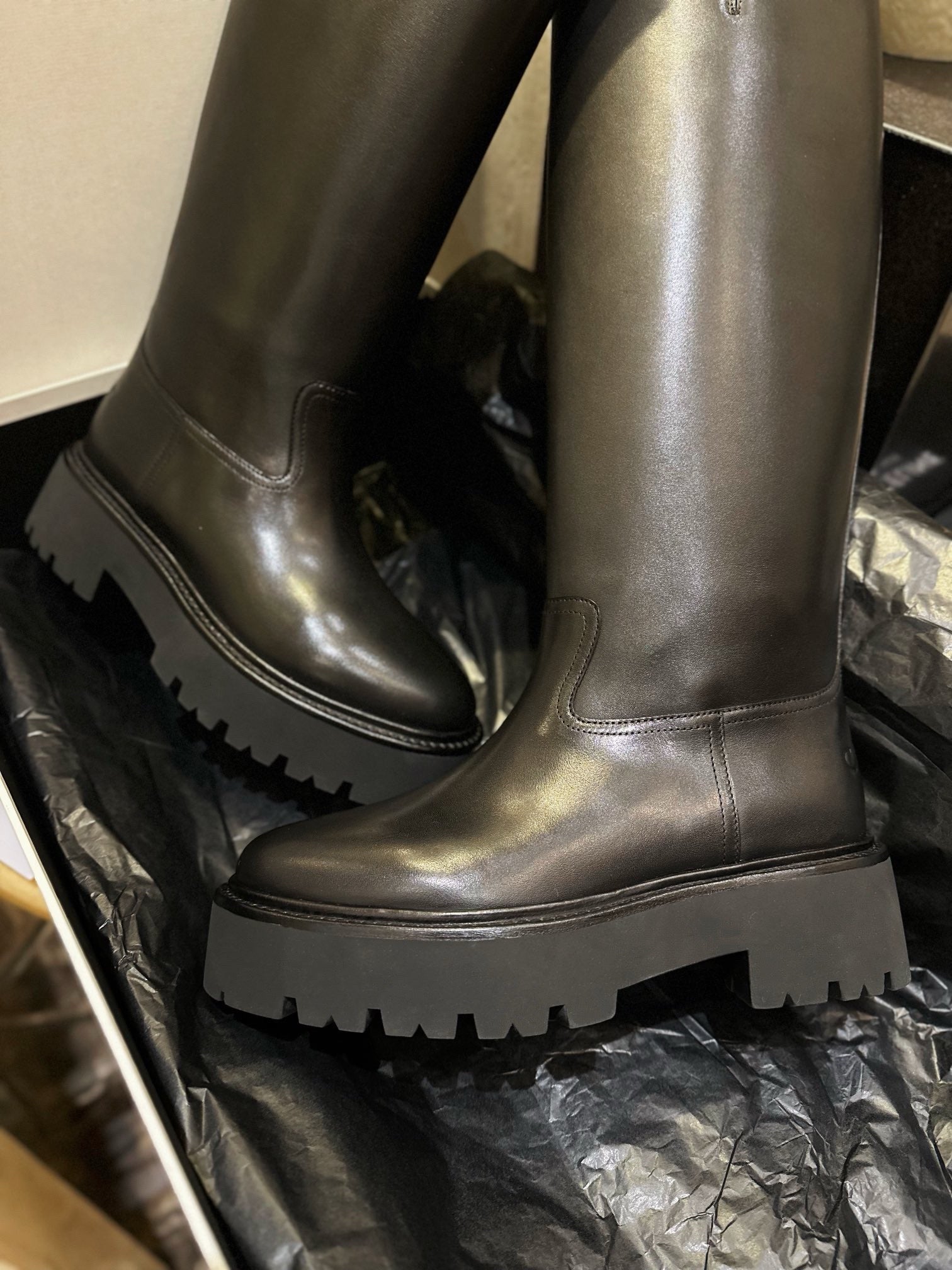 벌키한 쉐입과 두꺼운 아웃솔, 굵은 버클 스트랩이 어우러져 견고하면서도 스타일리시한 인상을 줍니다. 전체적으로 매트한 레더 질감과 셀린느만의 도시적인 무드를 극대화하며, 무릎 아래까지 오는 하이 디자인으로 착용 시 다리를 더욱 길어 보이게 해줍니다.