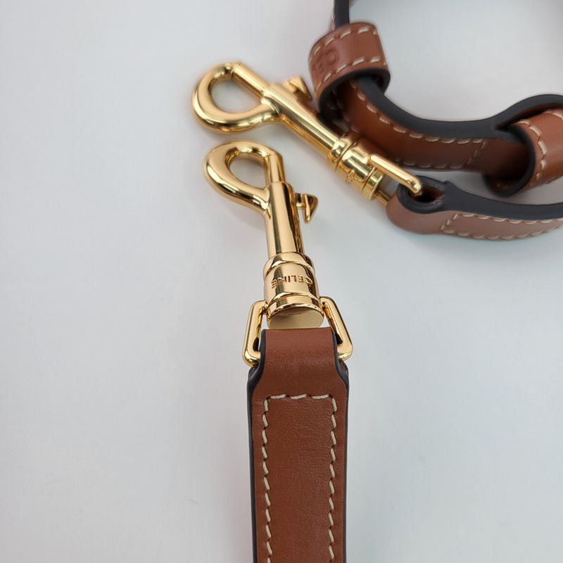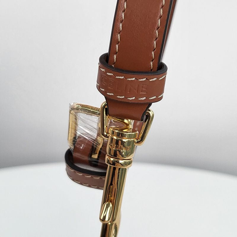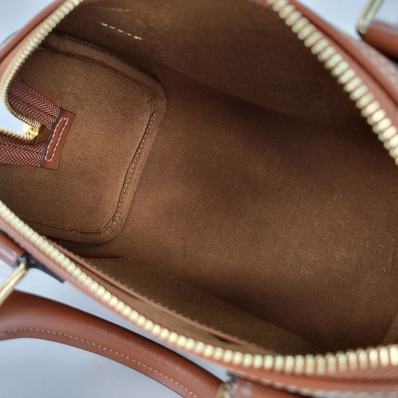 소형 보스턴백 구조에 트리옹프 모노그램 캔버스와 카프스킨 트리밍이 조화를 이루며, 전면의 셀린느 로고가 브랜드 아이덴티티를 강조합니다. 상단 더블 핸들과 탈부착 가능한 숄더 스트랩이 함께 구성되어 다양한 스타일로 연출할 수 있습니다.