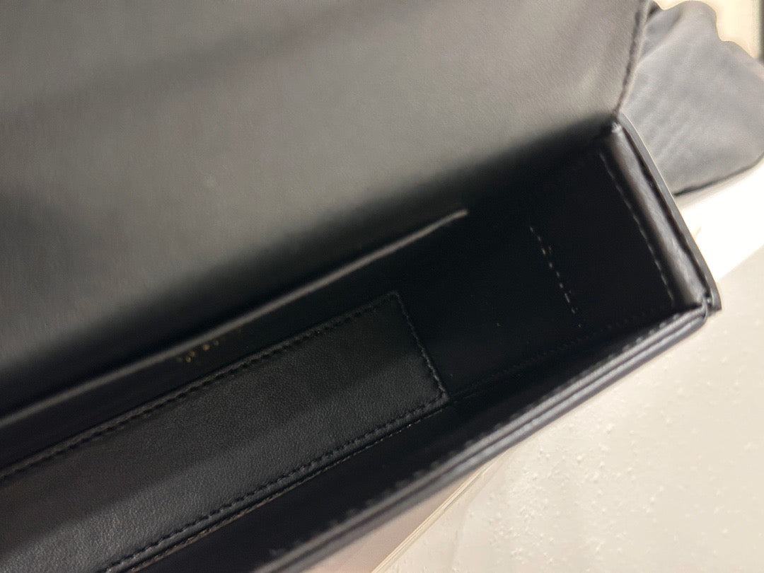 내부는 카드지갑, 립스틱, 핸드폰 등 필수품을 간단히 수납할 수 있으며, 내부 플랫 포켓도 구성되어 있어 실용성을 더합니다. 플랩은 마그네틱 클로저로 손쉽게 여닫을 수 있습니다.