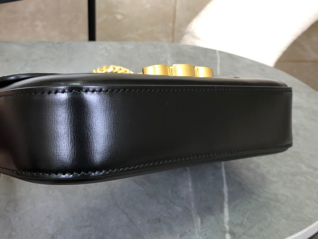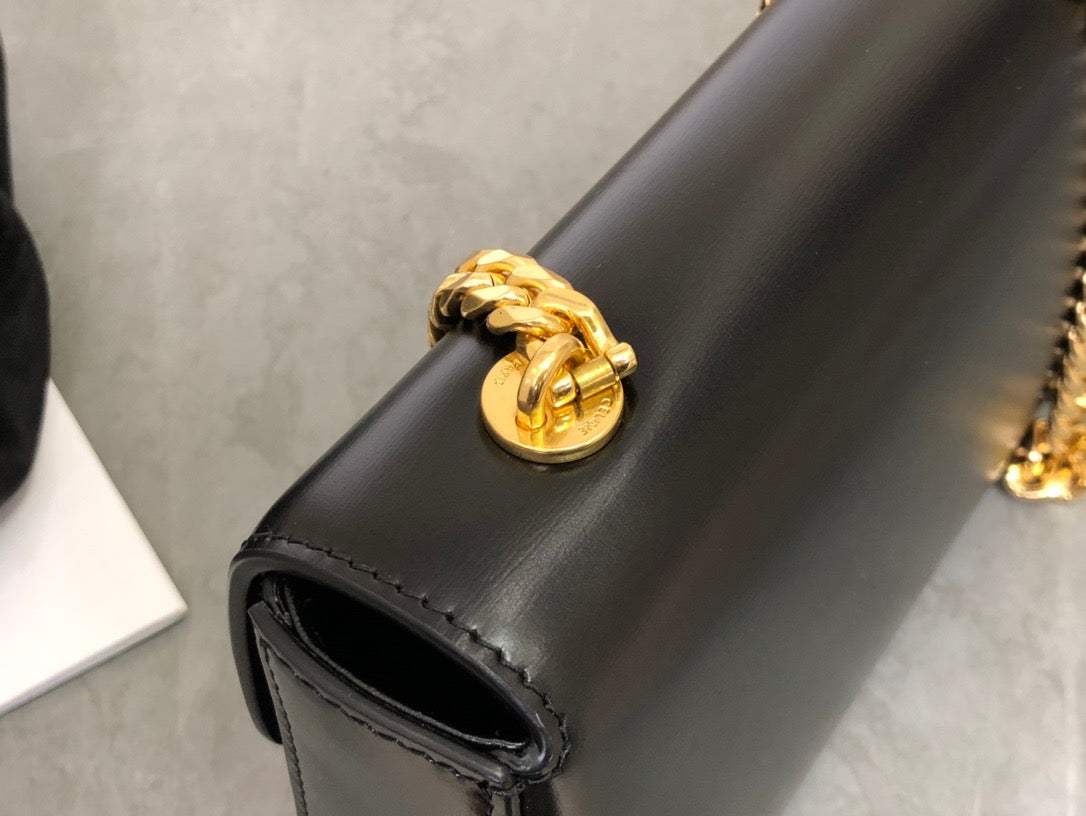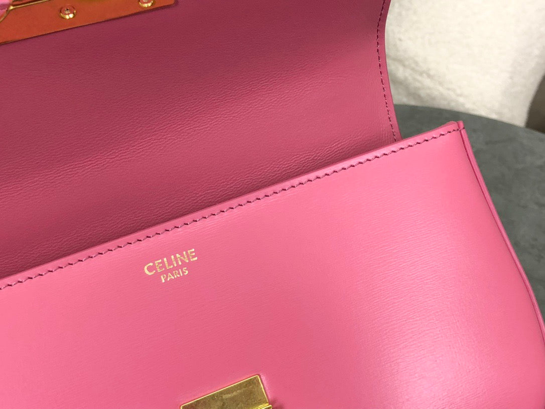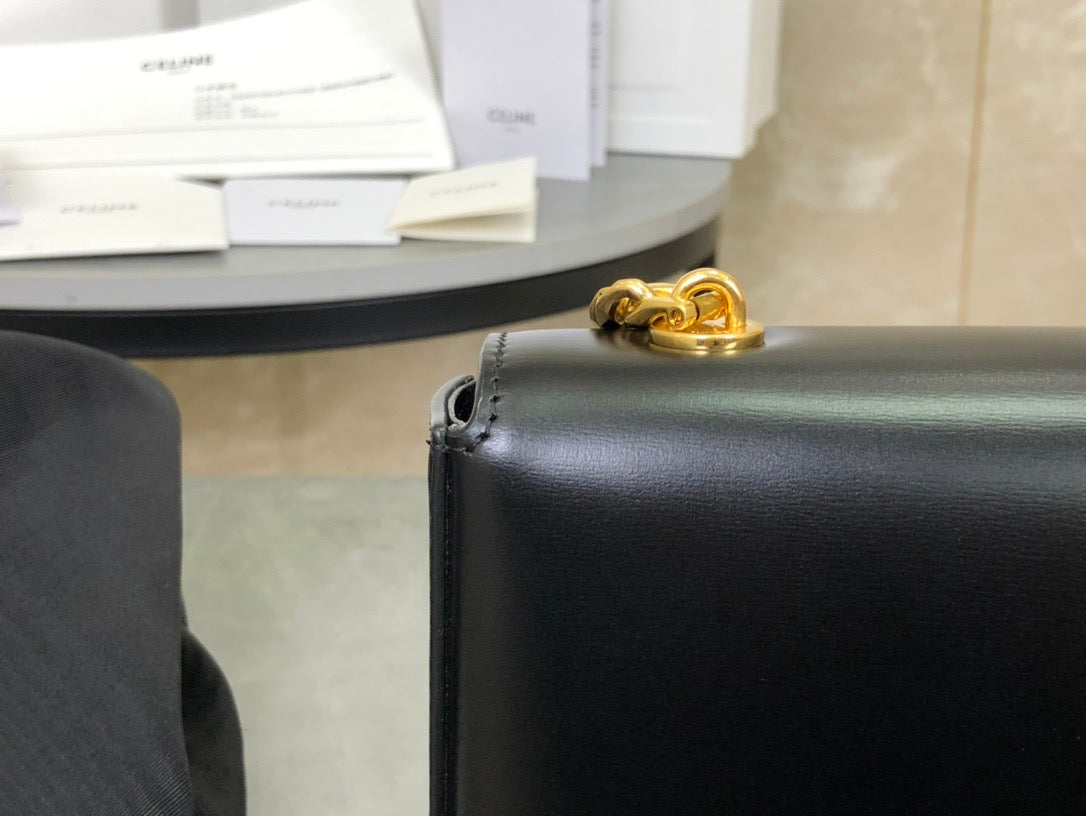 스무스 또는 그레인드 카프스킨 소재로 제작된 바디는 부드러운 촉감과 고급스러운 광택을 자랑하며, 셀린느의 상징인 트라이엄프 메탈 클로저가 중심을 잡아 클래식한 분위기를 연출합니다. 골드 메탈 체인 스트랩은 가죽 패드와 함께 어깨 착용 시 편안함을 제공합니다.