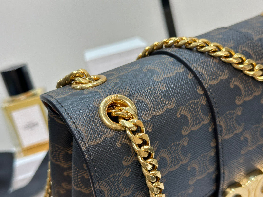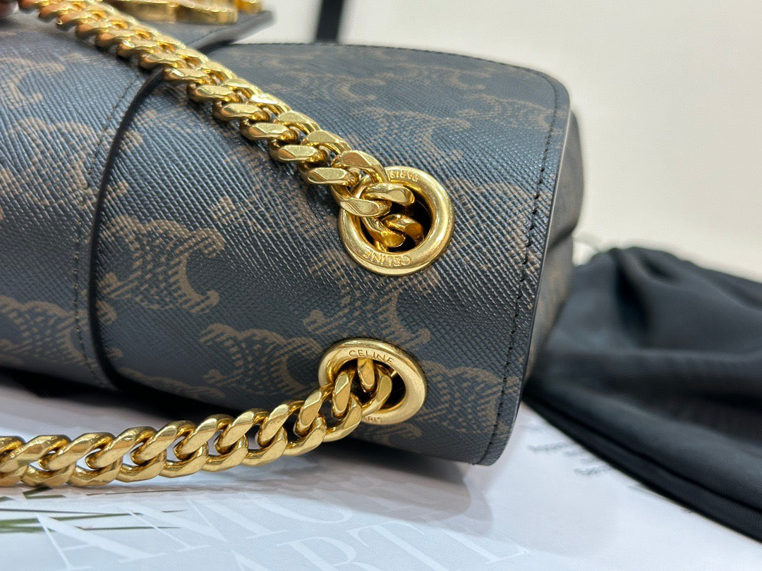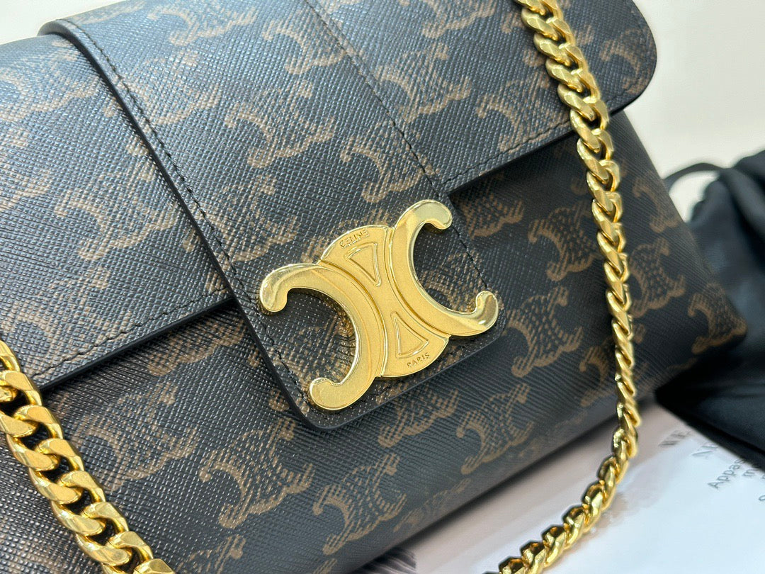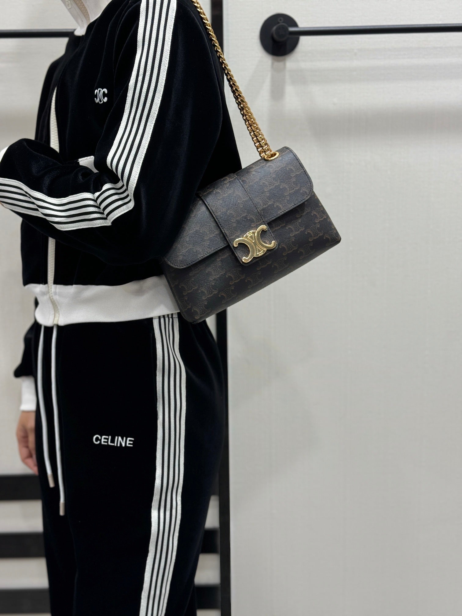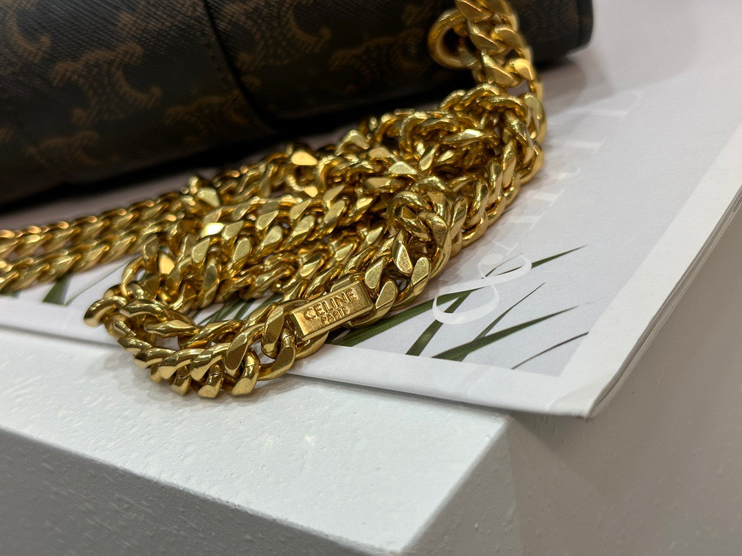 이 제품은 클래식한 셀린느 트라이엄프 모노그램 캔버스를 바탕으로, 천연 가죽 트리밍과 골드 피니시 체인 스트랩이 더해진 것이 특징입니다. 셀린느의 시그니처인 트라이엄프 금속 클로저는 정제된 고급스러움을 더하며, 직사각형의 컴팩트한 실루엣은 어떤 스타일에도 조화롭게 어울립니다.