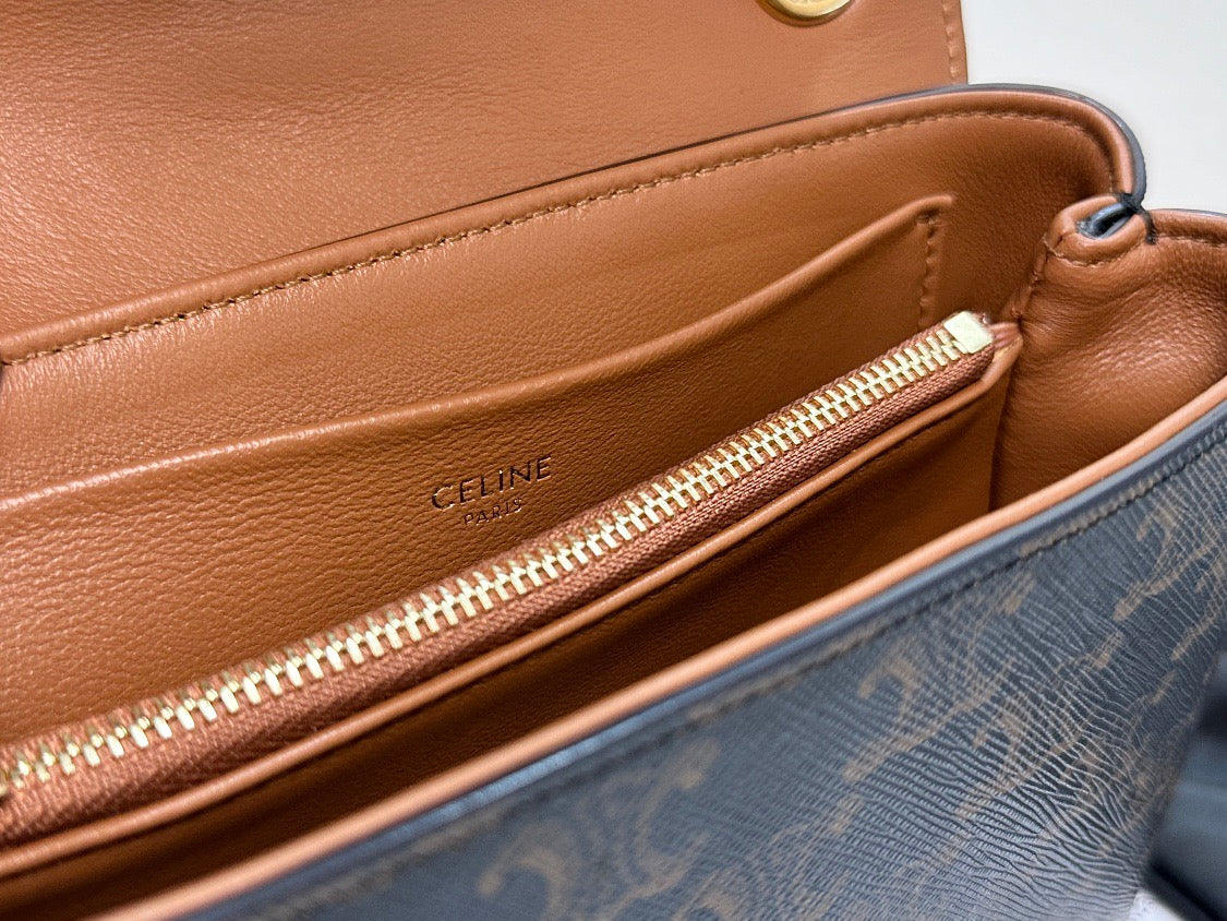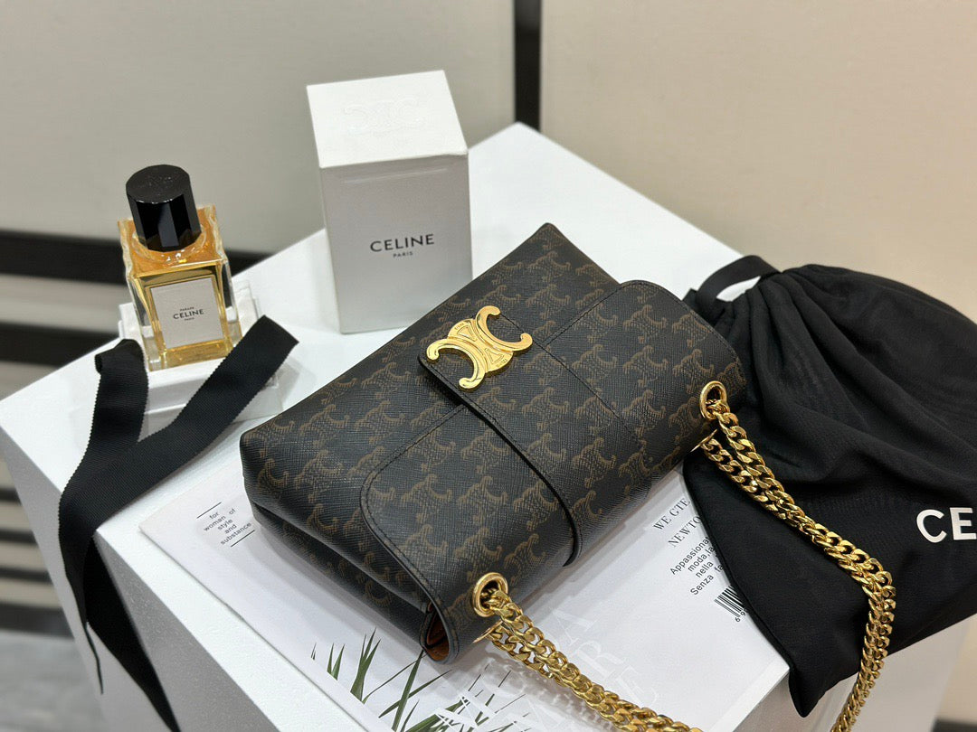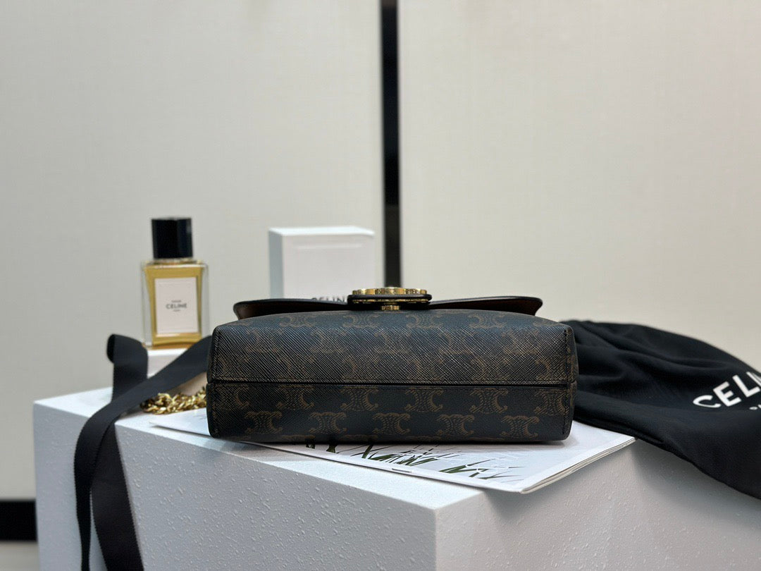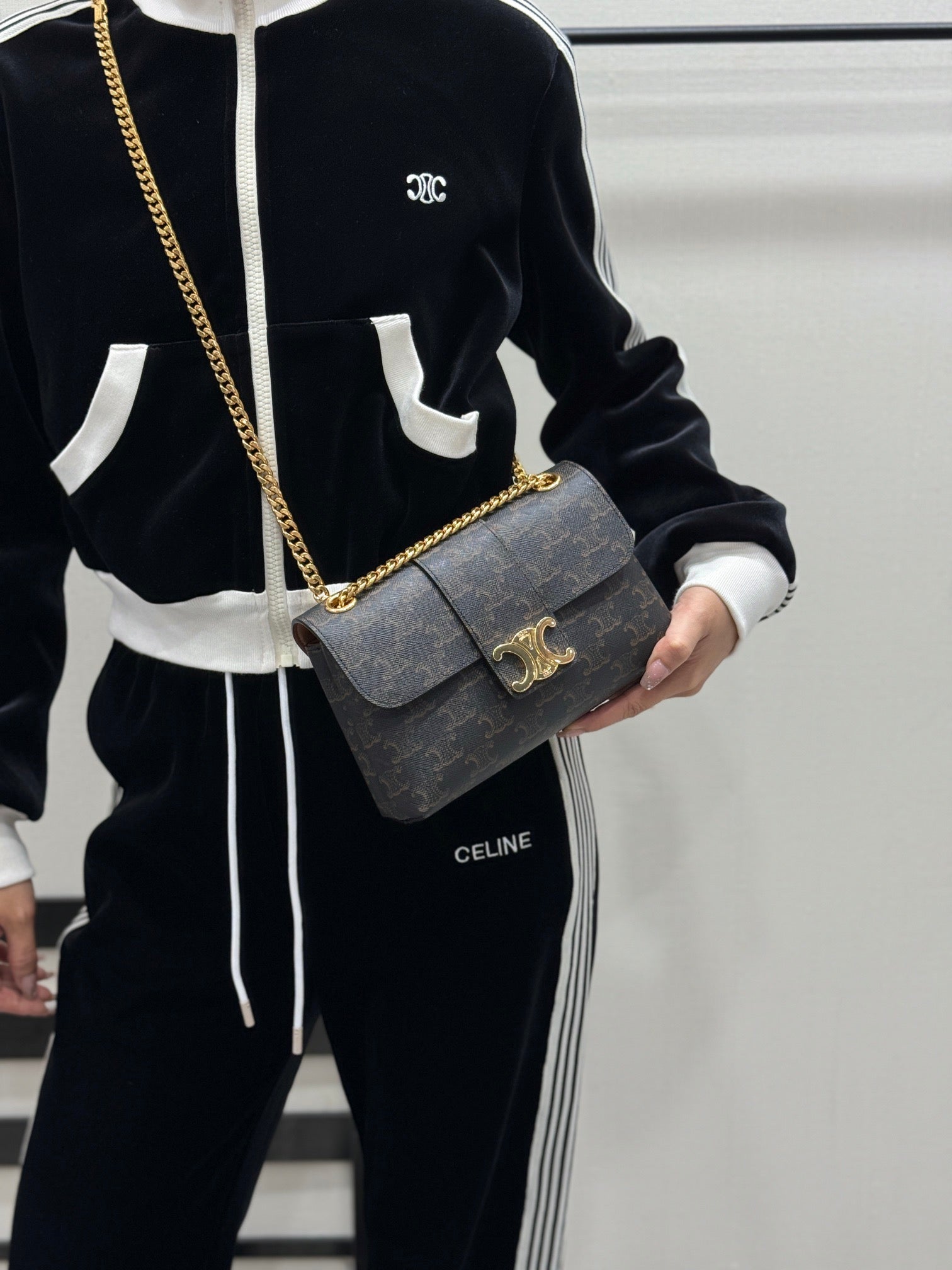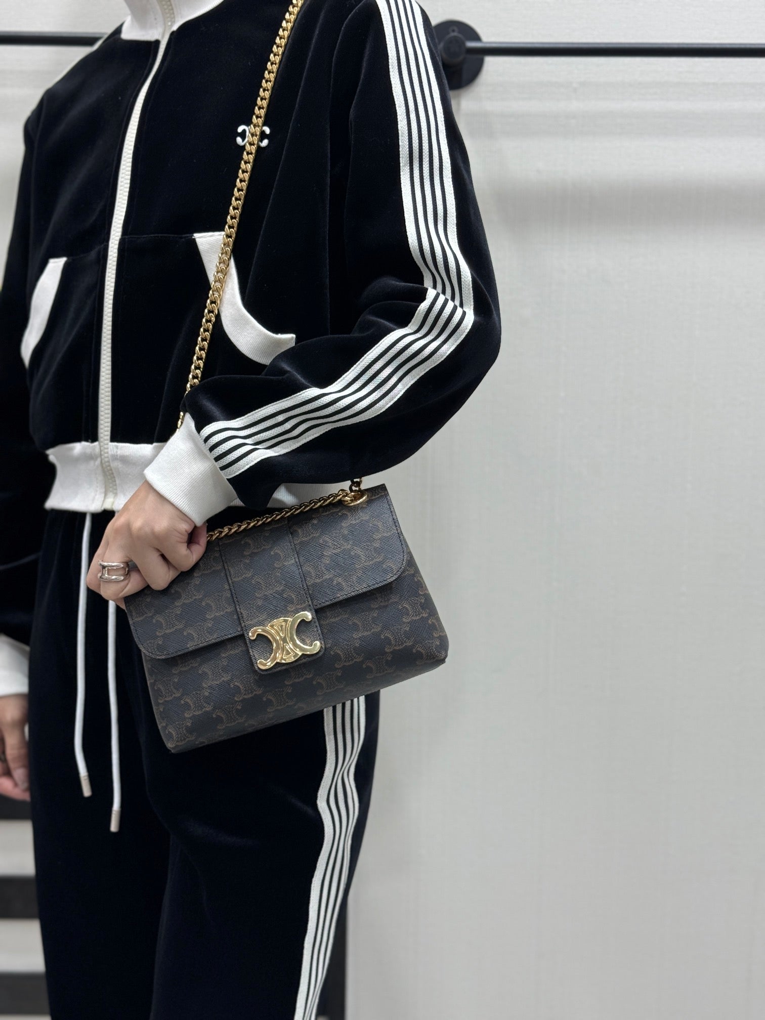 이 제품은 클래식한 셀린느 트라이엄프 모노그램 캔버스를 바탕으로, 천연 가죽 트리밍과 골드 피니시 체인 스트랩이 더해진 것이 특징입니다. 셀린느의 시그니처인 트라이엄프 금속 클로저는 정제된 고급스러움을 더하며, 직사각형의 컴팩트한 실루엣은 어떤 스타일에도 조화롭게 어울립니다.