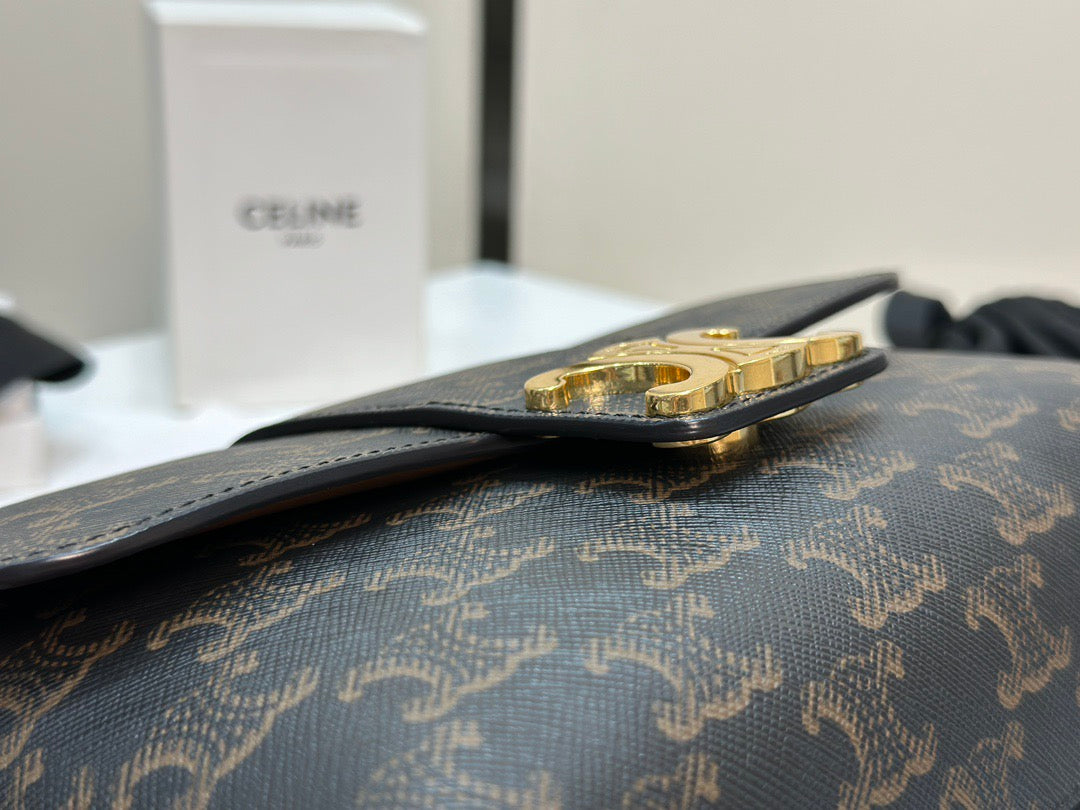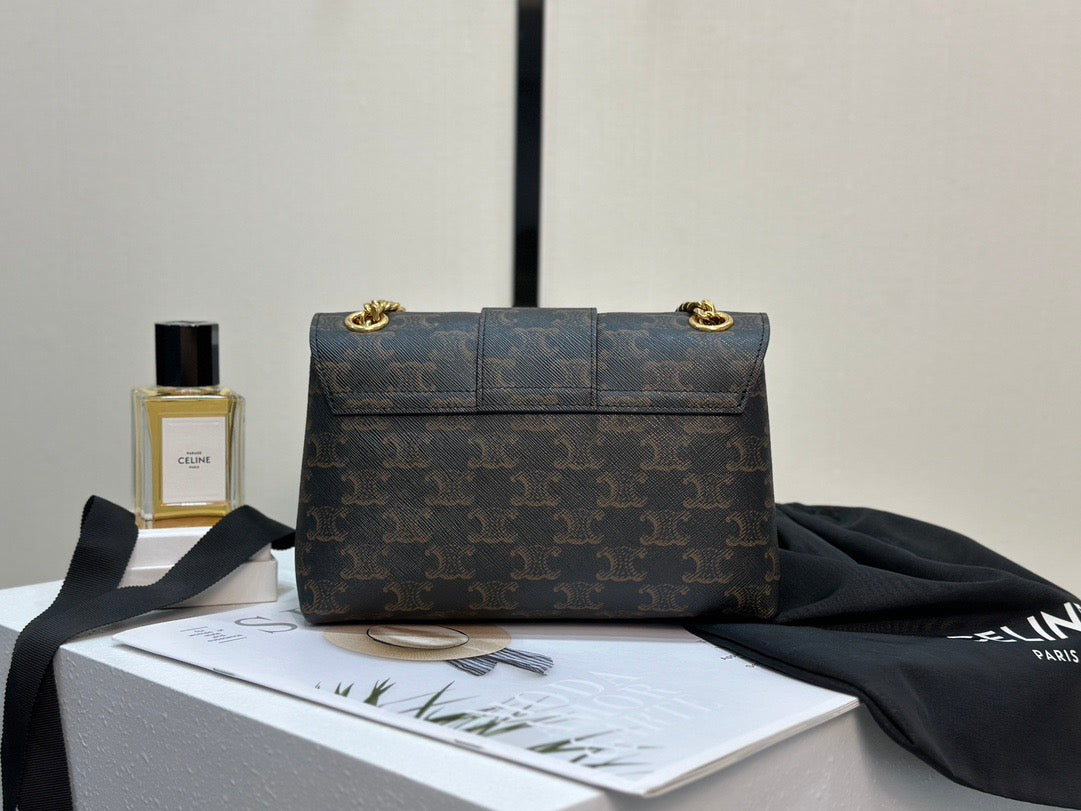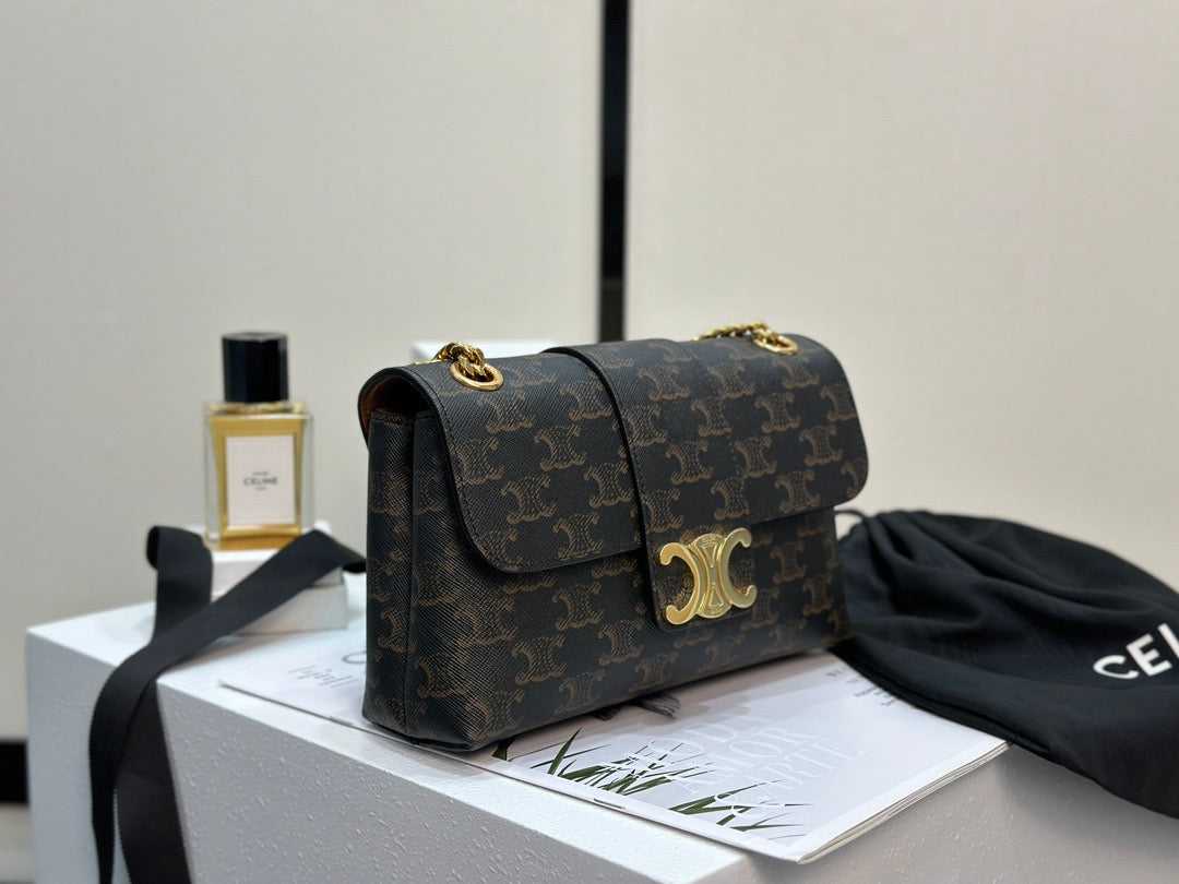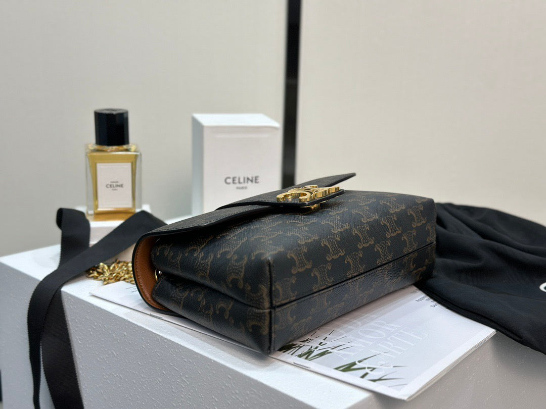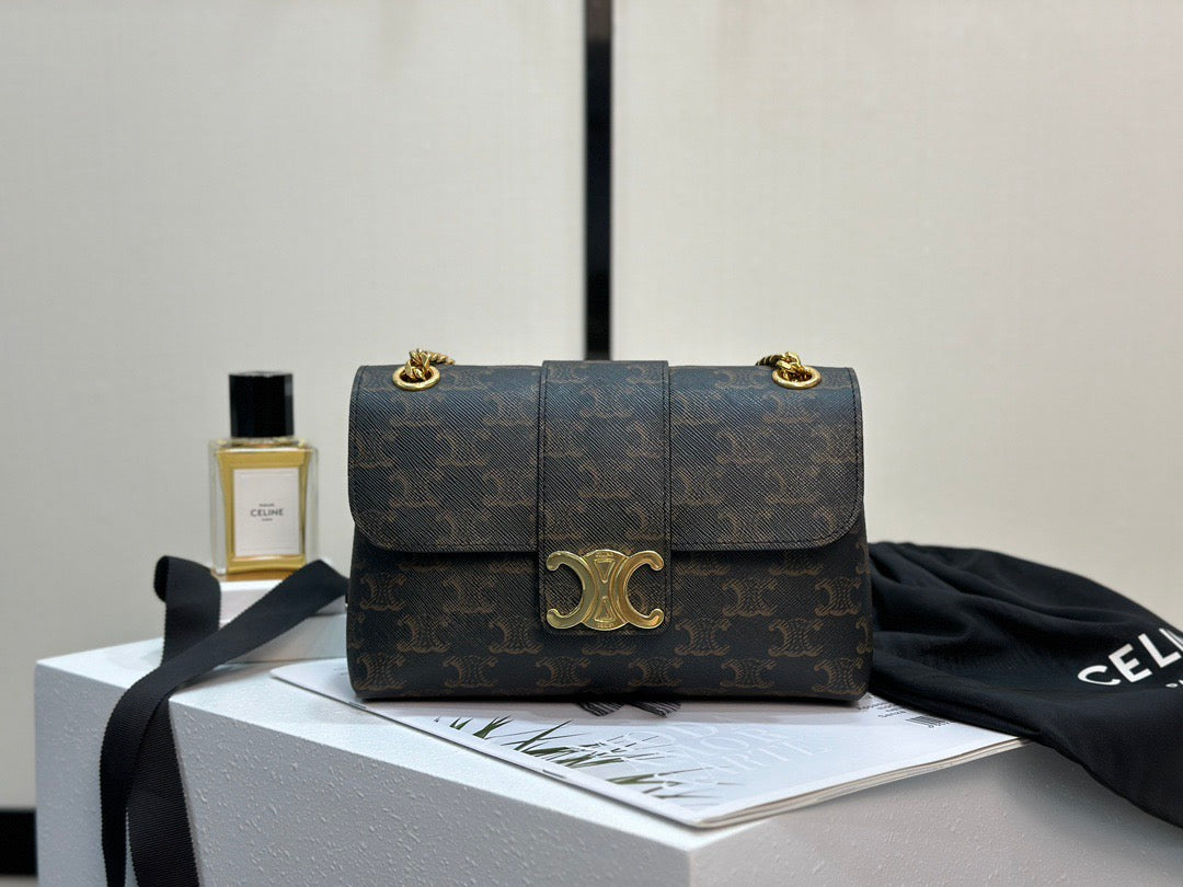이 제품은 클래식한 셀린느 트라이엄프 모노그램 캔버스를 바탕으로, 천연 가죽 트리밍과 골드 피니시 체인 스트랩이 더해진 것이 특징입니다. 셀린느의 시그니처인 트라이엄프 금속 클로저는 정제된 고급스러움을 더하며, 직사각형의 컴팩트한 실루엣은 어떤 스타일에도 조화롭게 어울립니다.
