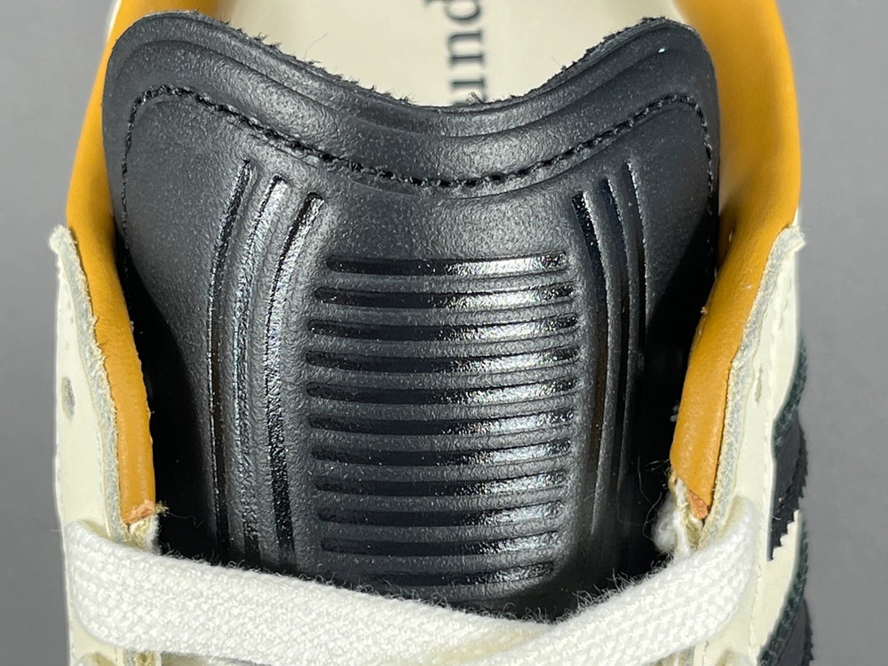 고급 오프 화이트 가죽, 라이트 그레이 스웨이드, 블랙 스트라이프, 금박 JJJJound 로고, 독일제 생산 등 협업의 정체성과 품질을 모두 갖춘 것이 특징입니다.