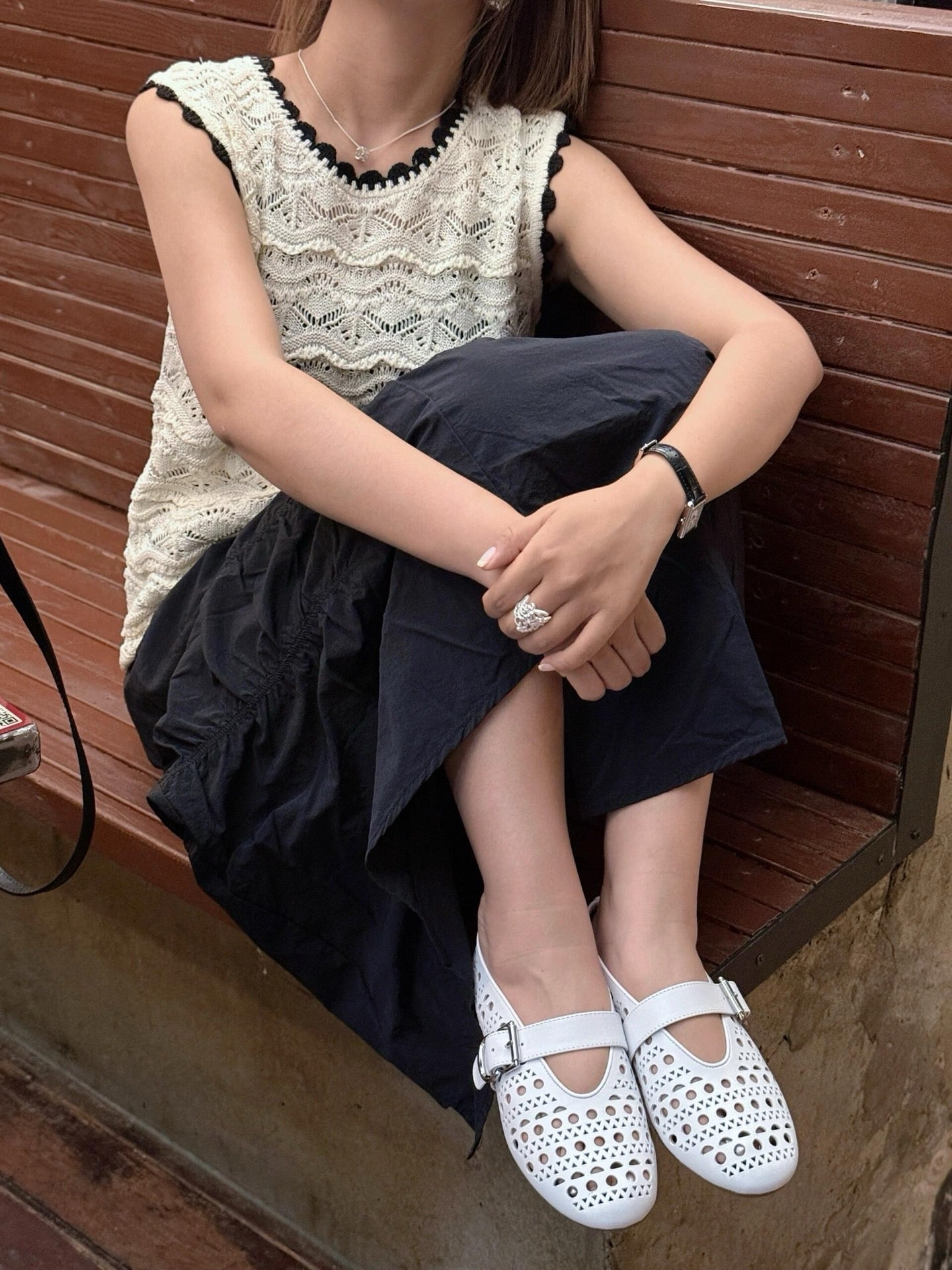 알라이아 비엔 발레 플랫은 심플한 원피스, 오피스룩, 데님 팬츠 등 다양한 착장에 잘 어울리며, 포인트 아이템으로 스타일링의 완성도를 높여줍니다.