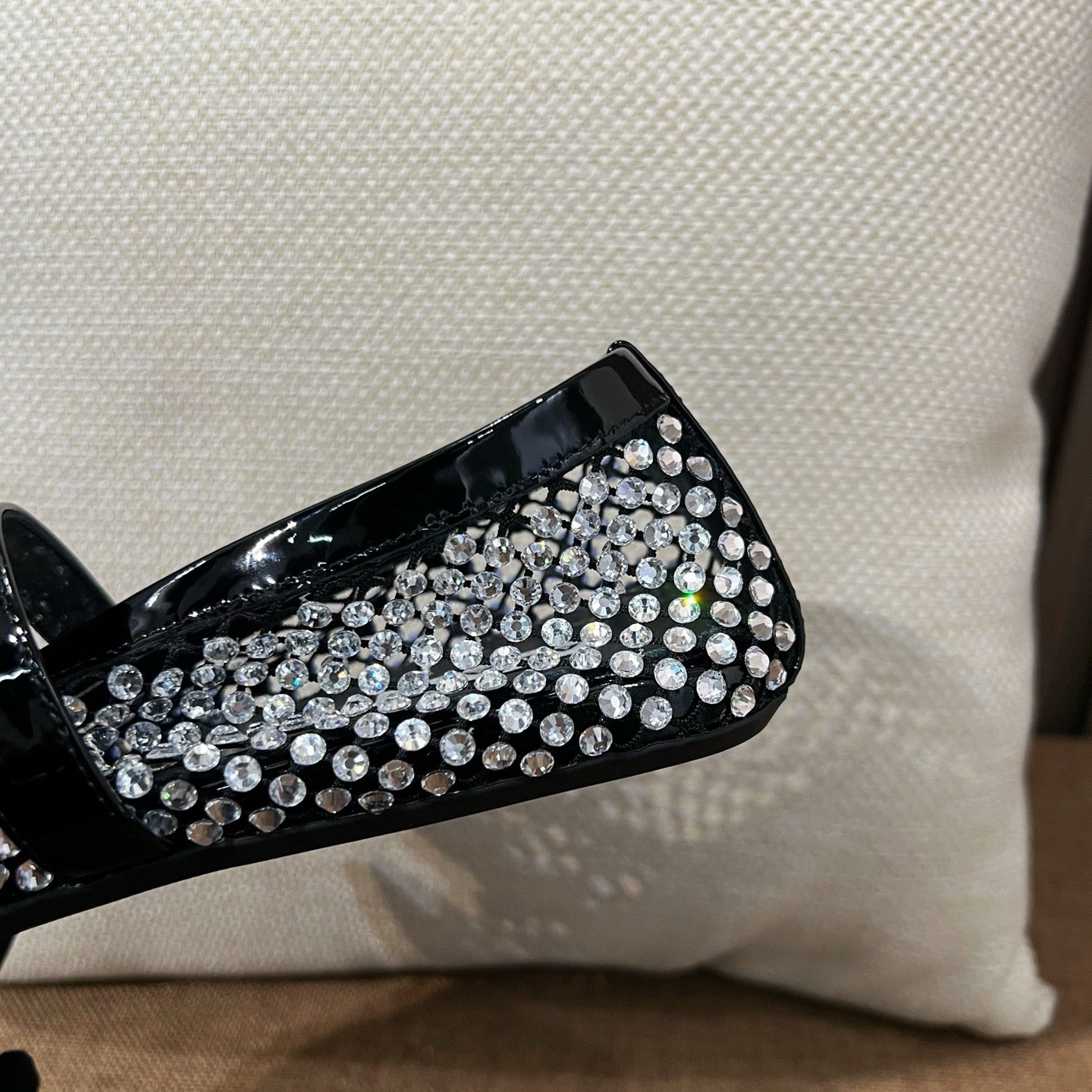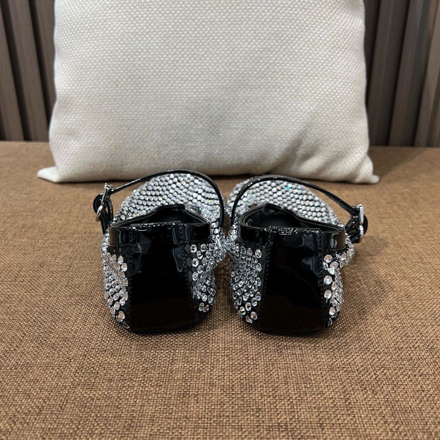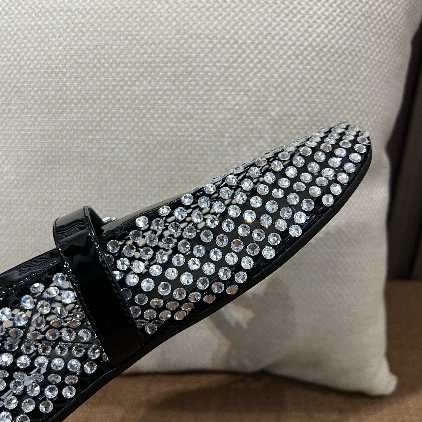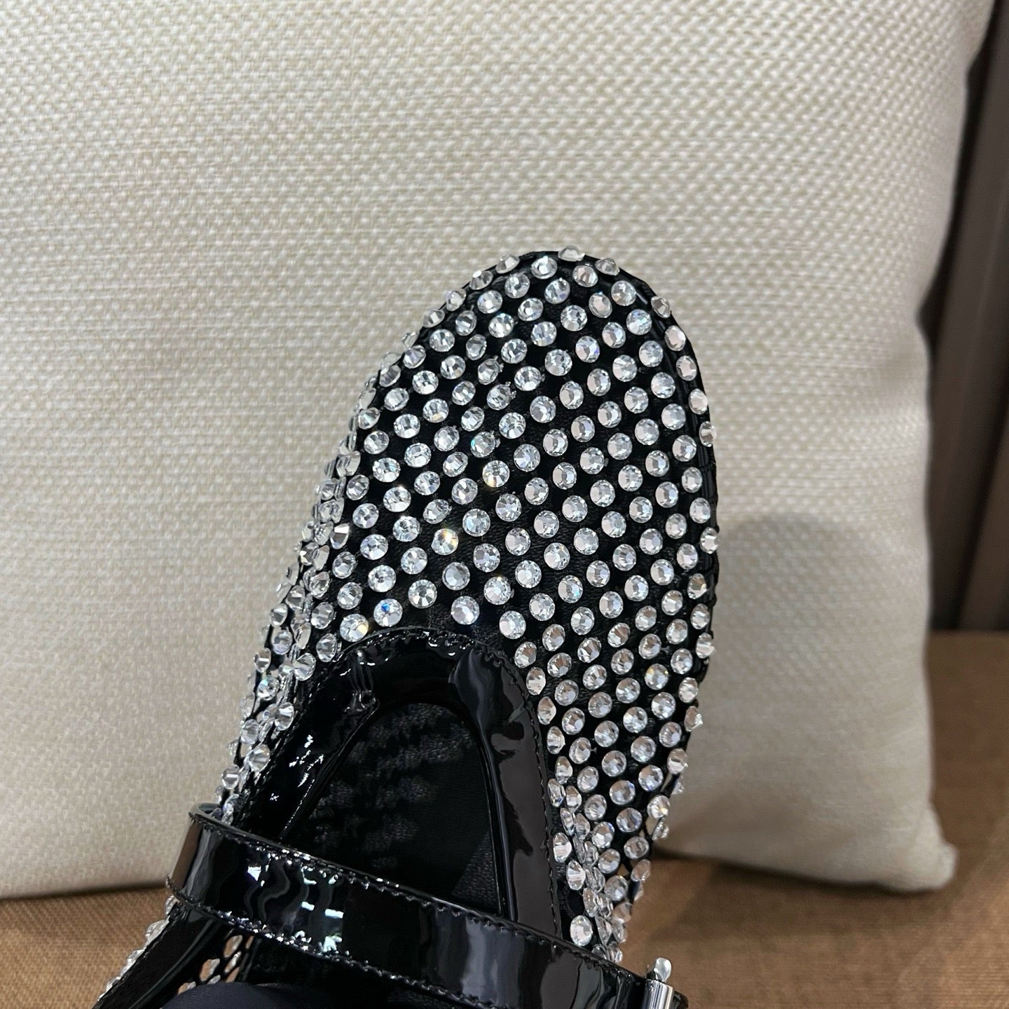 이 슈즈는 투명한 피시넷 메쉬 위에 정교하게 세팅된 크리스탈 장식이 특징입니다. 라운드 토 실루엣과 발목을 감싸는 얇은 스트랩 버클은 클래식한 발레리나 스타일에 현대적인 감성을 더해줍니다. 페이턴트 가죽 트리밍이 전체적인 룩을 마무리해 고급스러운 분위기를 완성합니다.