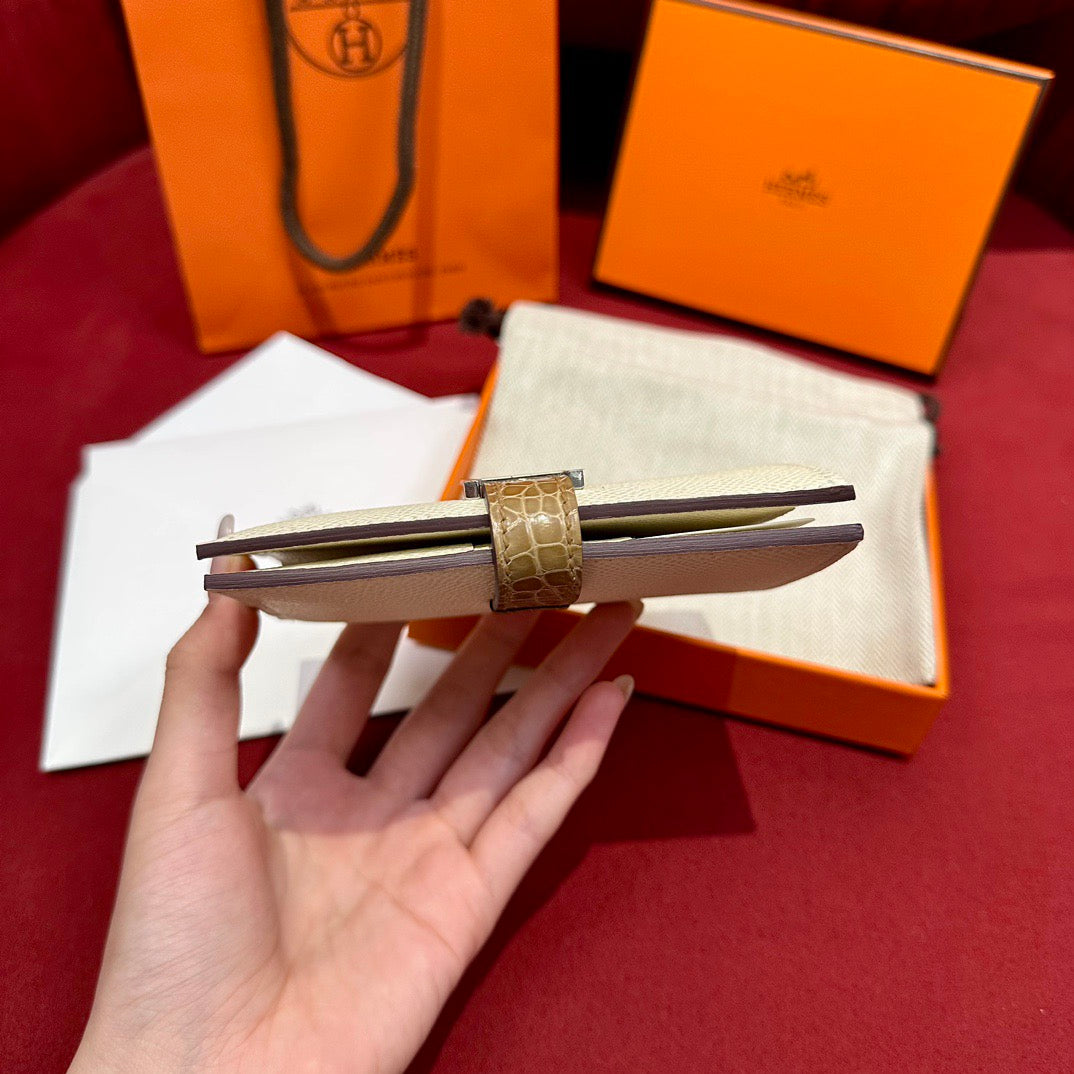 에르메스 베안 컴팩트 지갑 터치(Hermès Béarn Compact Wallet Touch)는 클래식한 베안 디자인에 엑조틱 가죽 디테일이 가미된 특별한 버전으로, 토고(Togo) 가죽과 크로커다일 또는 리자드 소재가 조화를 이루는 미니 럭셔리 지갑입니다. H 모양의 버클이나 플랩 일부에 엑조틱 가죽이 적용되어 시각적인 포인트를 선사합니다.