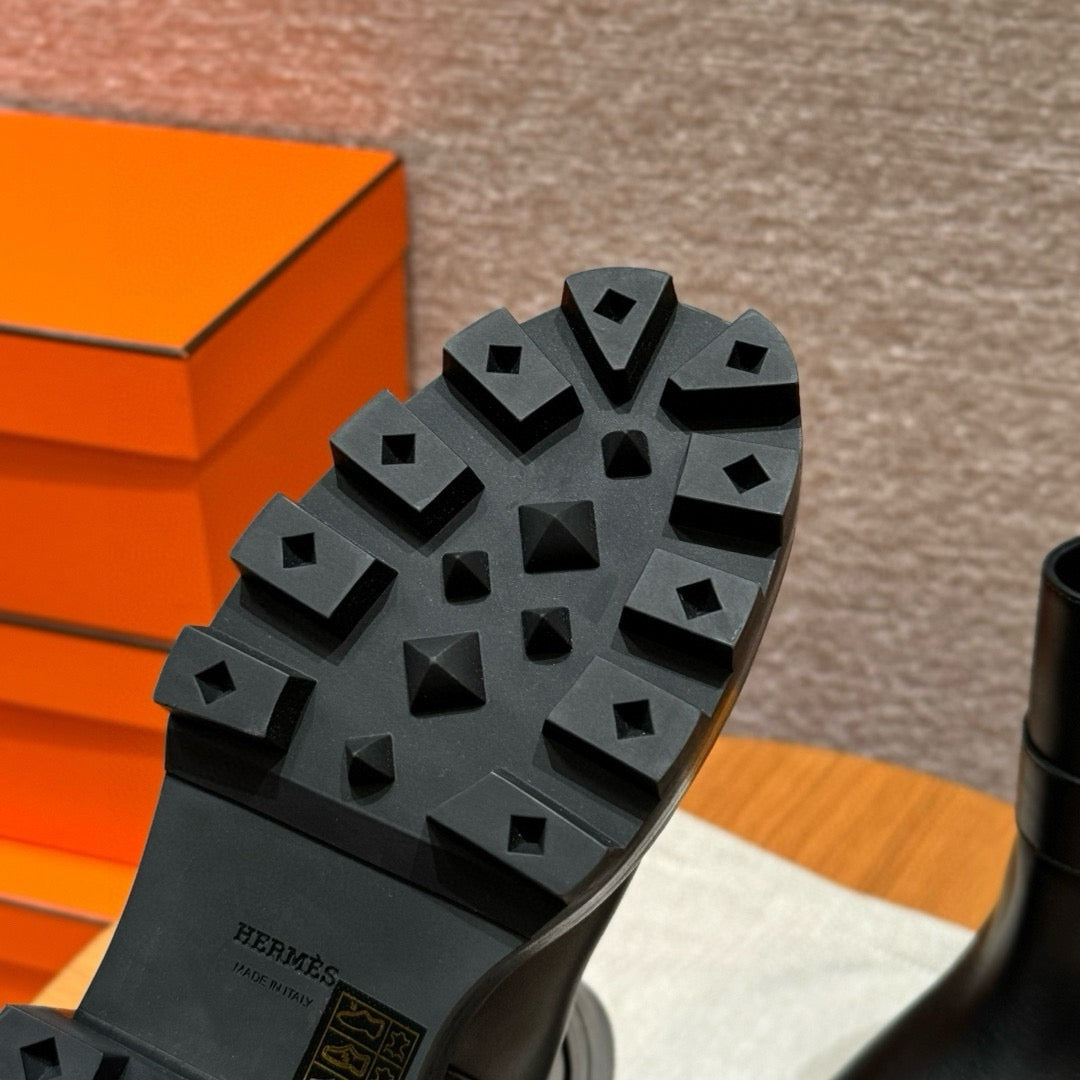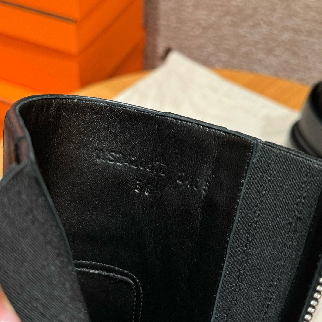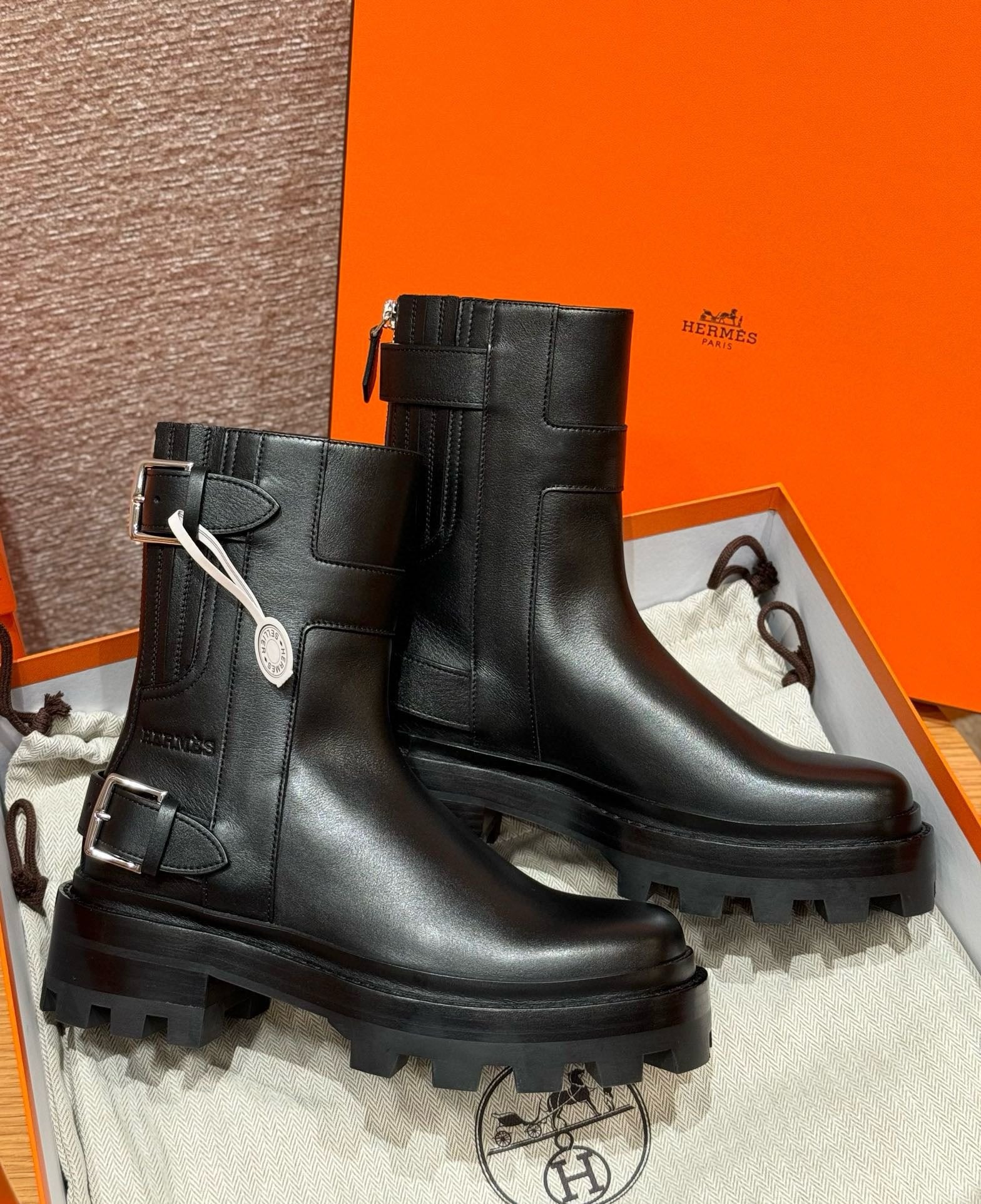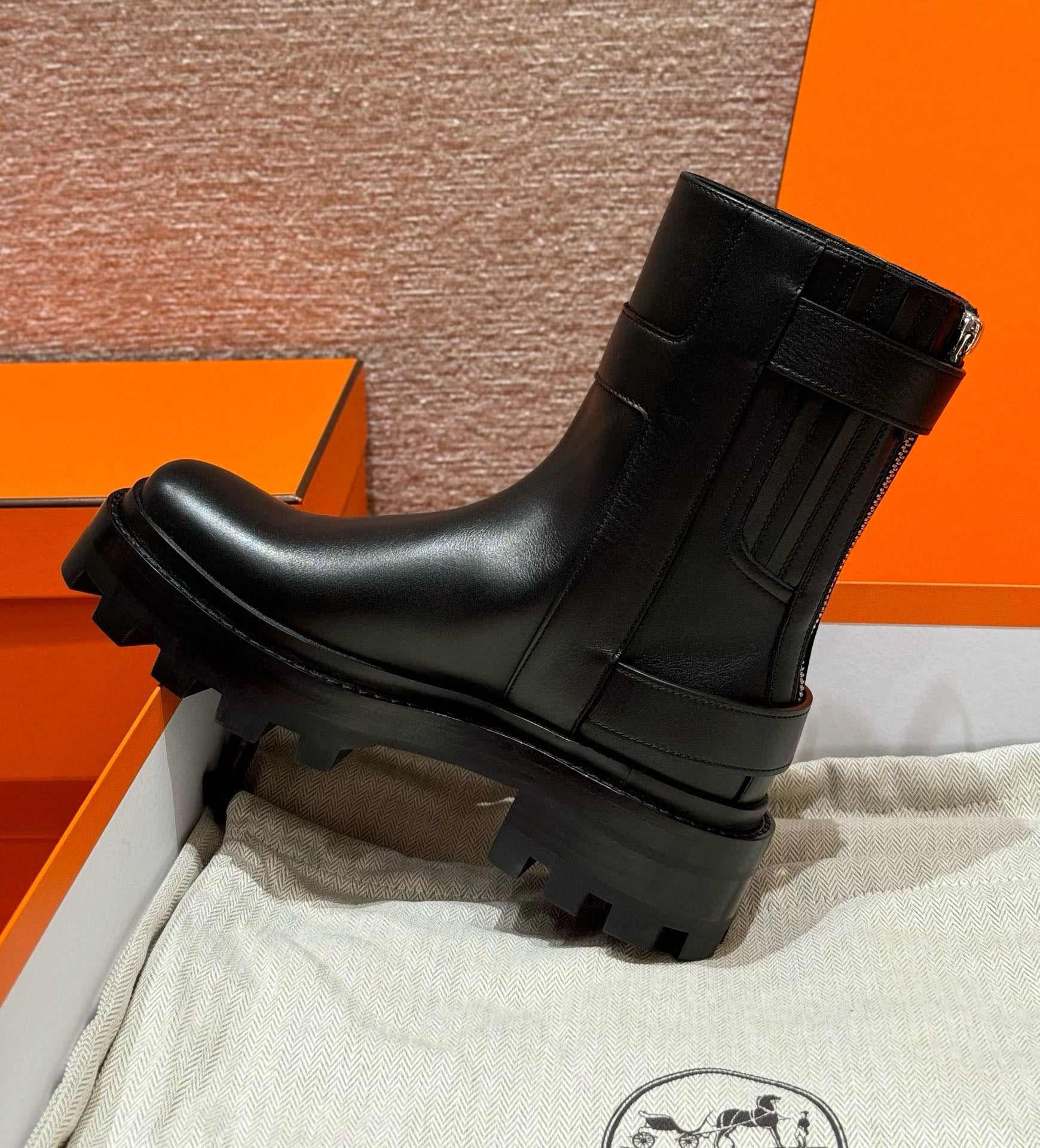 클래식한 앵클 부츠 형태에 에르메스 특유의 정교한 마감이 더해졌으며, 발목 부분의 메탈 잠금장식이나 버클 디테일이 고급스러운 포인트가 됩니다.