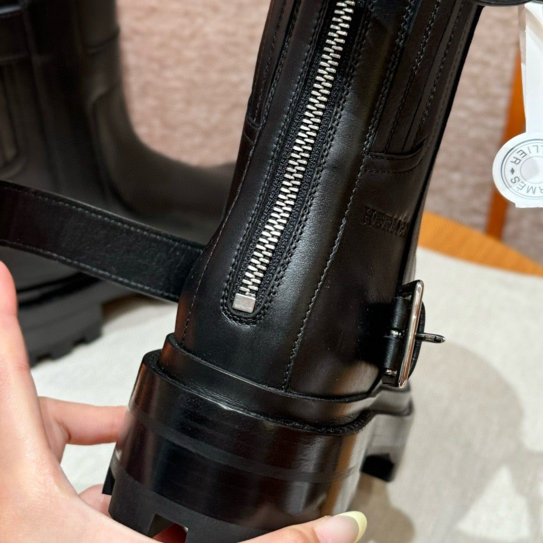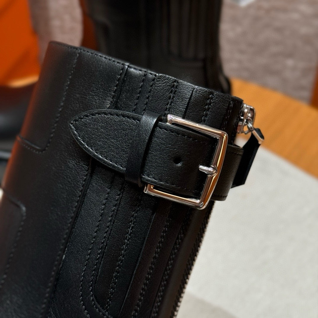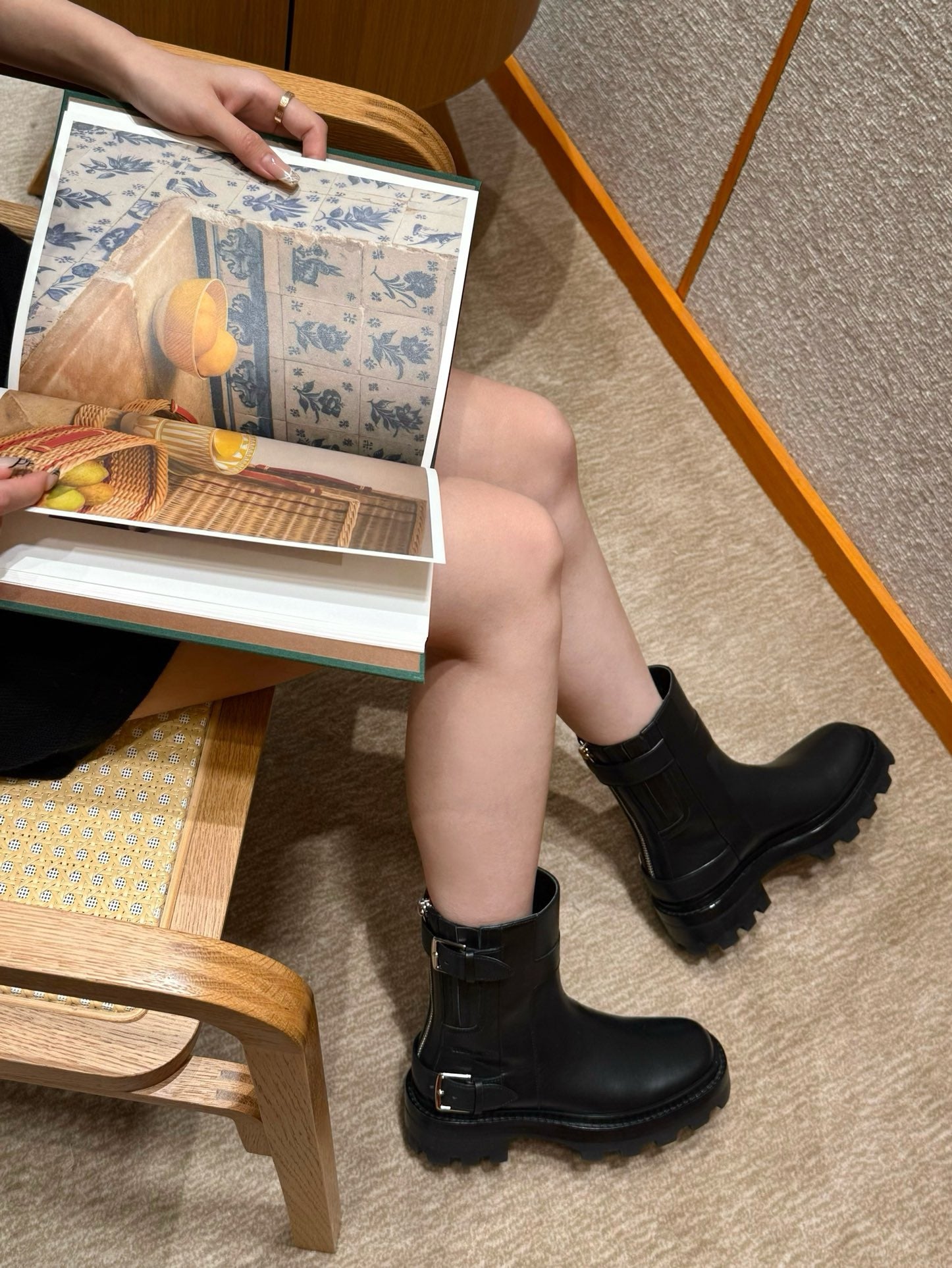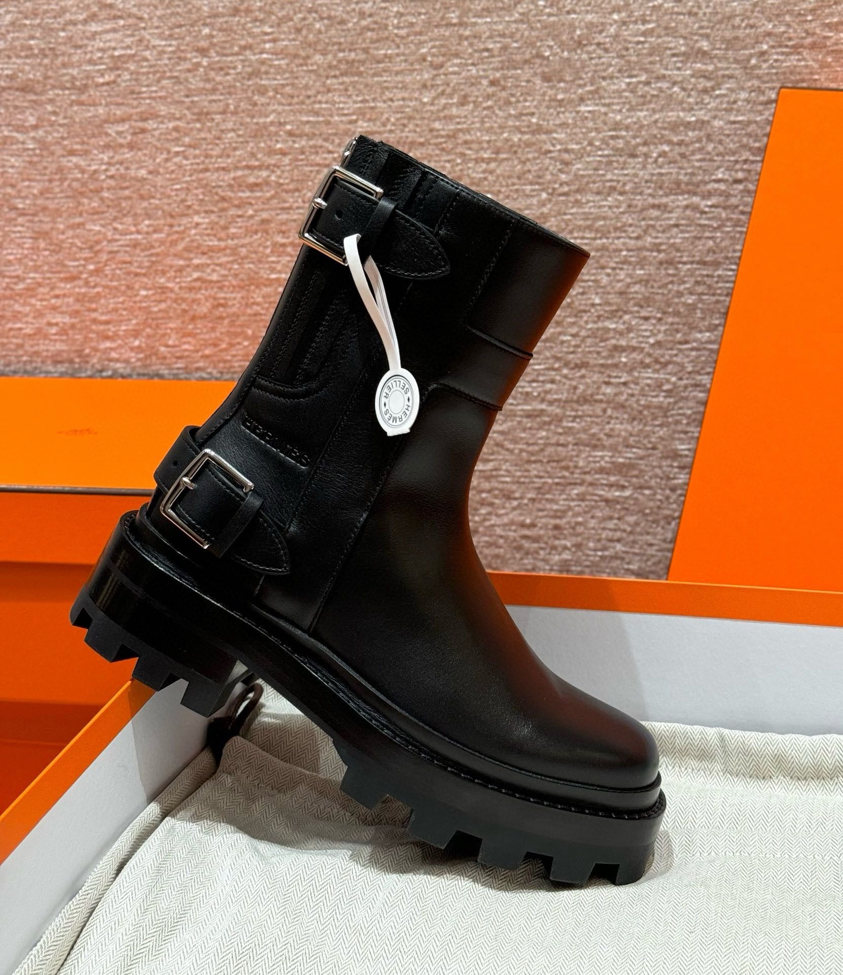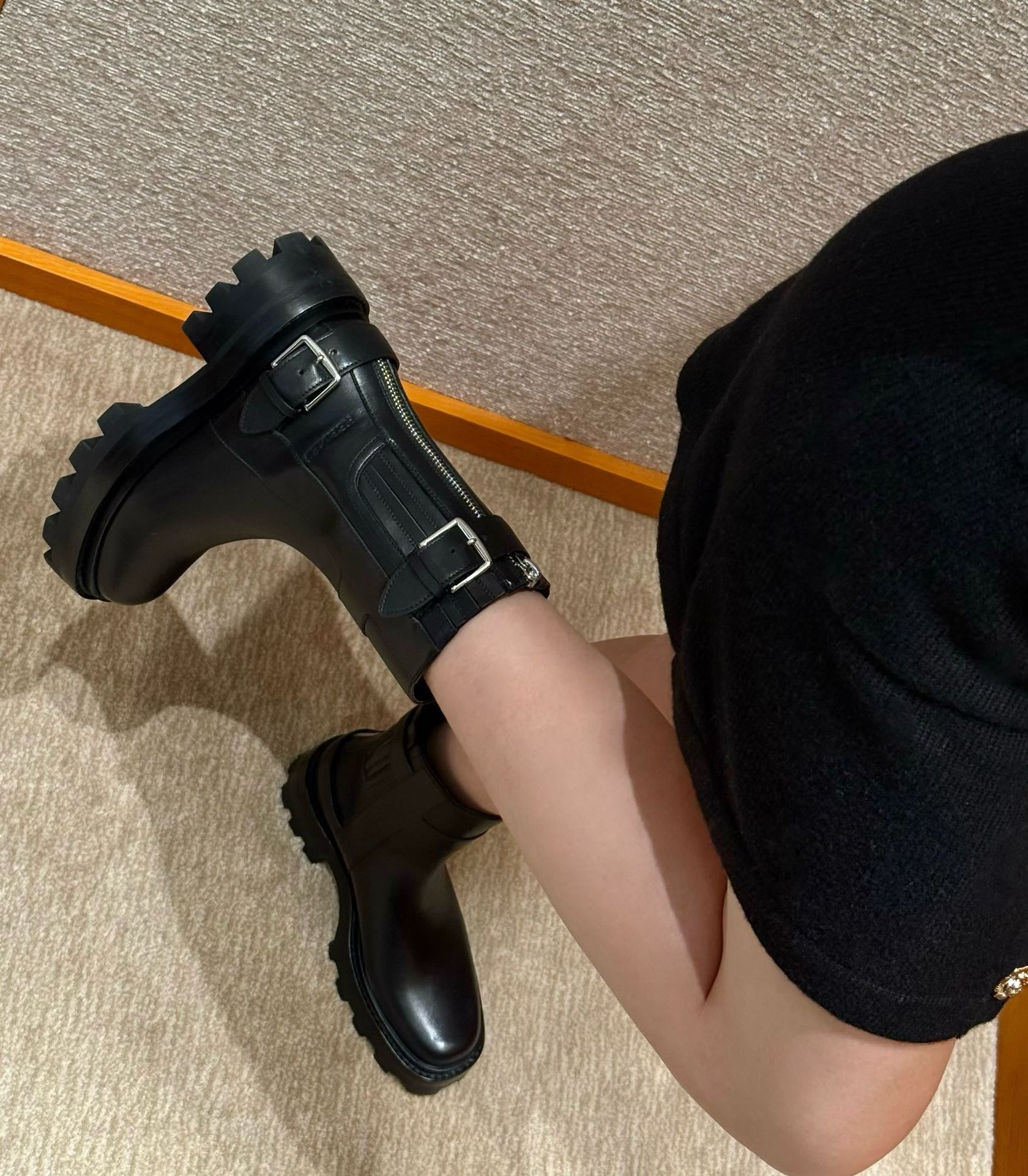 클래식한 앵클 부츠 형태에 에르메스 특유의 정교한 마감이 더해졌으며, 발목 부분의 메탈 잠금장식이나 버클 디테일이 고급스러운 포인트가 됩니다.