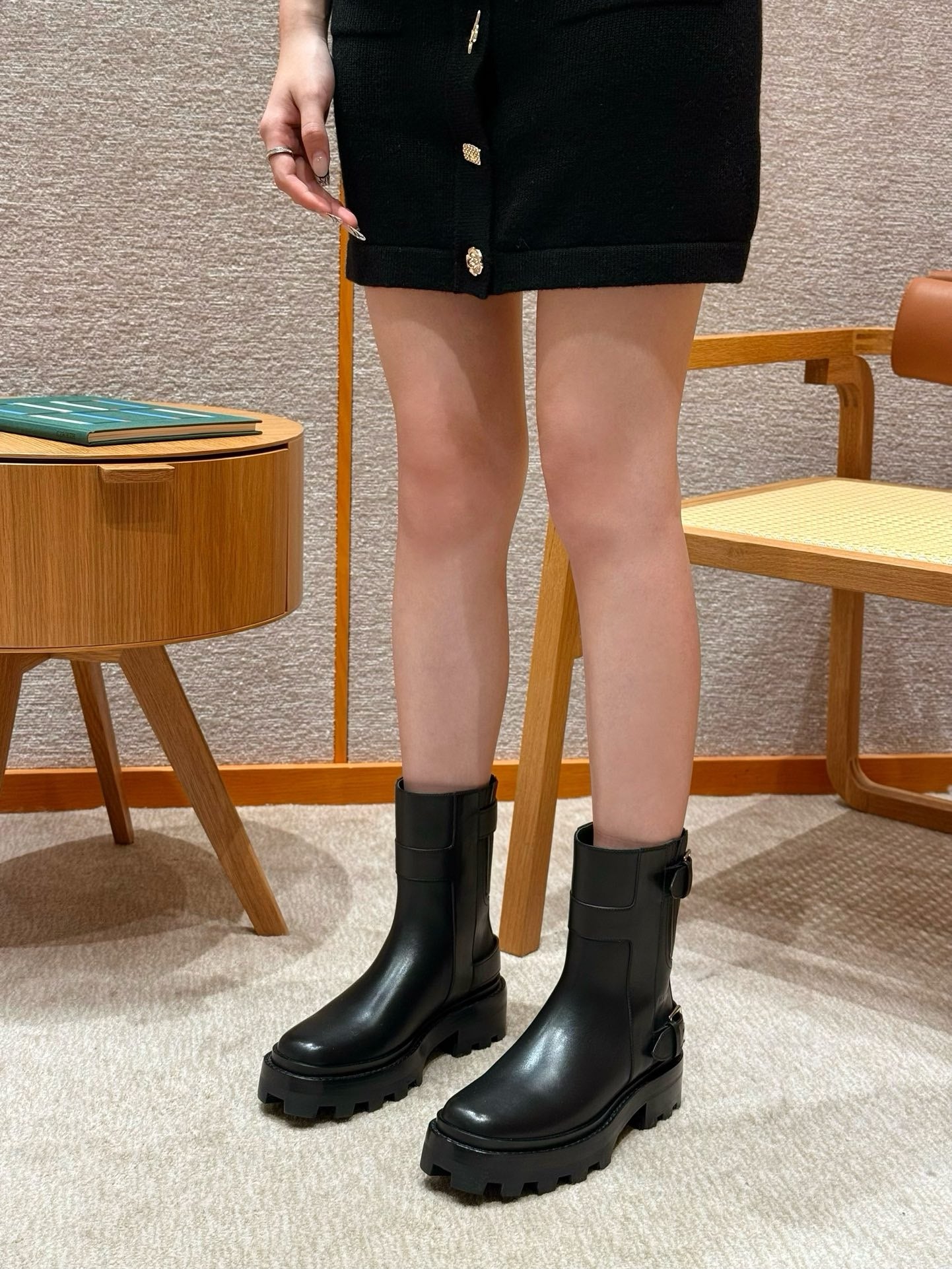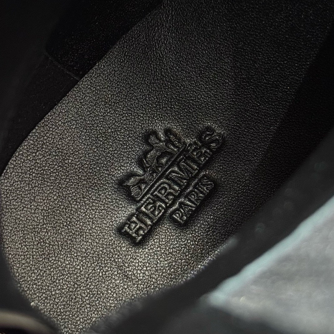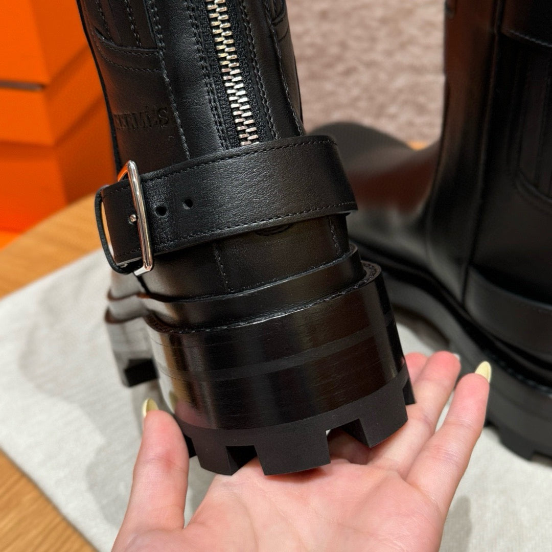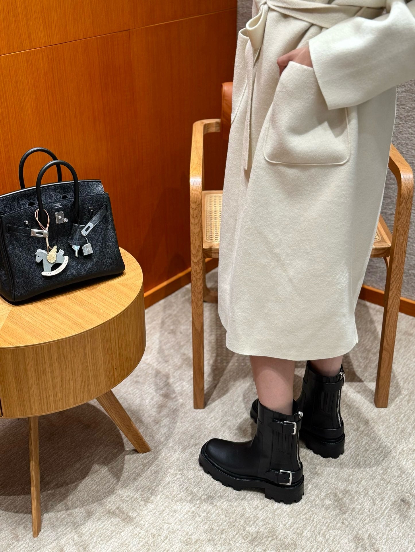 클래식한 앵클 부츠 형태에 에르메스 특유의 정교한 마감이 더해졌으며, 발목 부분의 메탈 잠금장식이나 버클 디테일이 고급스러운 포인트가 됩니다.
