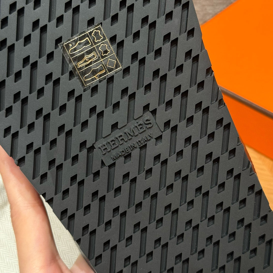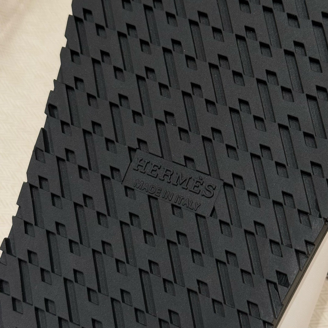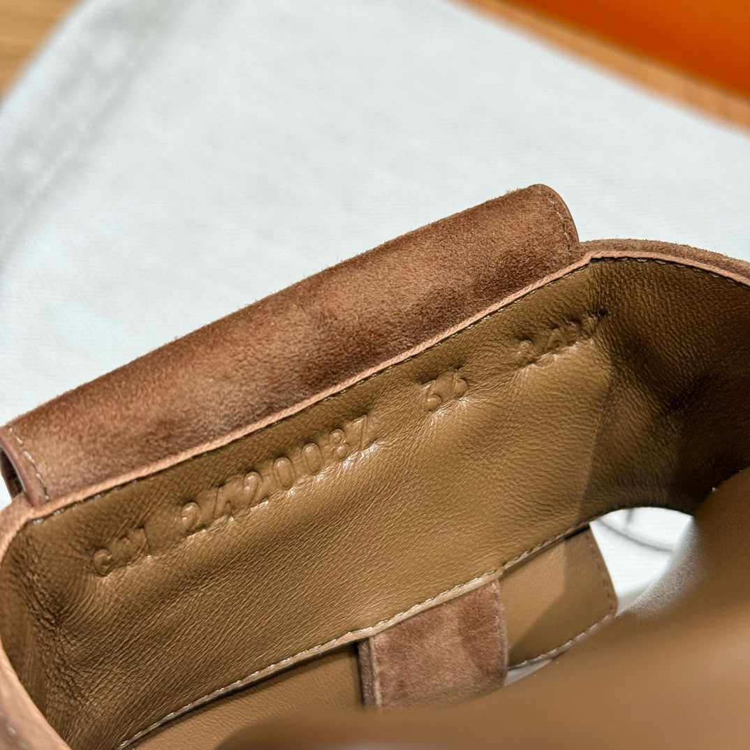 발등을 감싸는 슬림한 가죽 스트랩과 발목 스트랩이 안정적인 착화를 제공하며, 에르메스 특유의 절제된 디자인이 세련된 분위기를 연출합니다. 오픈 토 디자인으로 시원하고 여름에 적합합니다.