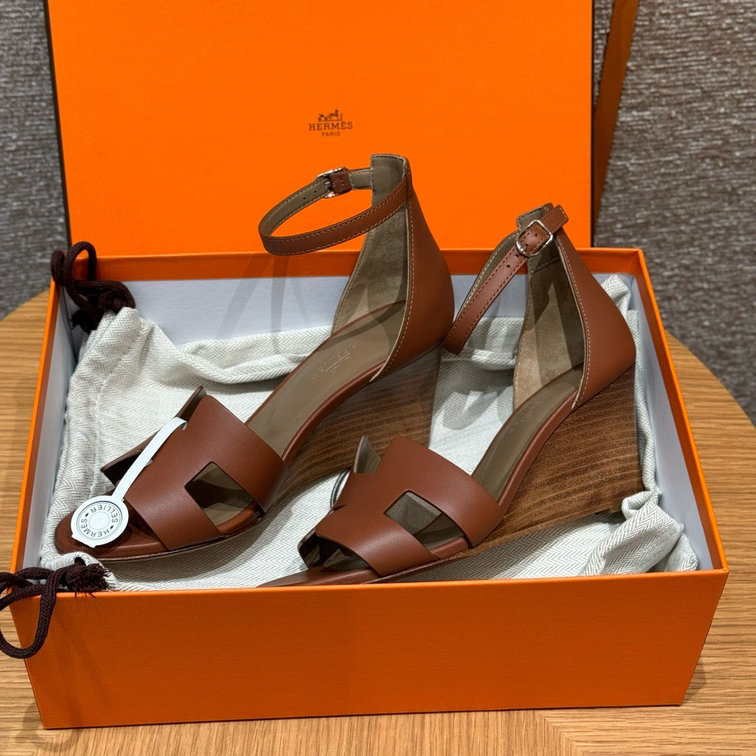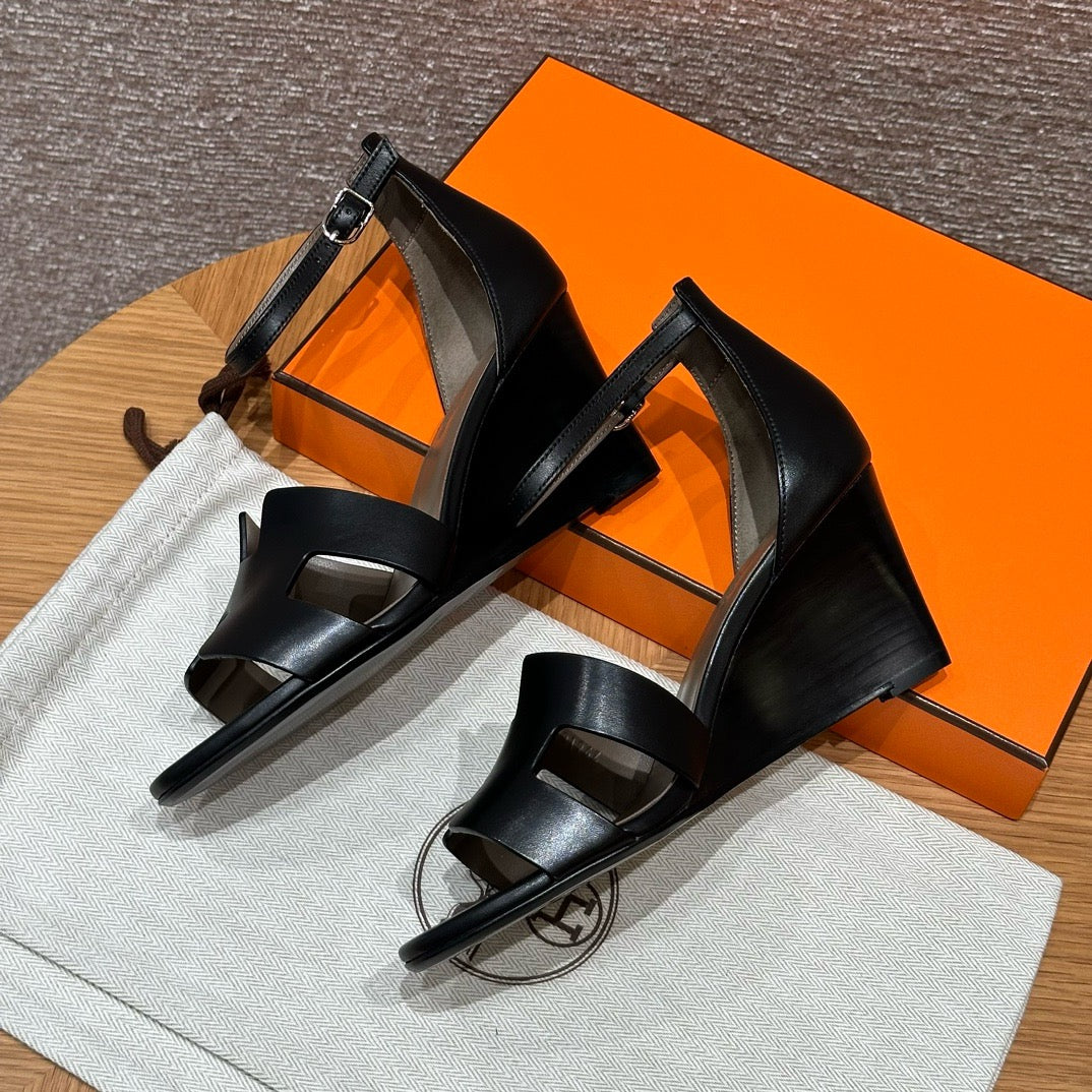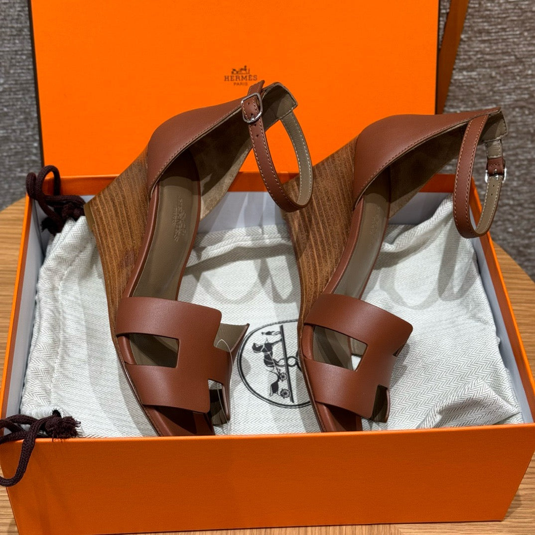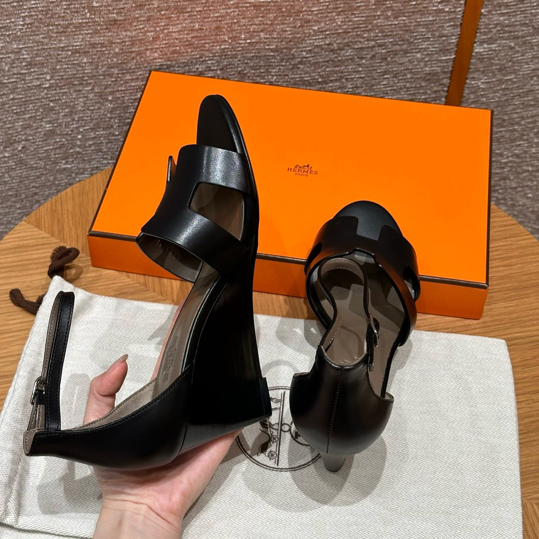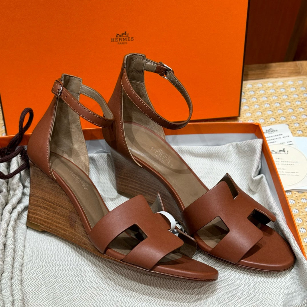 발등을 감싸는 H 모양 컷아웃 스트랩은 에르메스의 아이코닉한 디자인 요소로, 심플하면서도 브랜드 아이덴티티를 강조합니다. 웨지 힐 구조가 다리를 길어 보이게 하면서도 편안한 착화를 제공합니다.