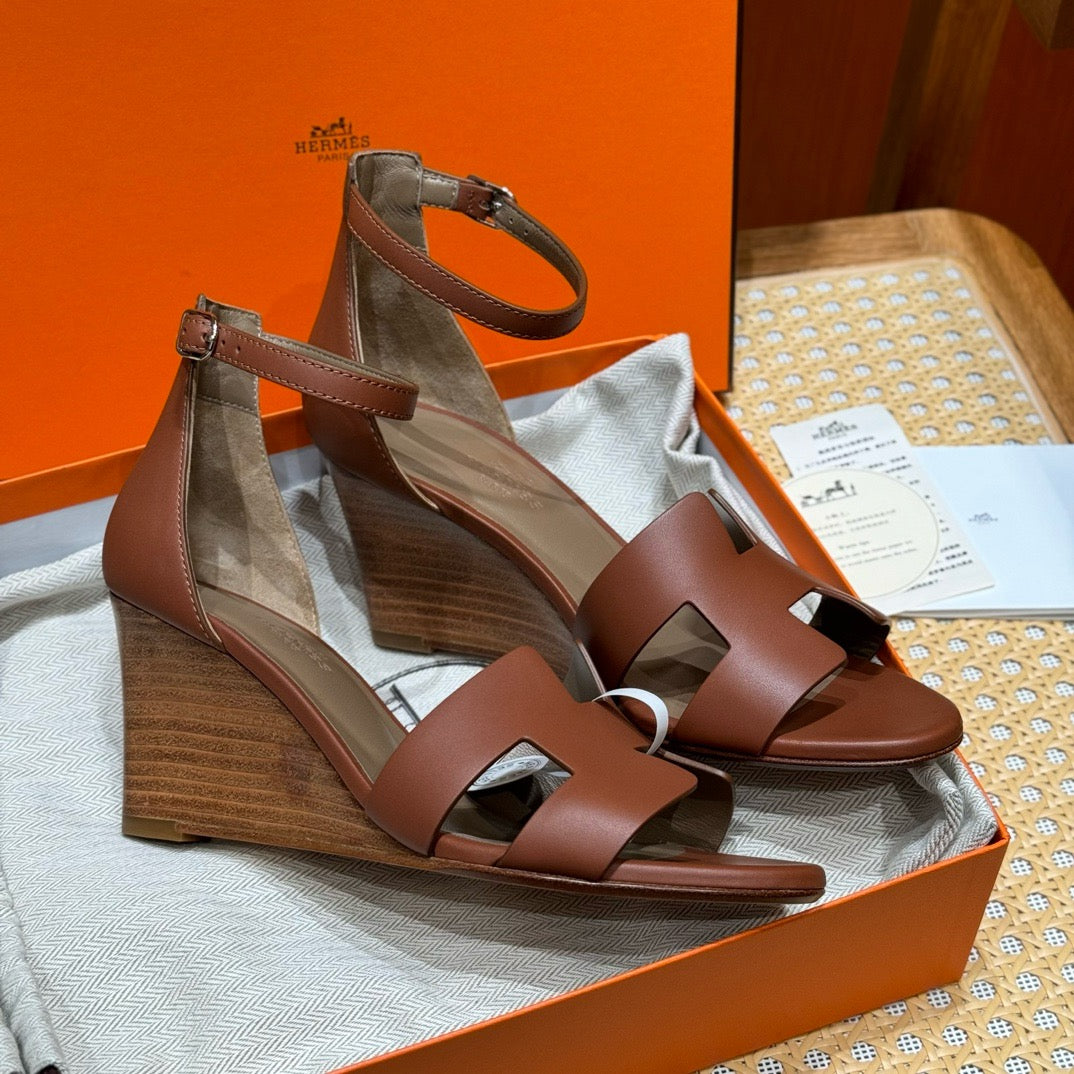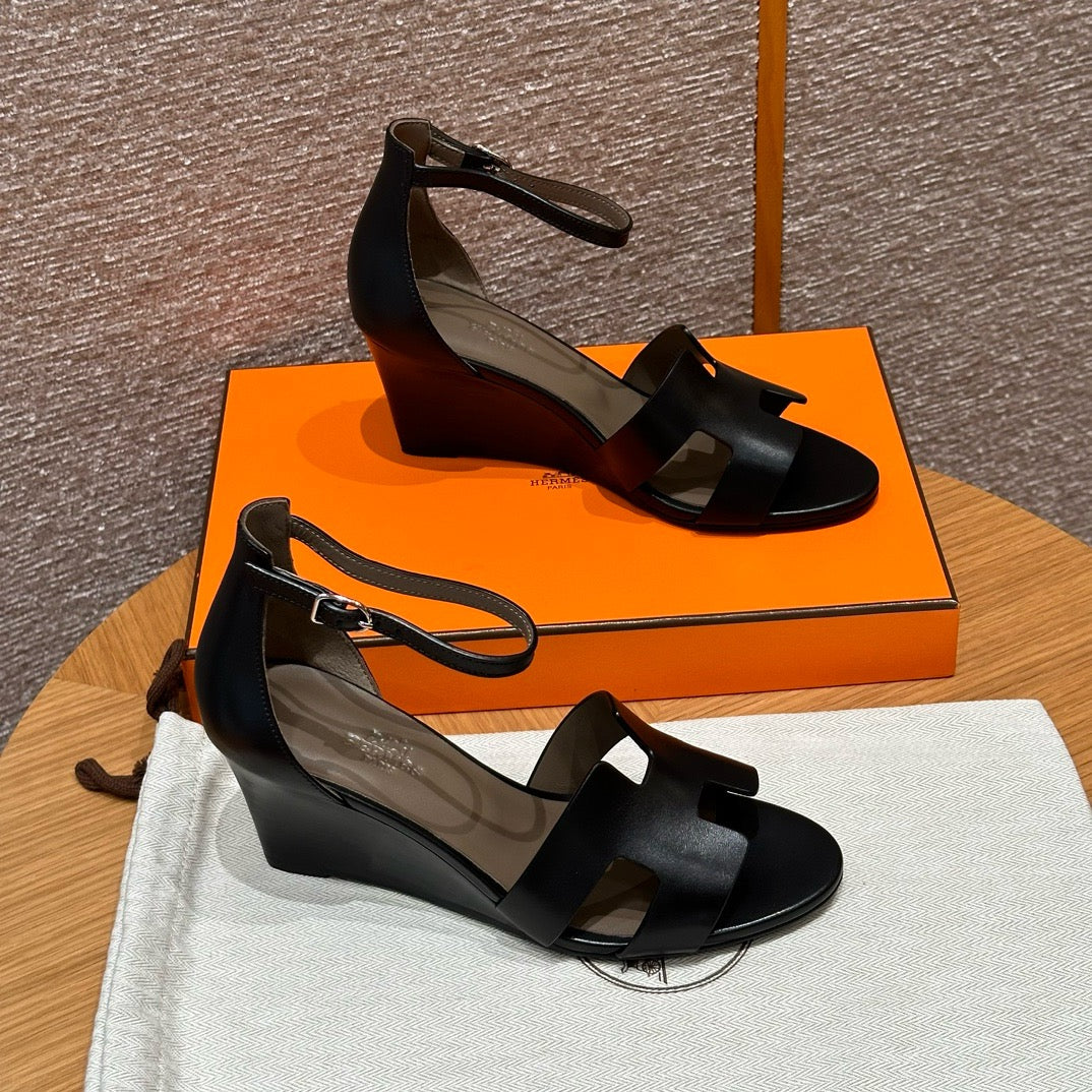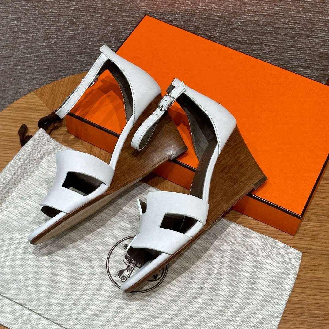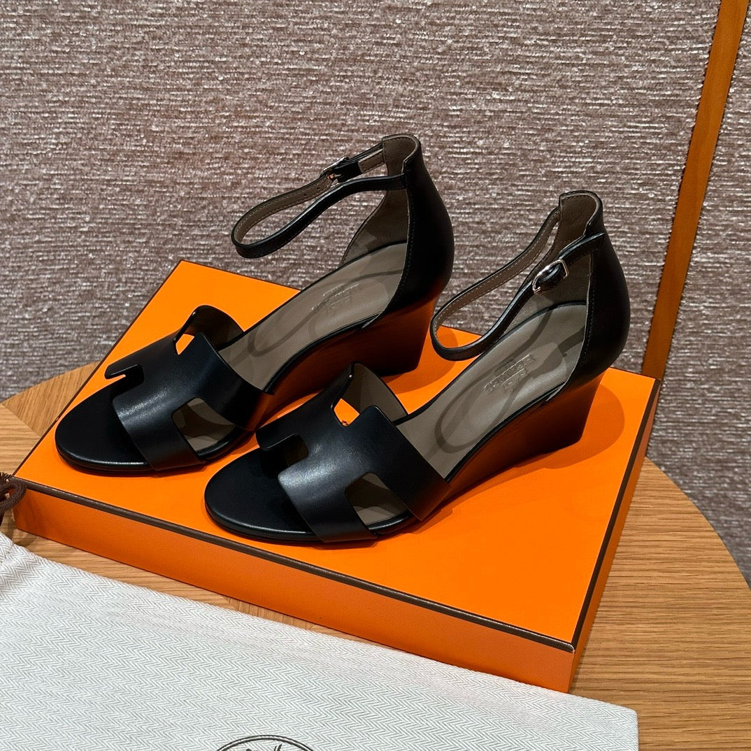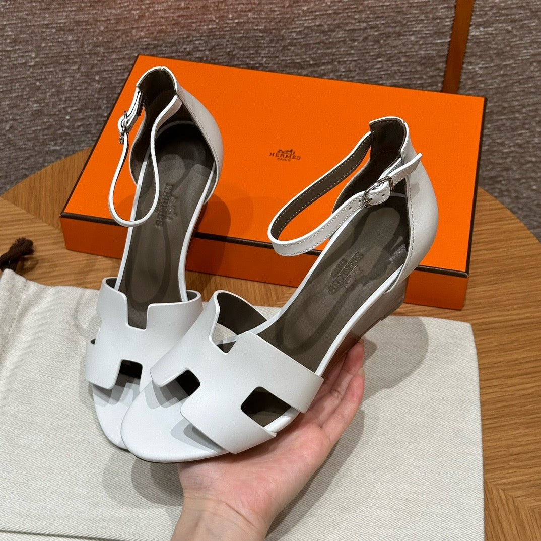 발등을 감싸는 H 모양 컷아웃 스트랩은 에르메스의 아이코닉한 디자인 요소로, 심플하면서도 브랜드 아이덴티티를 강조합니다. 웨지 힐 구조가 다리를 길어 보이게 하면서도 편안한 착화를 제공합니다.